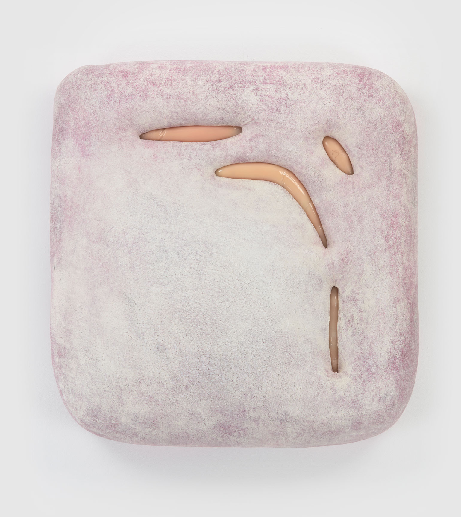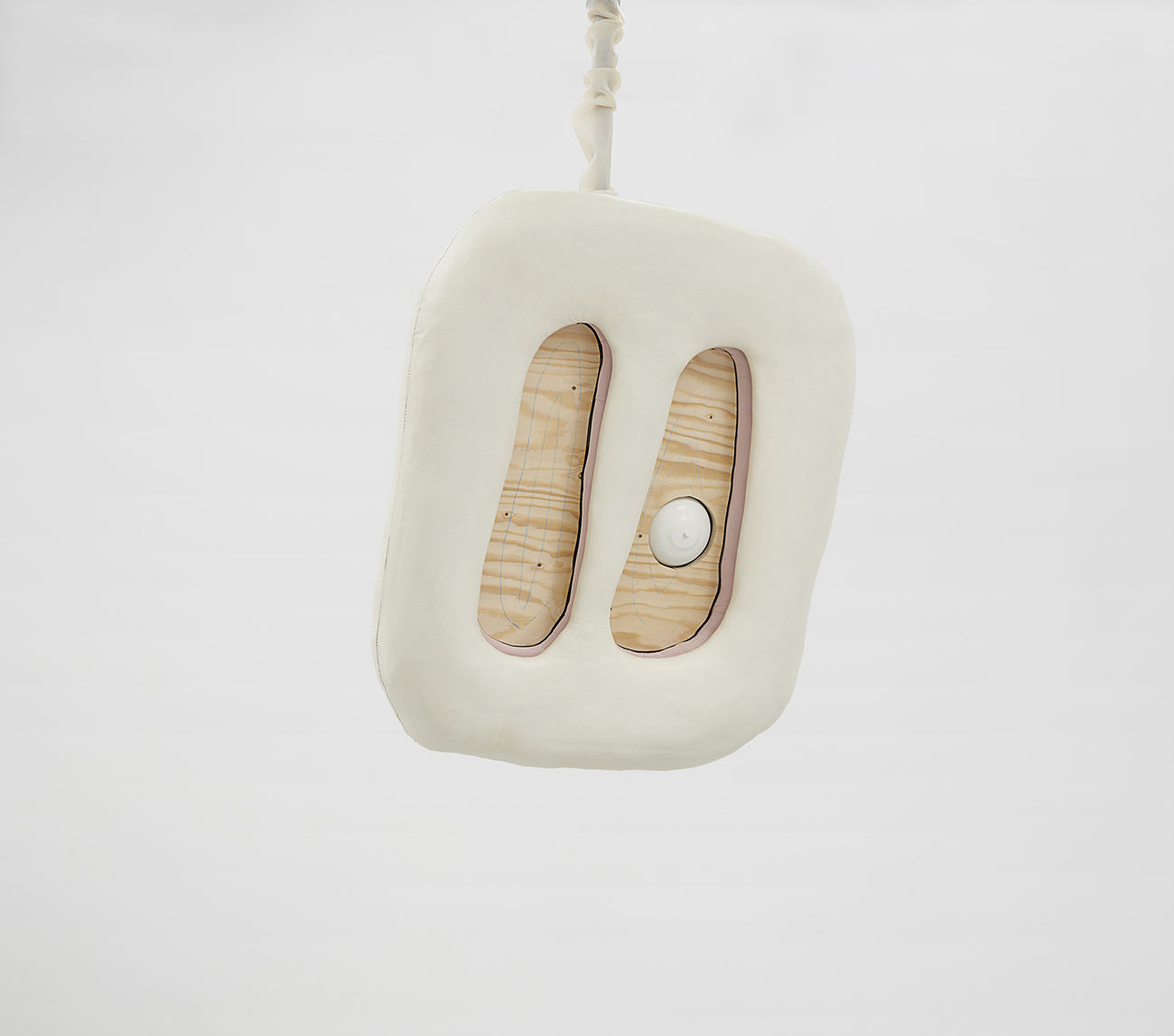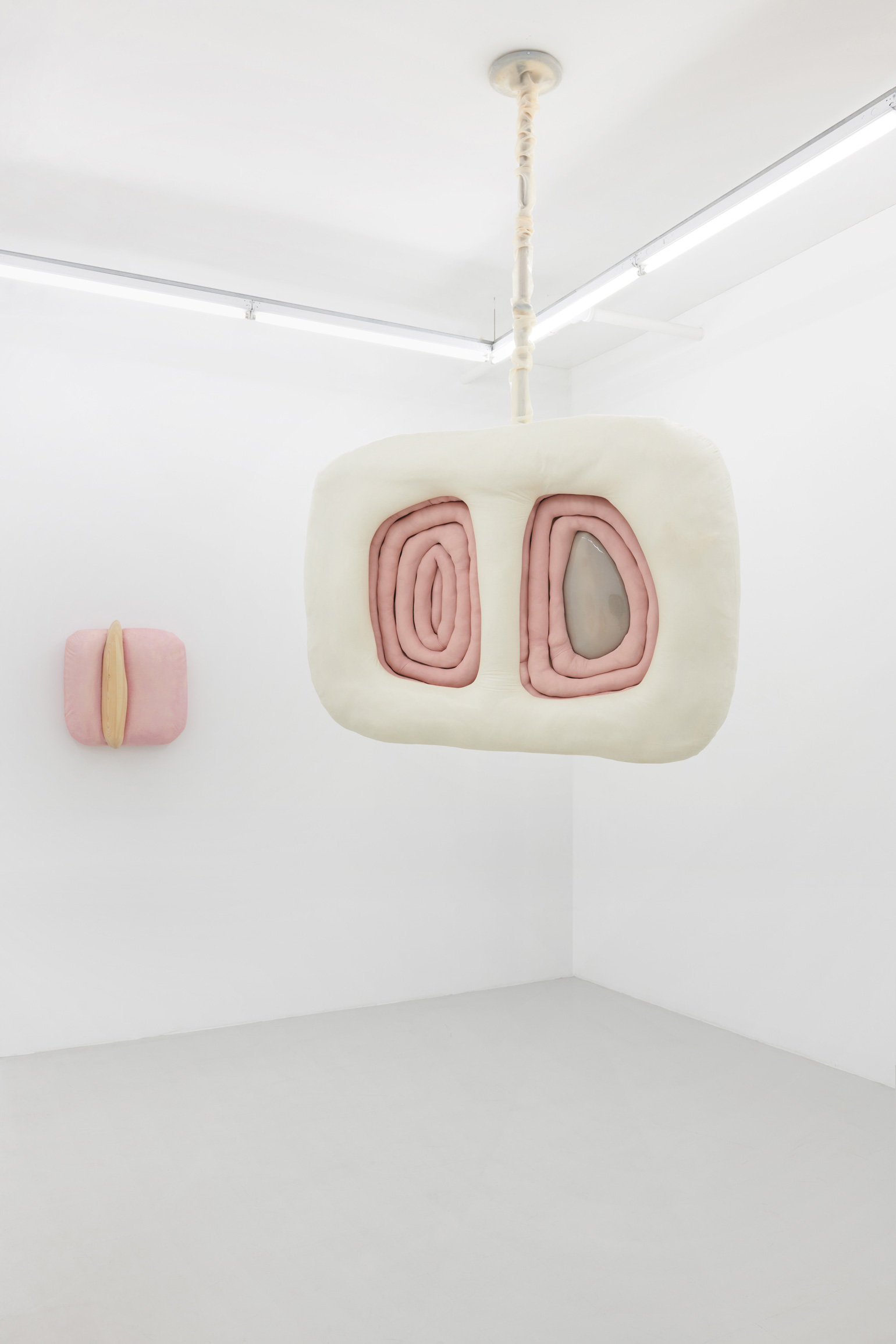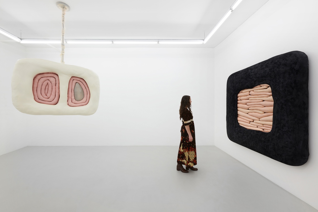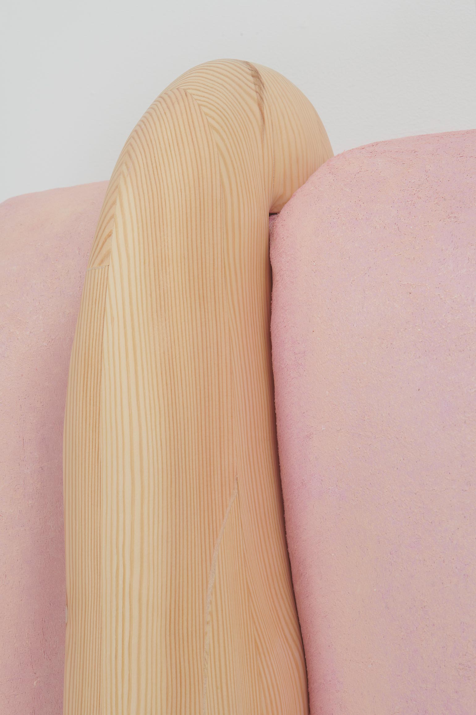 Whether clinging to the wall or freely-suspended, these objects churn codified binaries beyond expectation – visceral/epidermal, prosthetic/native, sensuous/aversive, primeval/plasticine – their sculptural logics minted from substances that would be at home at home: expanded foams, tufted velvet, a touch-up coat of eggshell acrylics, plain-woven canvas, joists of timber, the liniment-like glimmer of varnish, nails, the melodious note of soft-hewn pine. Under Kothe’s hand, they are massaged into the soft securities of a domestic milieu and the pliant, if evanescent, warped comforts of the not-quite flesh.