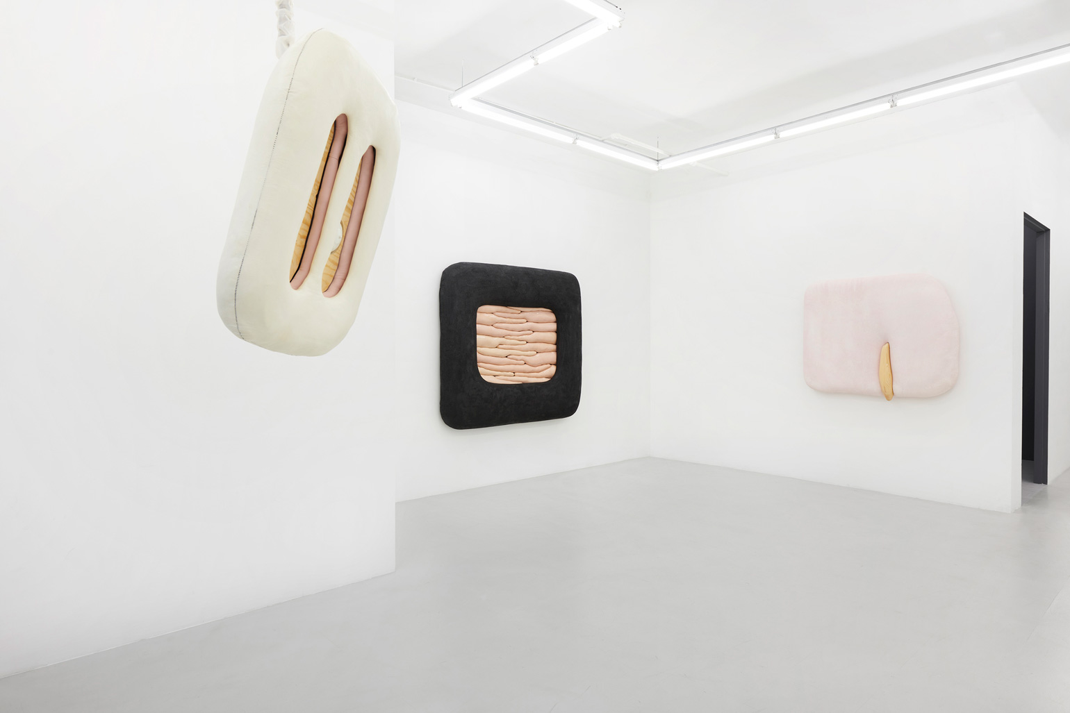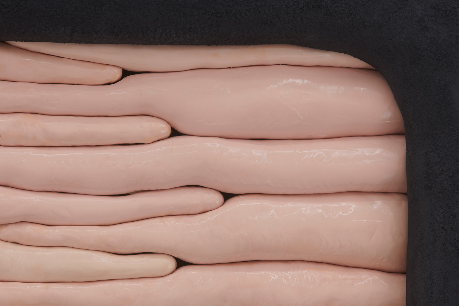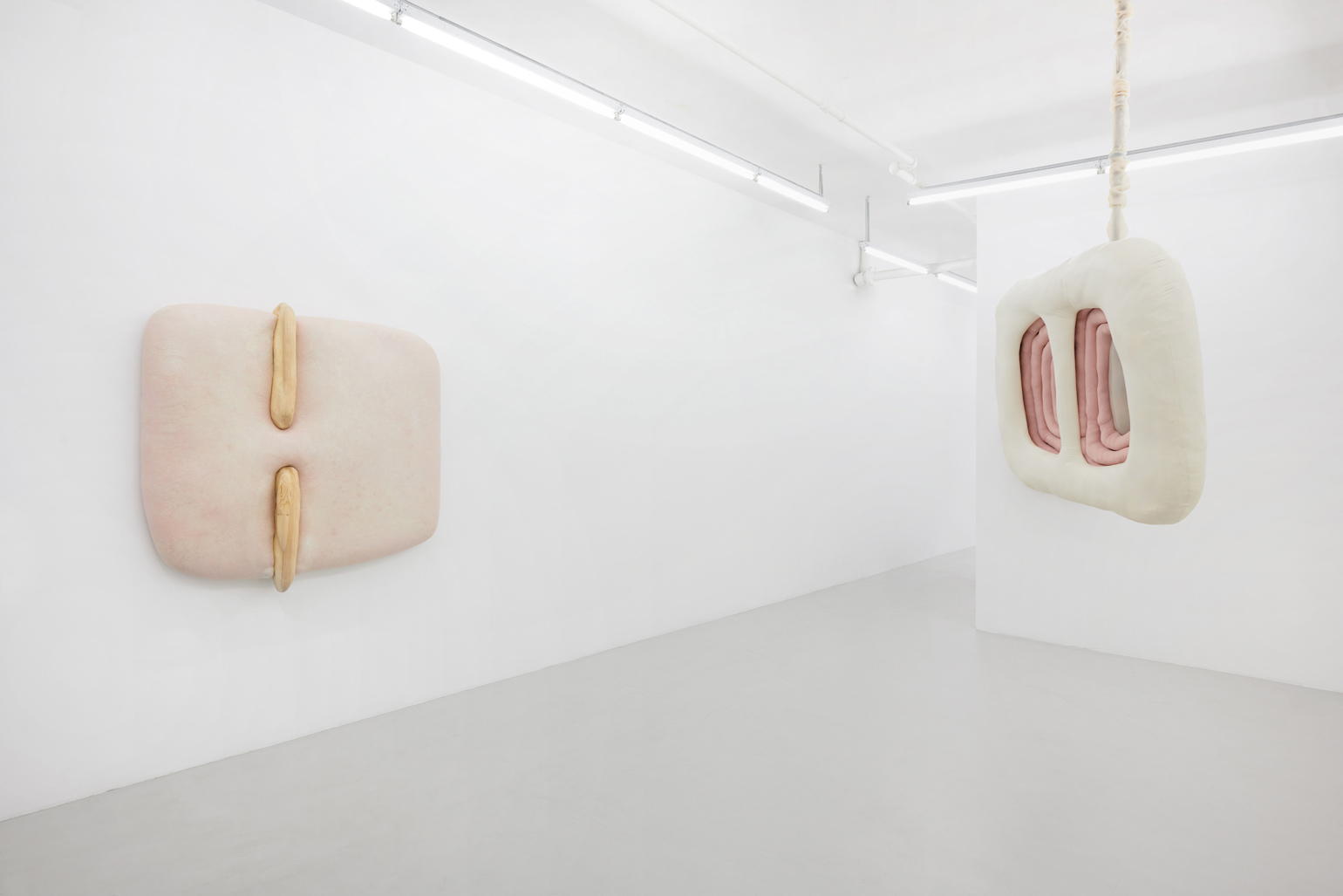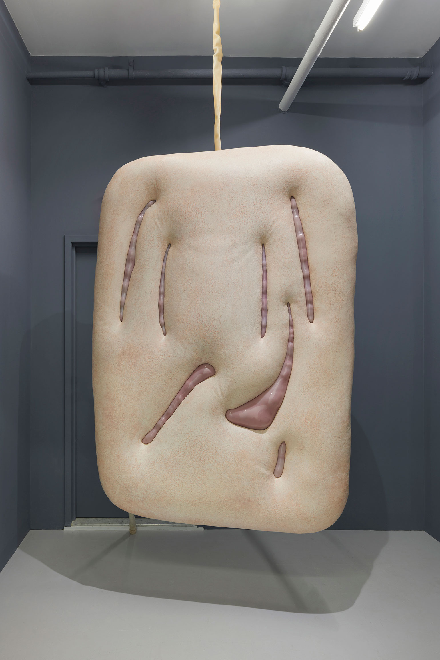 Humans, we append annotations to the haunting refrains of our inheritance. In his first U.S. solo exhibition, the Düssseldorf-based artist Jens Kothe braids together the epigenetic influence of manifold 20th-century sculptural argots. One might number in this clade Robert Gober’s bodily traces as palimpsests of memory, Heidi Bucher’s shape-shifting milky architectonic molds, the errant threat of self-dissection that emanates from the spectre of early Tishan Hsu, Alina Szapocznikow’s erogenous metastasis of the domesticated self, or the biomorphic ouroboros of Frederick Kiesler’s “endless house” — a mutated lineage extruded into the meaty heuristic of Kothe’s speculative morphobiology and immunological ergonomics.