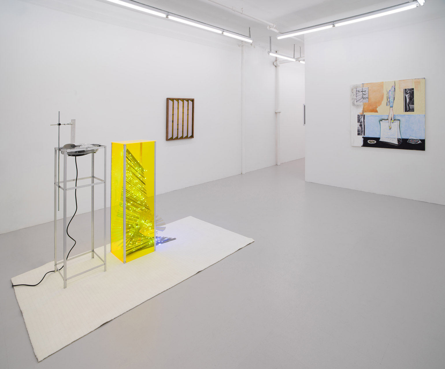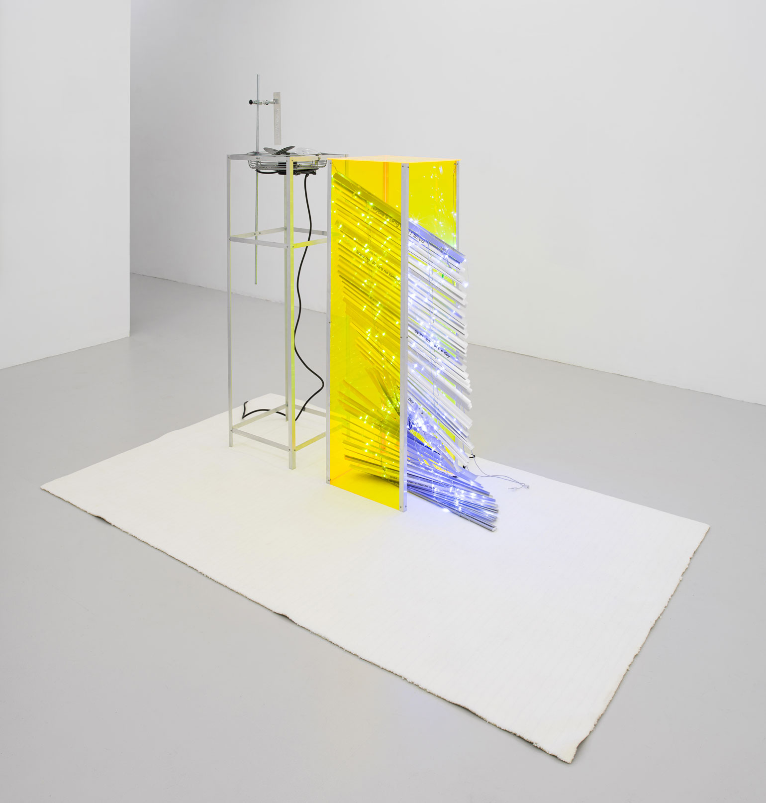Cytter/Roebas, yes wake up the light from the balcony hangs on high windows there's no other reason to climb on charred trees, 2020. Aluminum window blinds, LED string lighting, vinyl, Plexiglas, modified fan, engraved nickel, laboratory equipment, magnet, hardware & rug, 48 × 83 × 62 inches / 121,9 × 210,8 × 157,5 cm