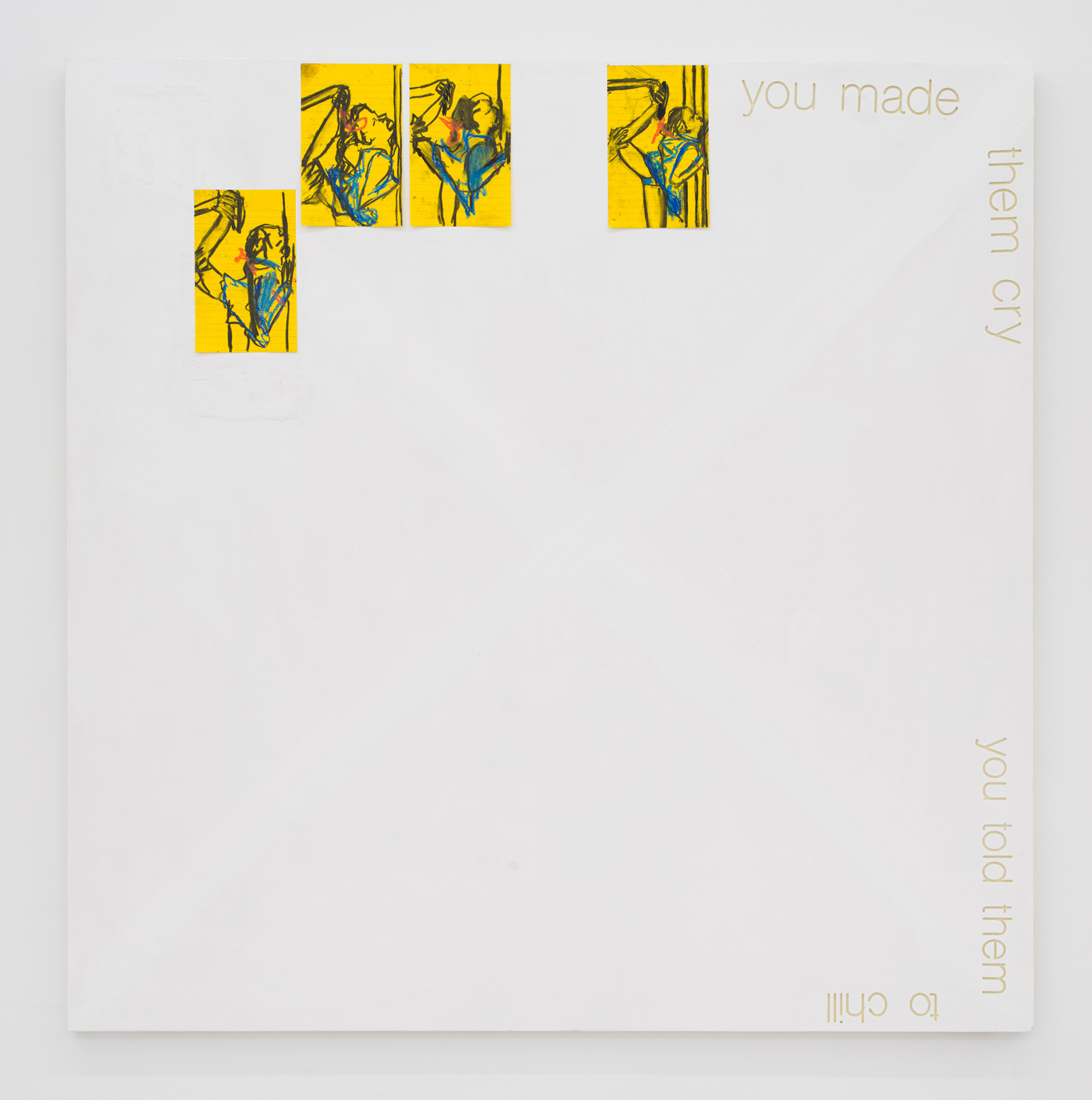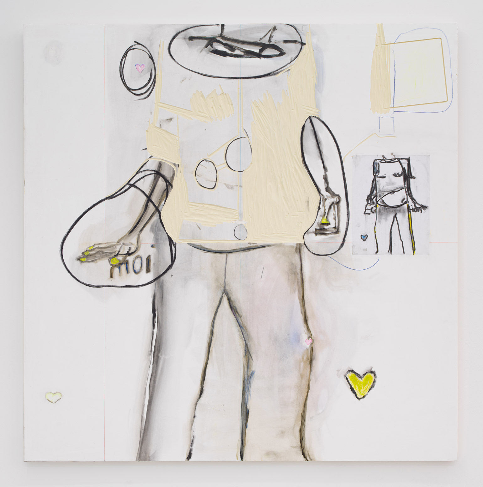 Dani Leder, Supergo, 2019-20. Oil, acrylic, and adhesive paper with print, charcoal and acrylic, on primed Corafoam, 48 × 48 inches / 121,9 × 121,9 cm