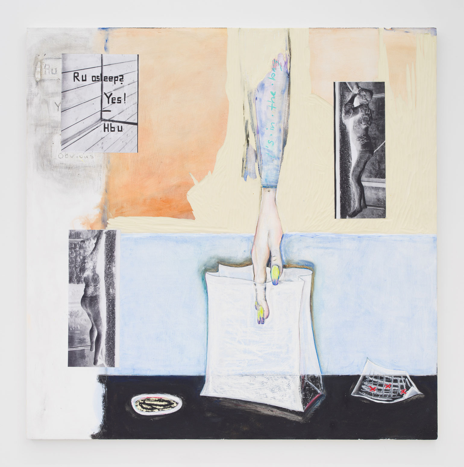 Dani Leder, Apokalypse Dip, 2019. Oil, acrylic, and adhesive paper with print, charcoal and acrylic, on primed Corafoam, 48 × 48 inches / 121,9 × 121,9 cm