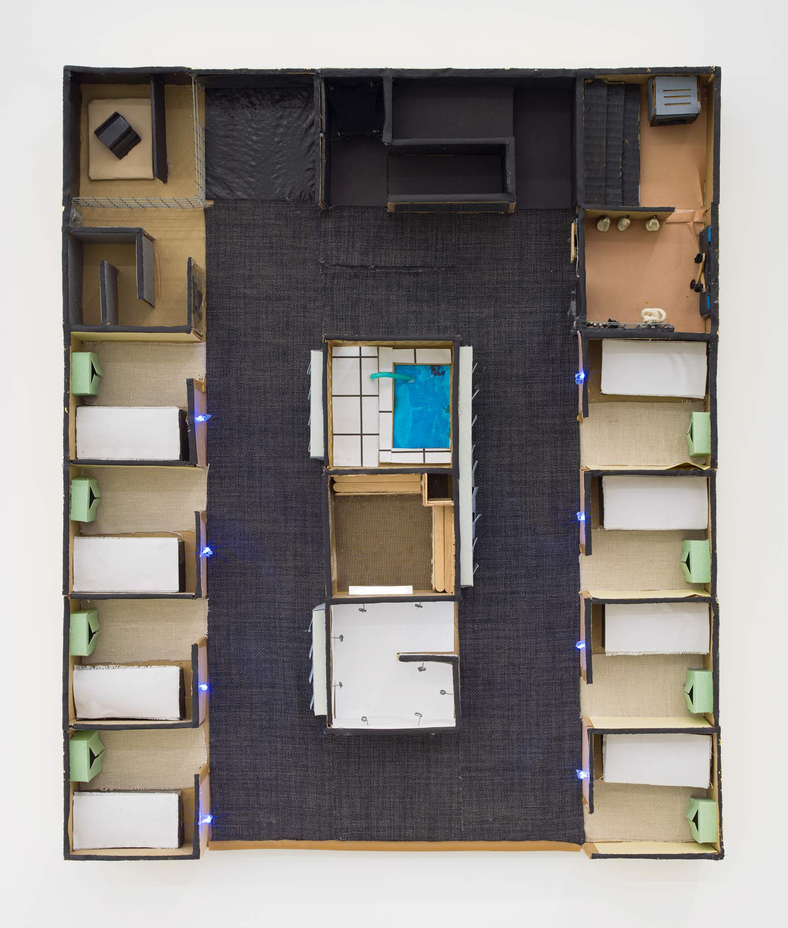 Douglas Watt. Bath/SRO Model, 2018. Corrugated cardboard, butcher tape, scotch tape, hot glue, linen, cotton, polyester, leather, garbage bag, glitter paper, popsicle sticks, bristol board, plasticine, galvanized wire mesh, fiberglass mesh screen, LED lights, vinyl sticker, plastic straw, paper, cling wrap, postcard, vinyl tube, spring, linen tape, latex tube, metallic cardstock, rubber stopper, wire, aluminum tape, gold metal leaf, latex condom, foam core, adhesive vinyl bumper sheet, inkjet print on paper, 33 × 28 × 6 inches / 83,8 × 71,1 × 15,2 cm