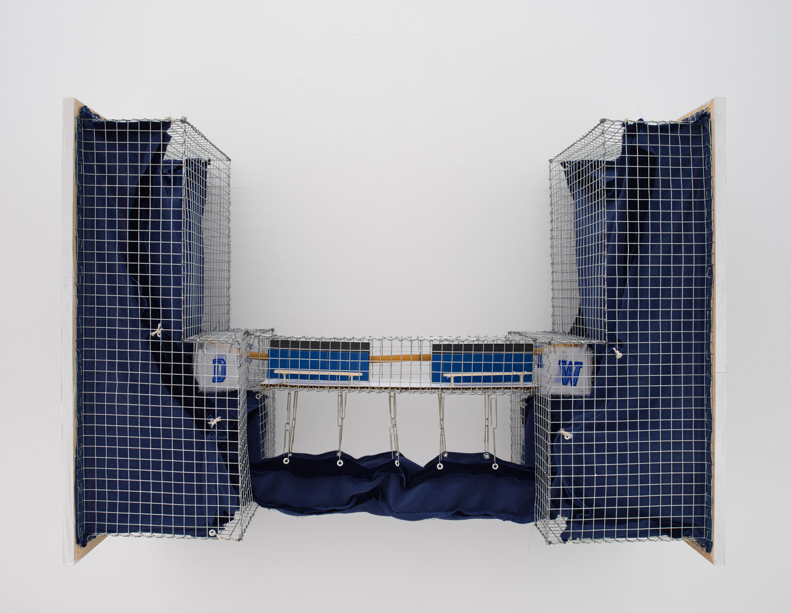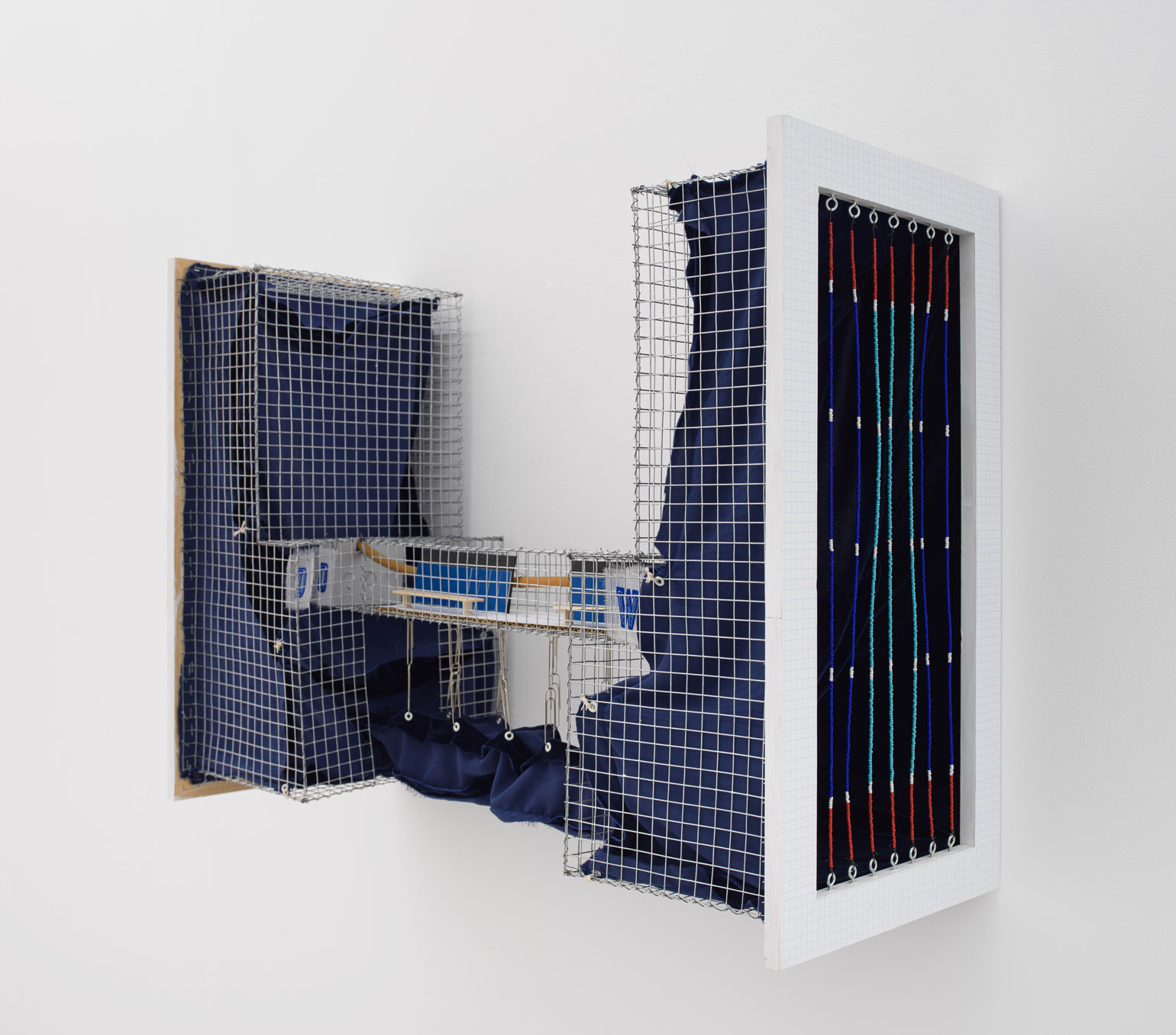 Douglas Watt, Pool (Osmosis), 2020. Silk velvet, wood, graph paper, wire, glass beads, eyelet screws, staples, acrylic paint, galvanized wire mesh, gromets, string, mat board, sequins, hot glue, cardboard, silk organza, iron on letters, thread, coloured gel, latex tube, popsicle sticks, paper clips, 30 × 21 × 11 inches / 76,2 × 53,3 × 27,9 cm