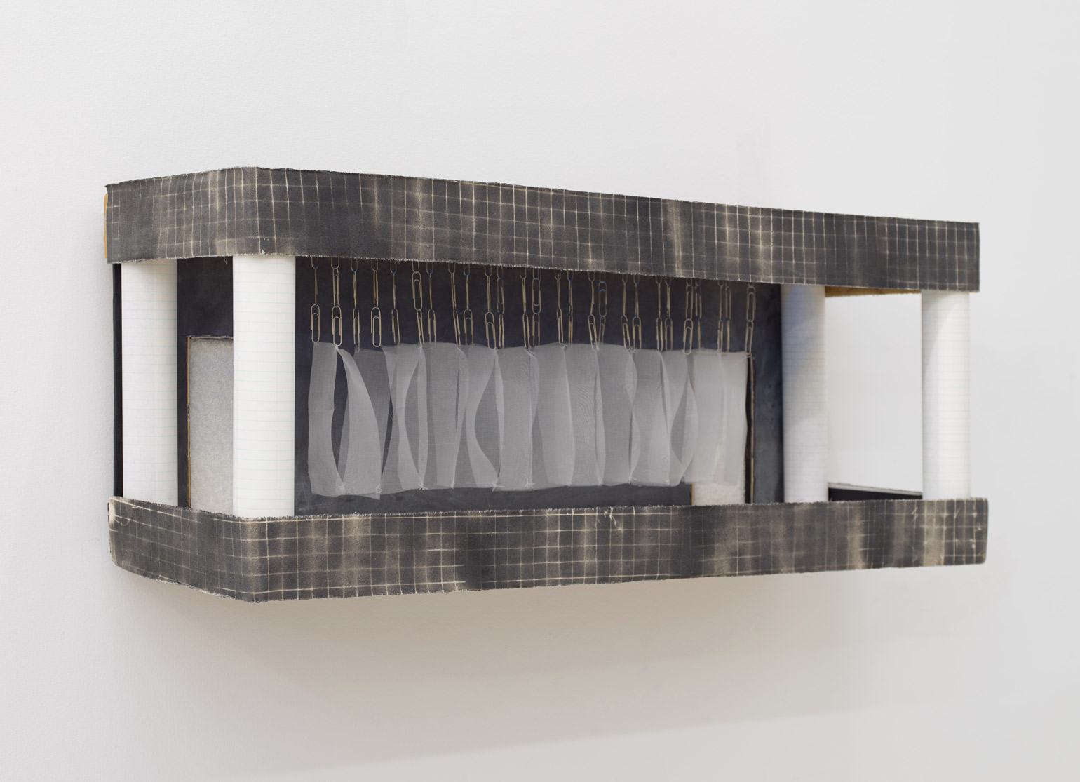 Douglas Watt, Locker Room Set, 2018. Corrugated cardboard, pine, hot glue, spray paint, sintra, lined paper, paper clips, graph paper, scotch tape, Terry towel, popsicle sticks, silk organza, silk thread, LED lights, cardboard tubes, translucent setting powder, foam board, acetate, bristol board, 30 × 22 × 10 inches / 76,2 × 55,9 × 25,4 cm