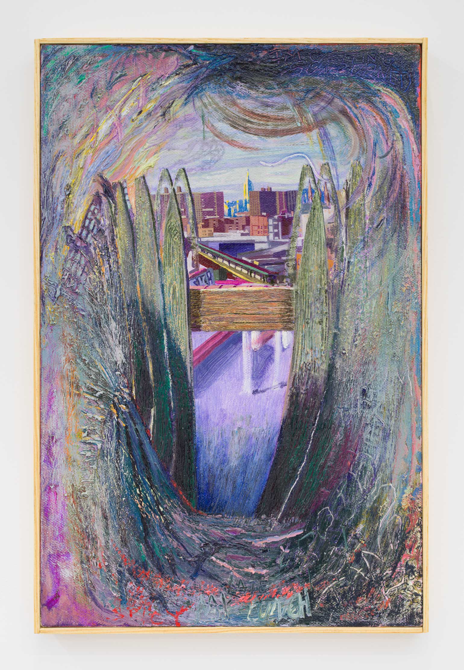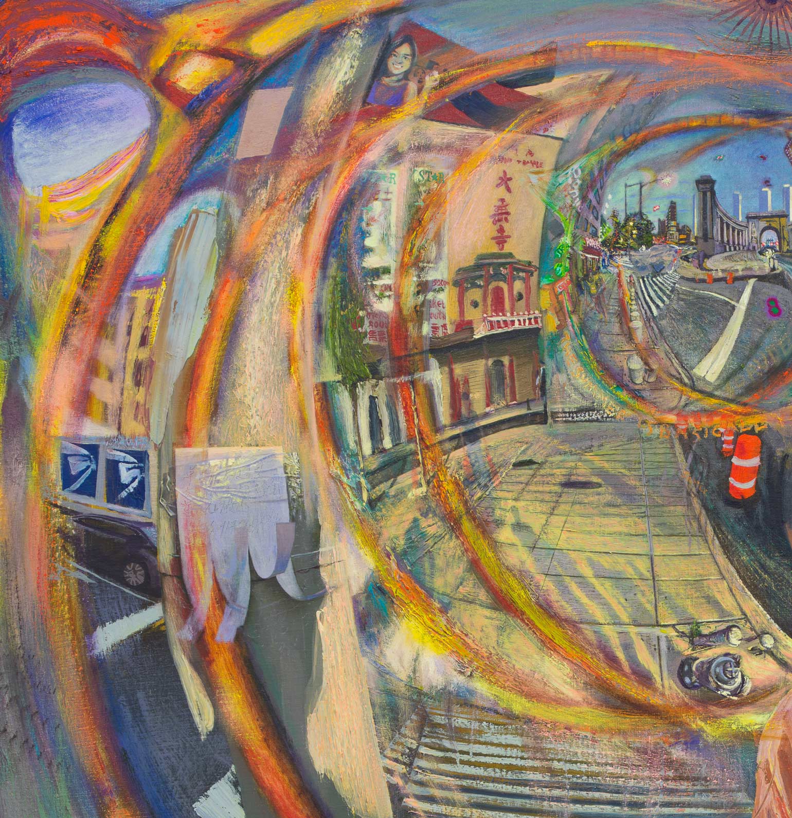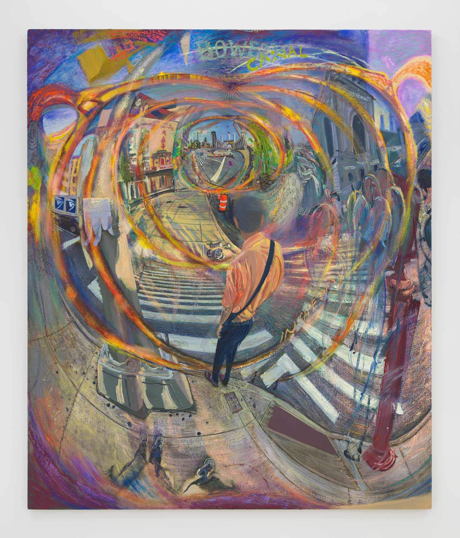 Dylan Vandenhoeck, Manhattan Bridge/Chinatown/Sunglasses, 2019-20. Oil on linen, 72 × 60 inches / 183 × 175,2 cm