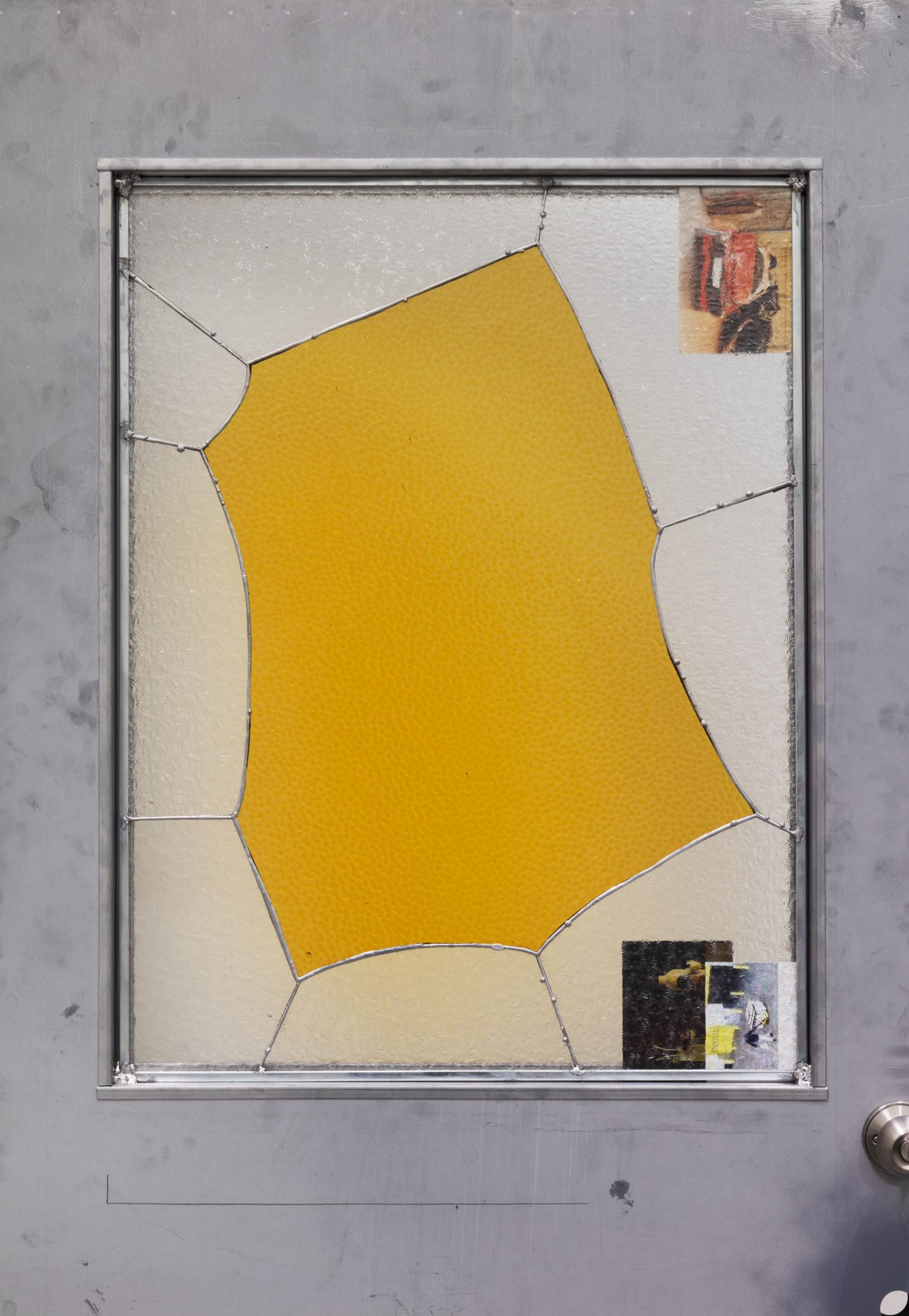 Nadia Belerique, Yellow Jacket, 2019 (detail). Fire door, stained glass, lead, found objects, 79 1/2 × 35 1/2 × 8 inches / 201,9 × 90,2 × 20,3 cm