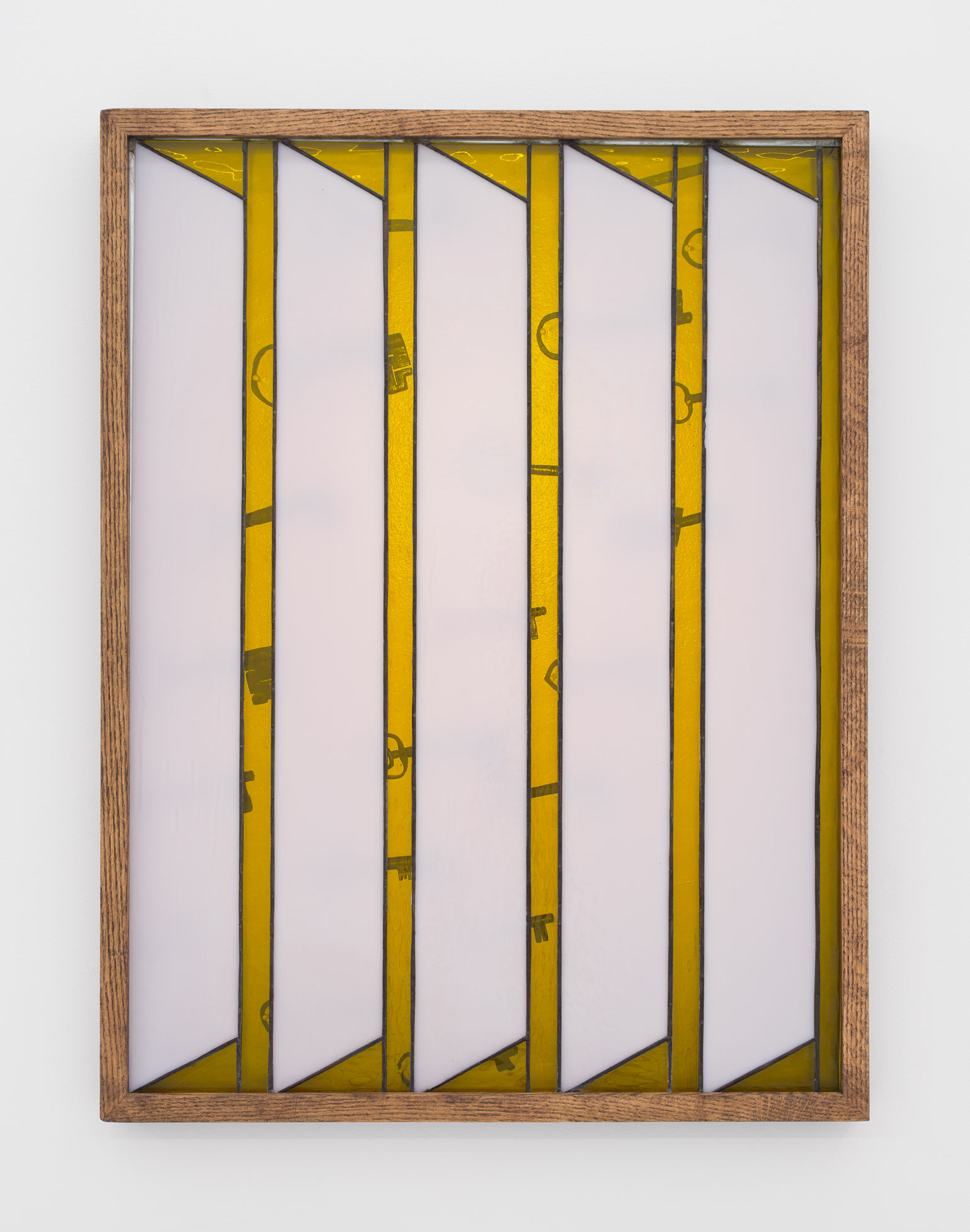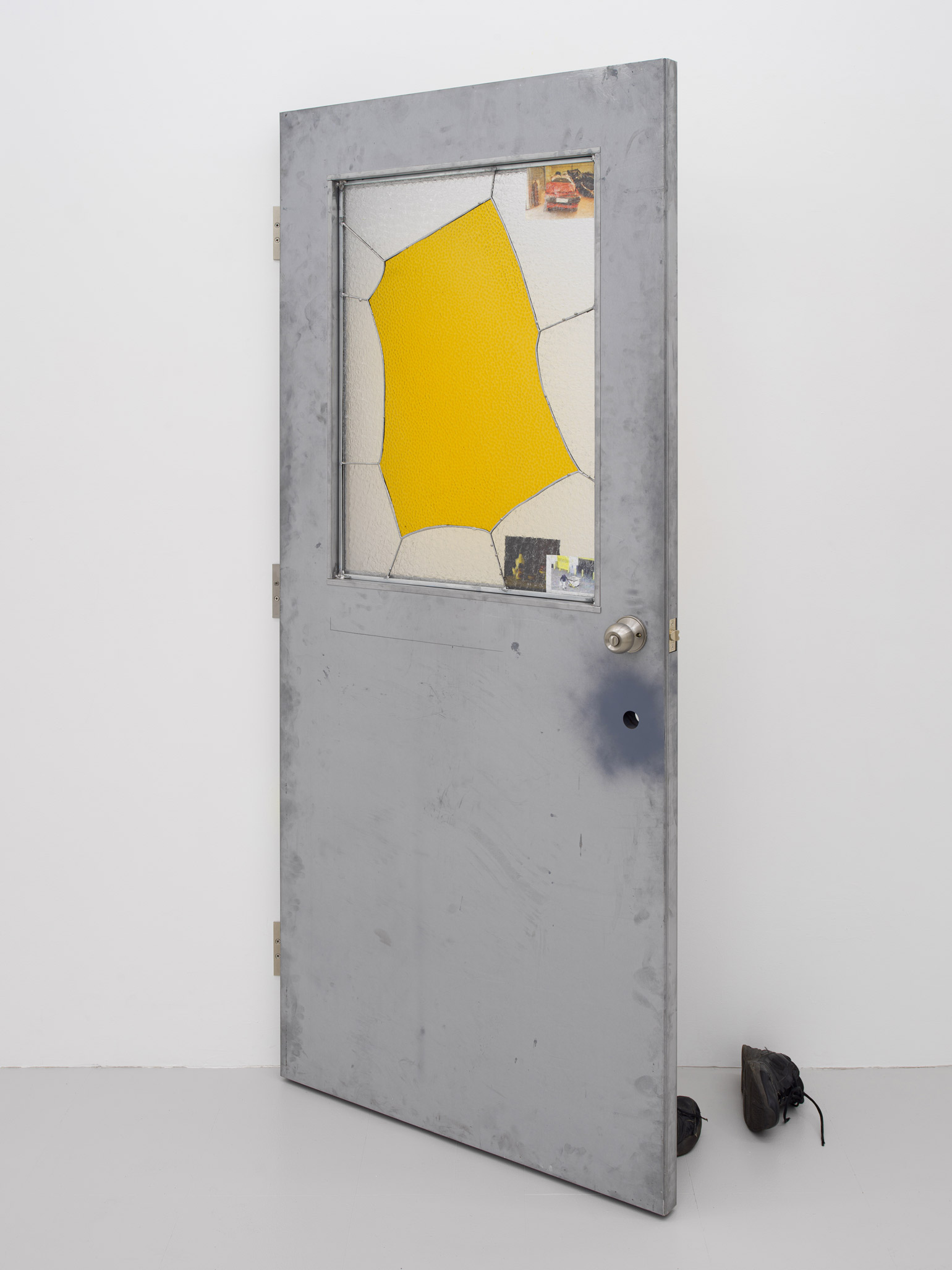 Nadia Belerique, Yellow Jacket, 2019. Fire door, stained glass, lead, found objects, 79 1/2 × 35 1/2 × 8 inches / 201,9 × 90,2 × 20,3 cm