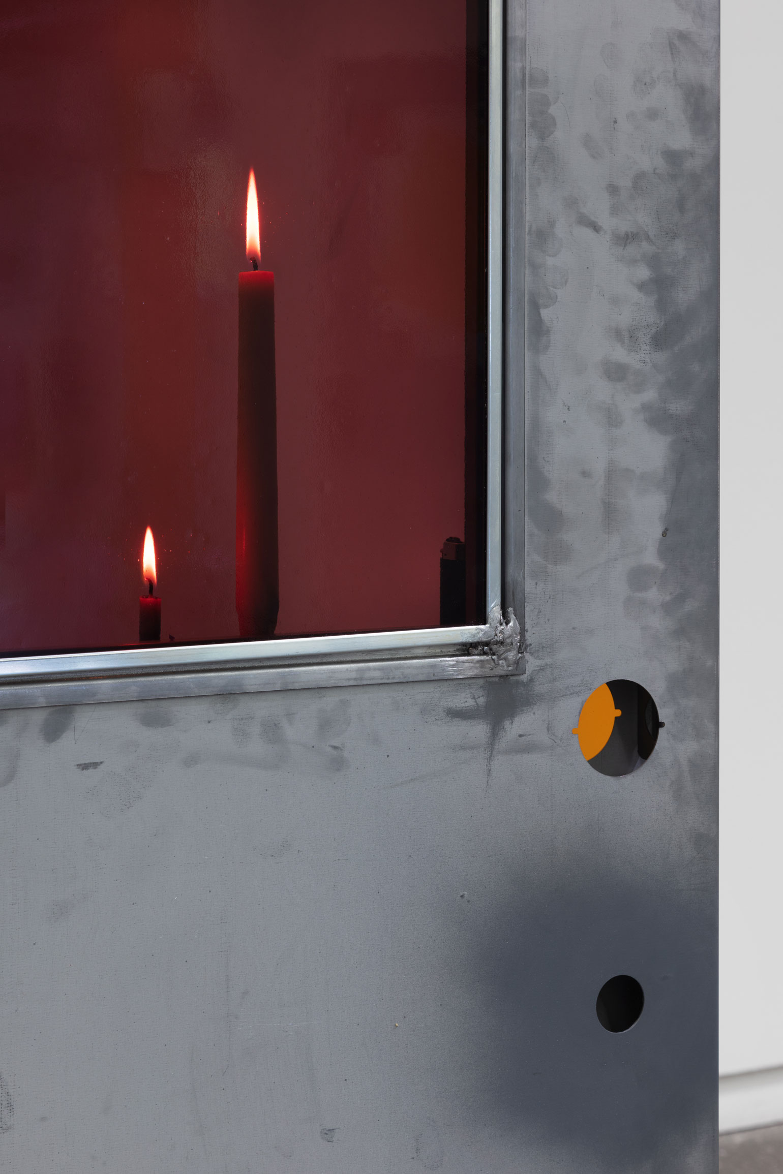 Nadia Belerique, Neighbourhood Watch, 2019 (detail). Fire door, stained glass, lead, found objects 79 1/2 × 35 1/2 × 35 1/2 inches / 201,9 × 90.2 × 90.2 cm