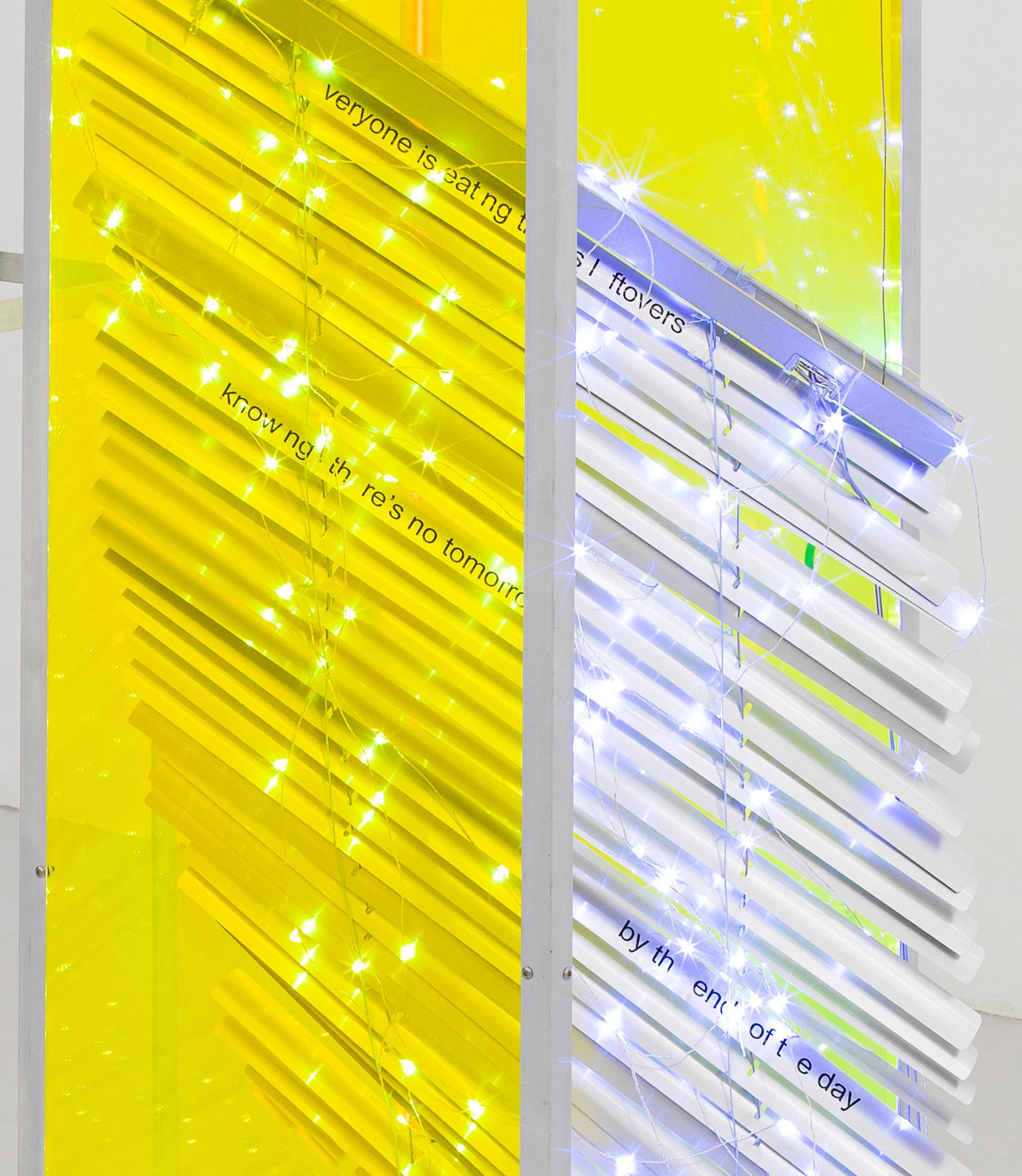 Cytter/Roebas, yes wake up the light from the balcony hangs on high windows there's no other reason to climb on charred trees, 2020 (detail). Aluminum window blinds, LED string lighting, vinyl, Plexiglas, modified fan, engraved nickel, laboratory equipment, magnet, hardware & rug, 48 × 83 × 62 inches / 121,9 × 210,8 × 157,5 cm