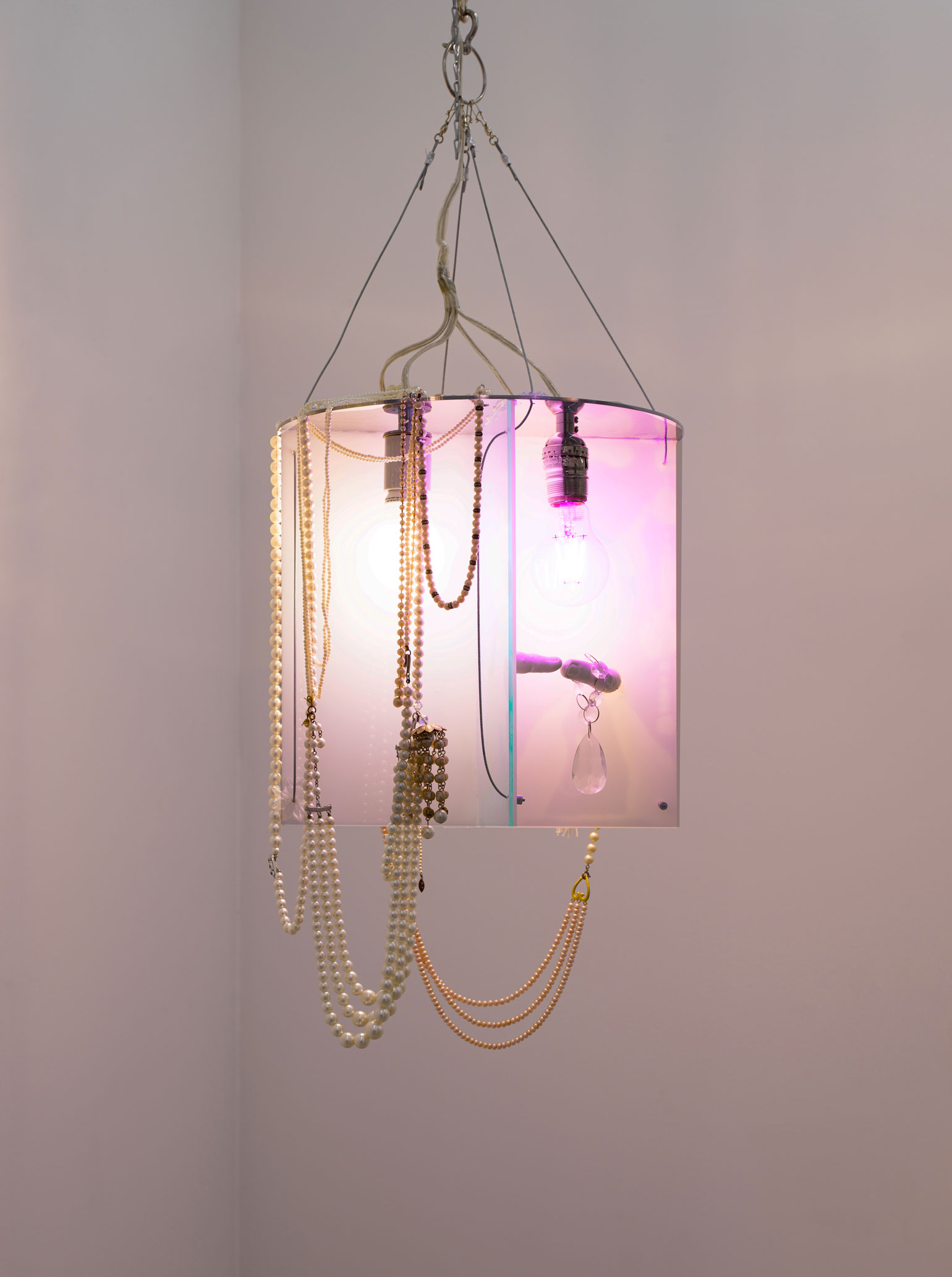 Cytter/Roebas, ALFH ART D Y (A Q CK N V L), 2019 (detail). Plexiglas, pearls, ornaments, vinyl, nylon, glue, hardware, lighting fixtures & wiring, dimensions variable.