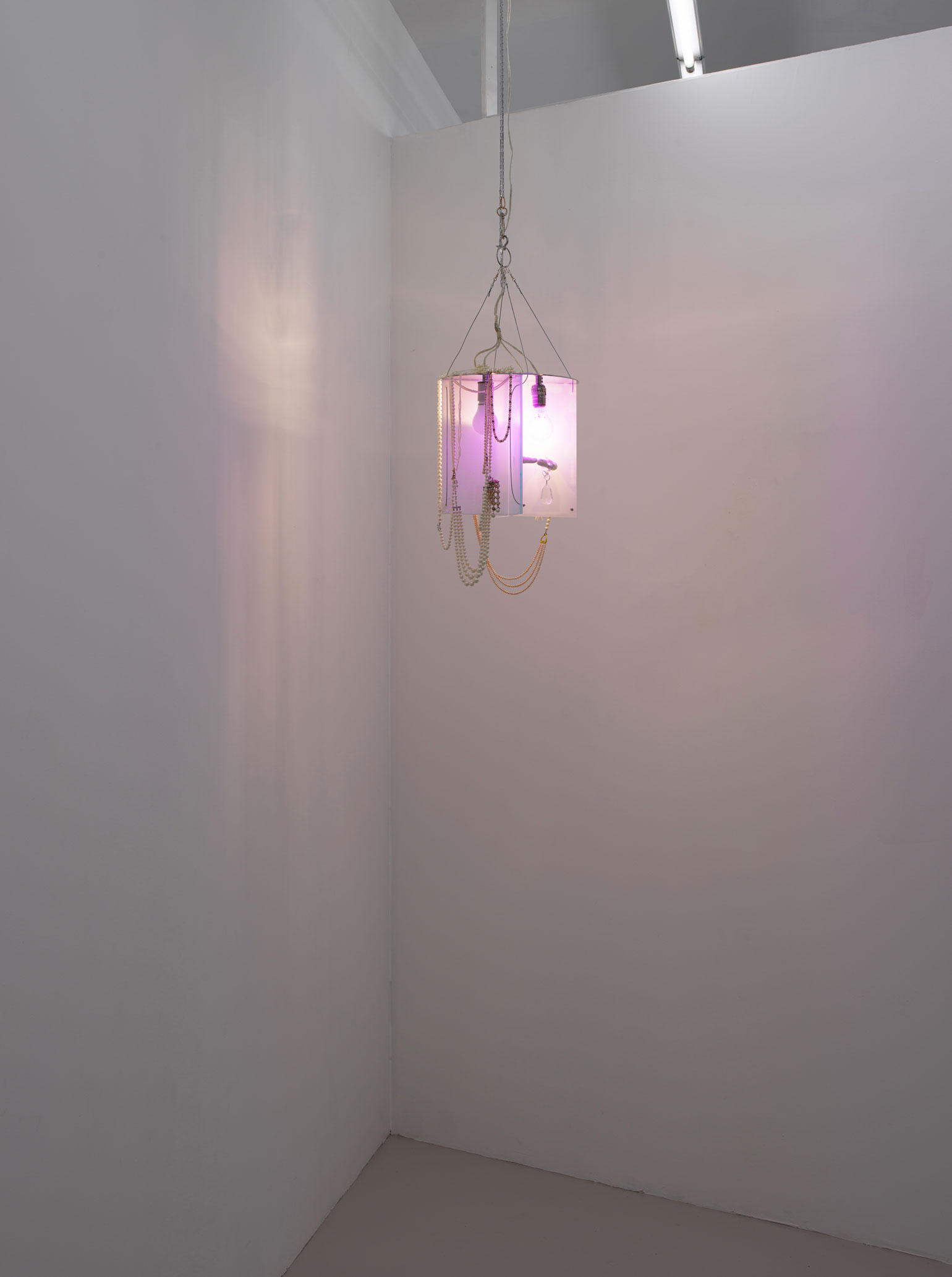 Cytter/Roebas, ALFH ART D Y (A Q CK N V L), 2019. Plexiglas, pearls, ornaments, vinyl, nylon, glue, hardware, lighting fixtures & wiring, dimensions variable.