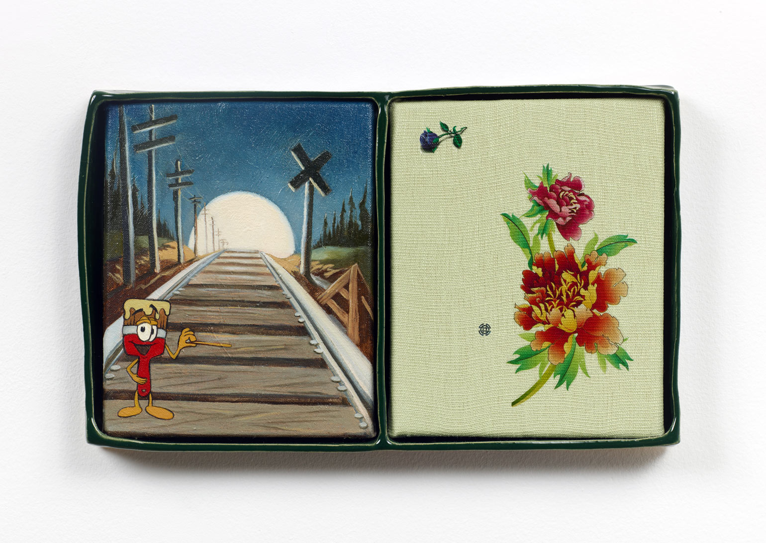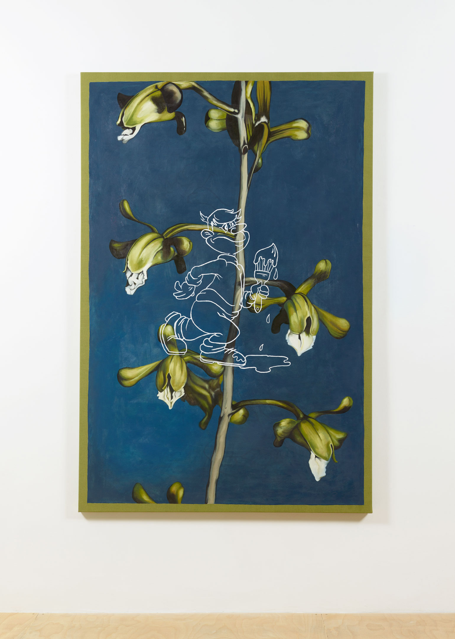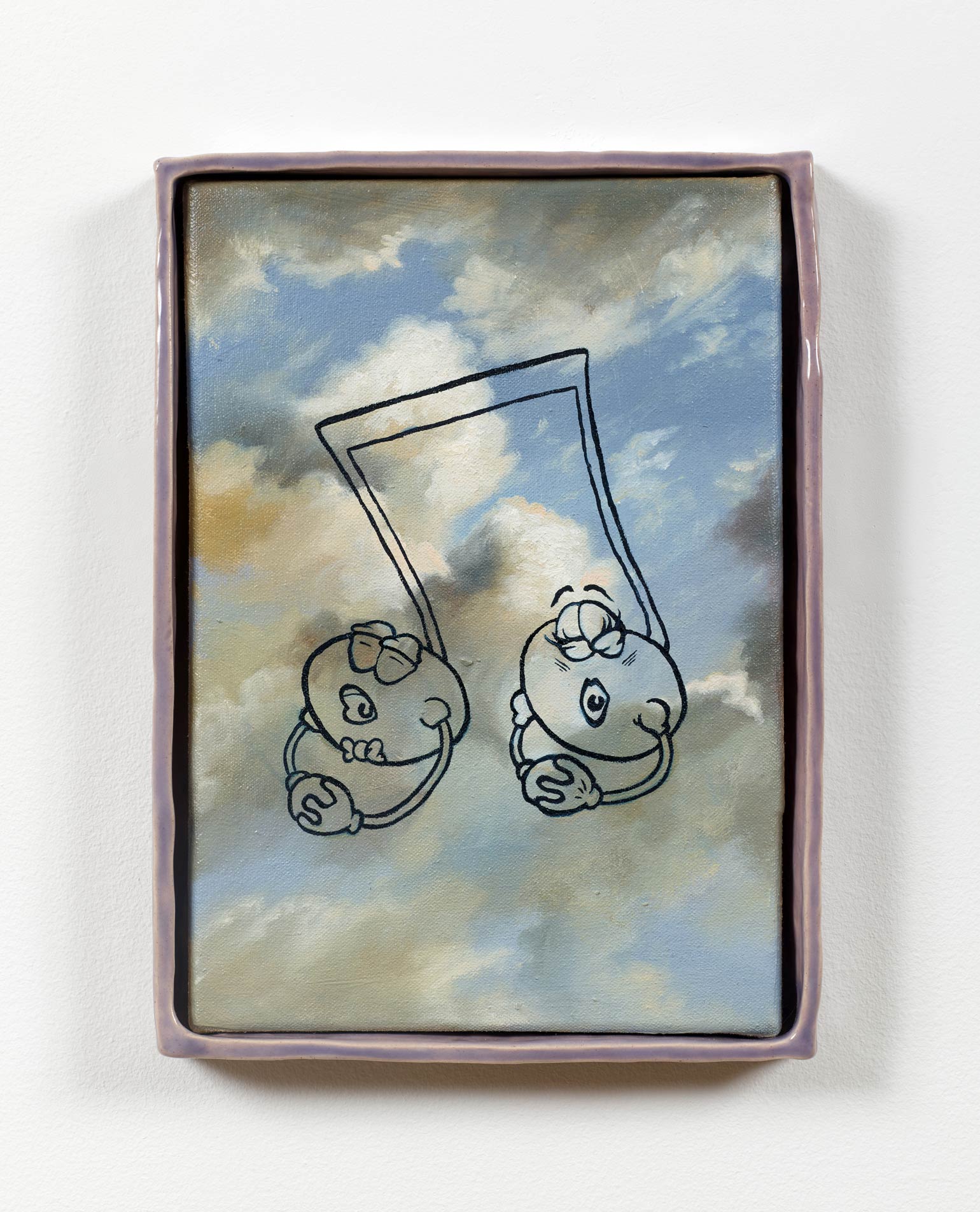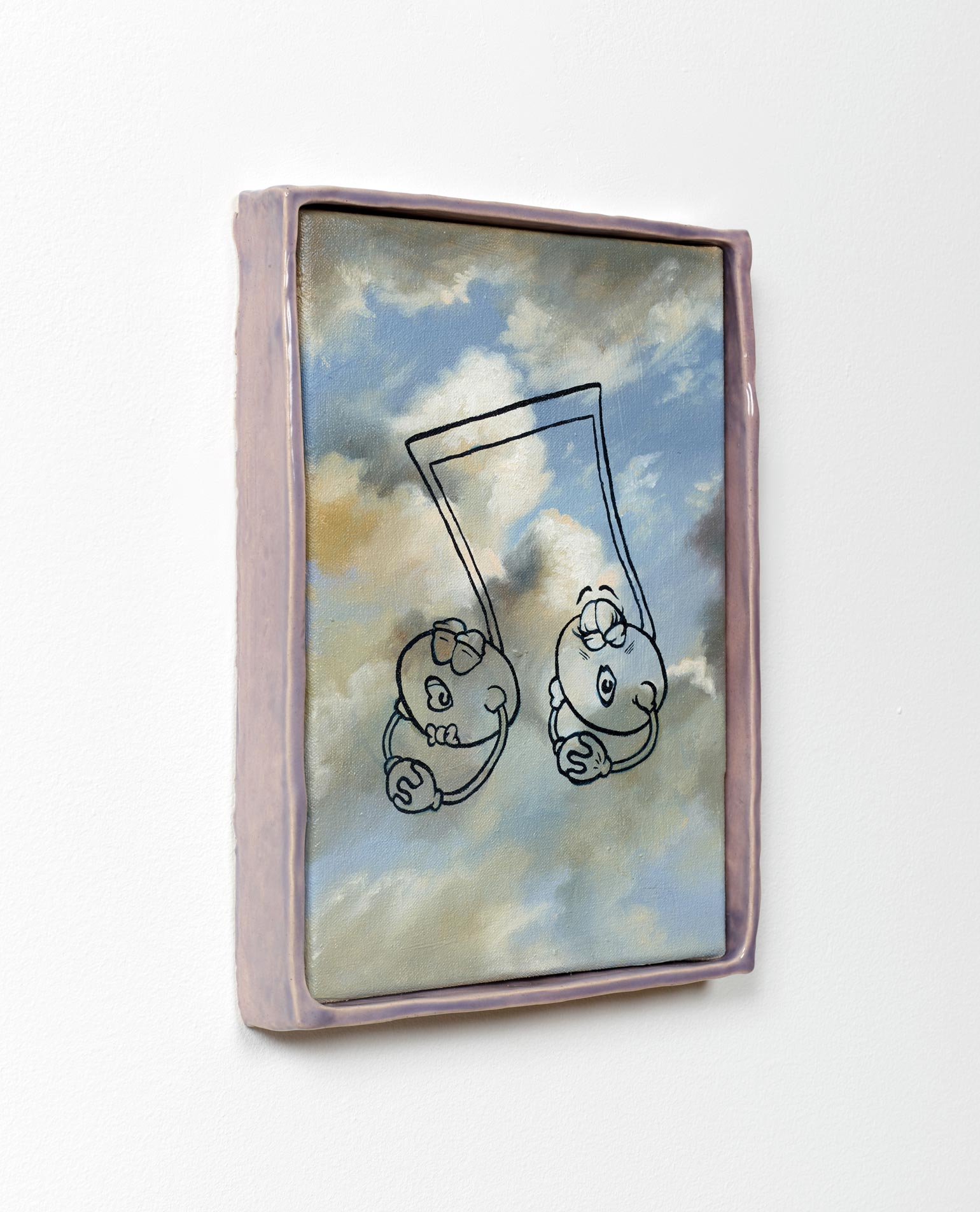 It’s worth noting, though, that the hands framing these paintings aren’t entirely Hier’s own: they are readymade images, taken from the artist Tom Tierney’s extensive catalogue of proto-open-source “ready-to-use” illustrations—the original clip art—which he began publishing in the mid 20th century. Hier’s paintings routinely stage this sort of confrontation between seemingly incongruous representational systems within a single picture; perhaps ironically, it might be described as her artistic signature. Alongside areas of precise painterly realism, Hier often draws on the aesthetics of early cartoon animation, particularly the style of Preston Blair, a Disney animator in the 1930s who went on to author a series of influential how-to books. To this she adds another pseudo-readymade layer in the form of the paintings’ titles, often derived from song lyrics, quotes, and snippets of overheard dialogue. In Bits of Business, a cartoonish outline of a sulking figure with a comically oversized dripping paintbrush is superimposed over a luminous, painstaking rendering of a Eulophia orchid’s drooping buds; in Waltz for a Spaniel, a small, timeless cloud study provides the backdrop for anthropomorphized musical notes, shown clasping their hands together and singing. These juxtapositions are dissonant in technique and tone, but Hier isn’t going for mere shock value; instead, she mines the associative logic of contemporary visual culture, in which the most stylistically heterogeneous images routinely coexist side by side according to the whims of an algorithm.