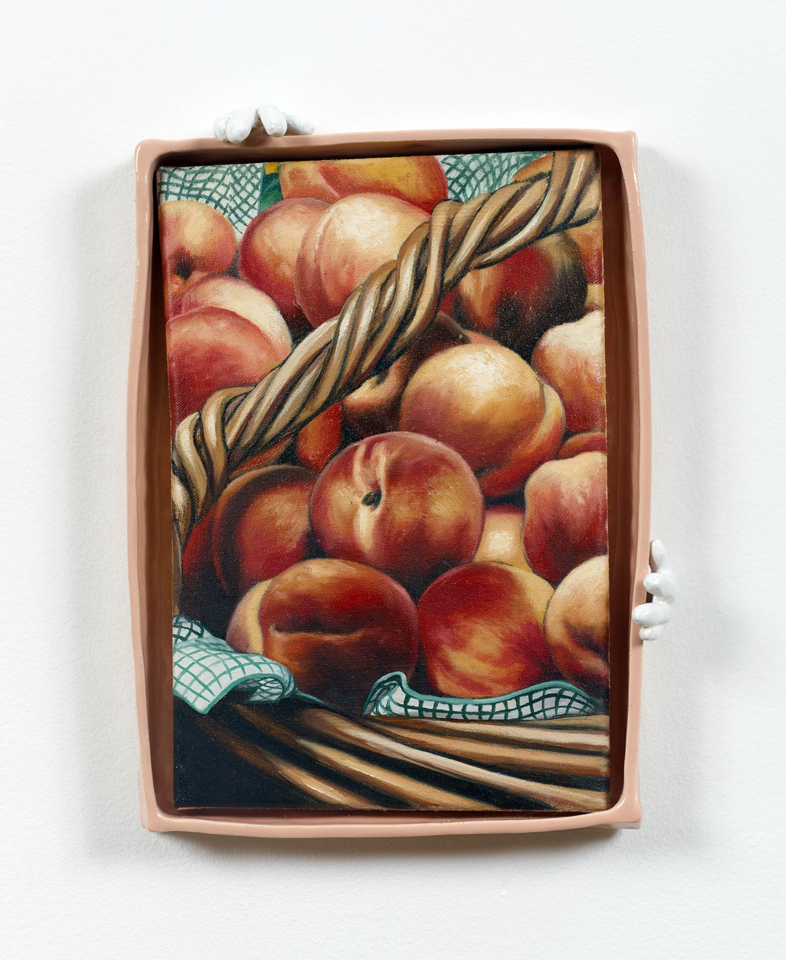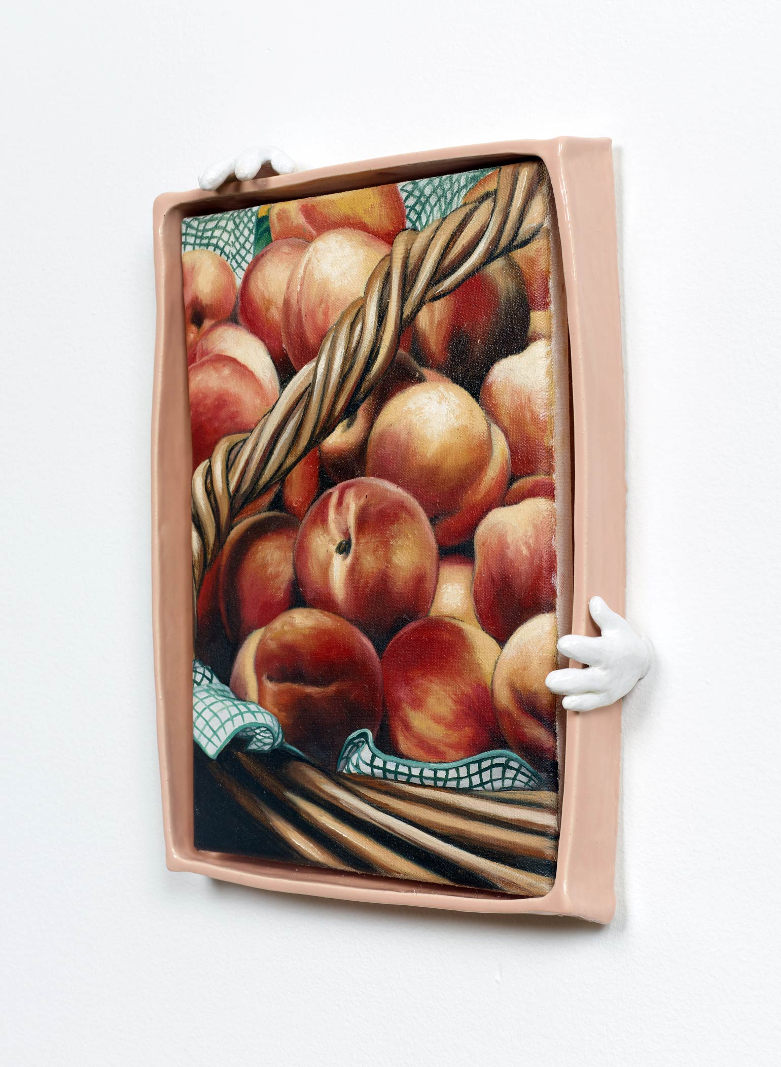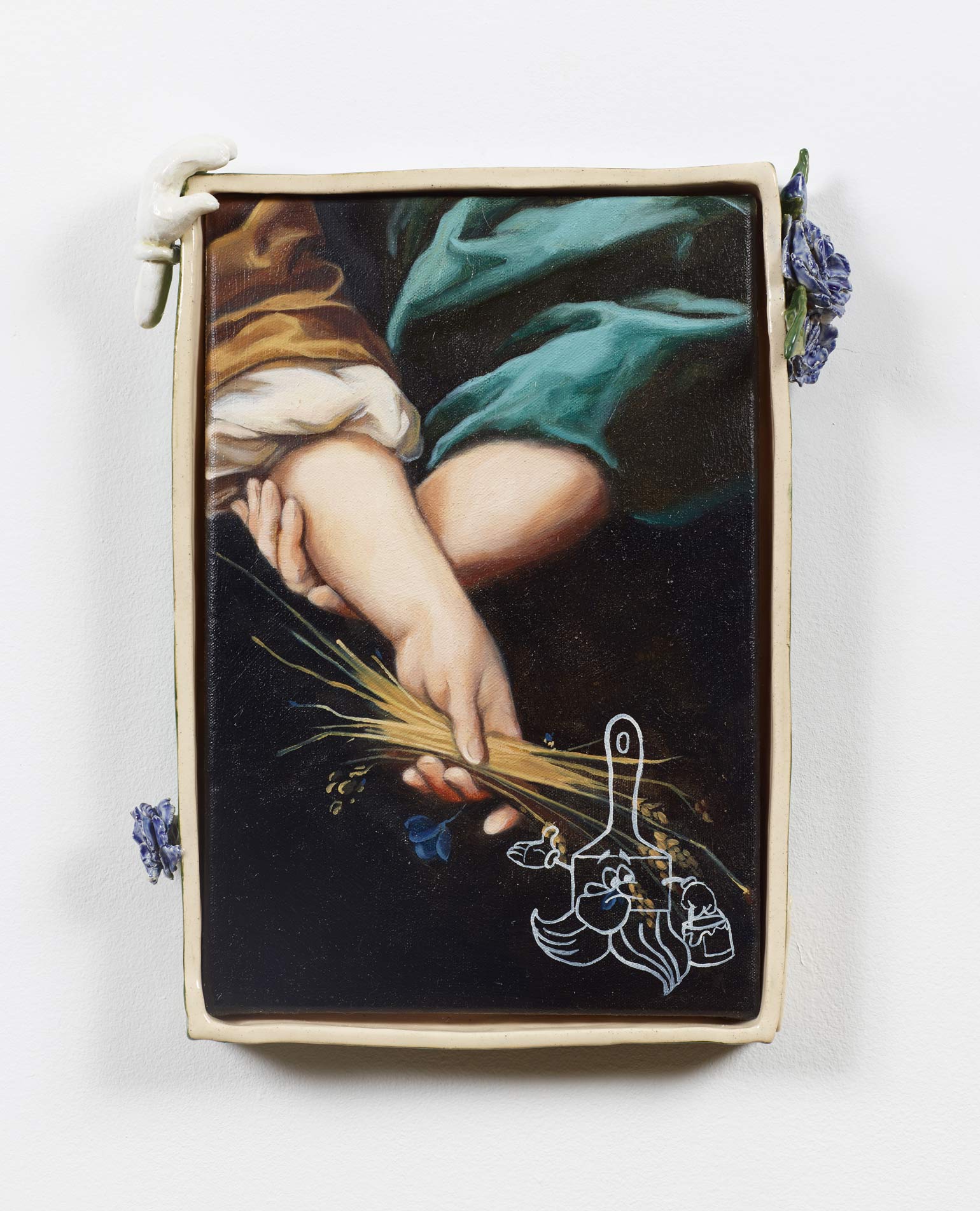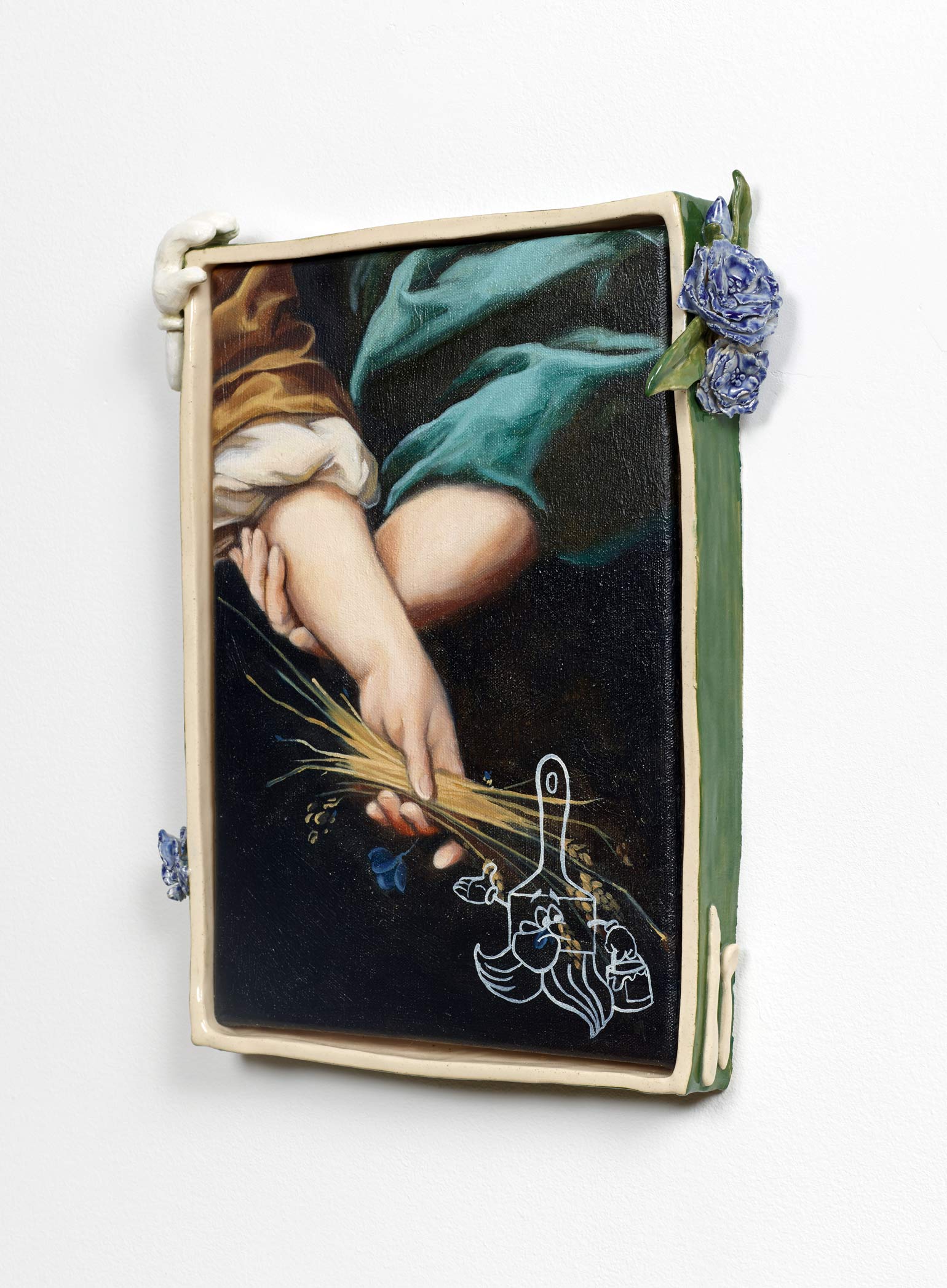 For Hier, the painter is both a maker and a mediator of images. Hence, the works in this exhibition repeatedly return to themes of handcraft and consumption. A pair of large canvases, Hardly Feel Like a Mustard Seed and Light Green Fellow, is emblematic. In the former, the stark black outline of a hand holding a wrench encloses a view of a young woman at the wheel throwing ceramics, a medium that Hier often uses to create sculptural frames for her smaller canvases. The latter painting sets a tabletop still life of overflowing bowls of ripe fruit within the outlines of hands grasping an open book and reading glasses. In employing hands as a literal frame for the painted image, Hier of course plays with the privileged notion of the ‘hand of the artist’ as a metonym for the artist’s unique painterly signature. But she also suggests that the painter’s task is less a matter of depicting the world than framing and reframing it, slowing down the flow of images that surrounds us so that we might engage with them more critically. Hier’s handmade ceramic frames function similarly, emphasizing the extent to which crafting an image and framing it are inextricably linked within her practice.