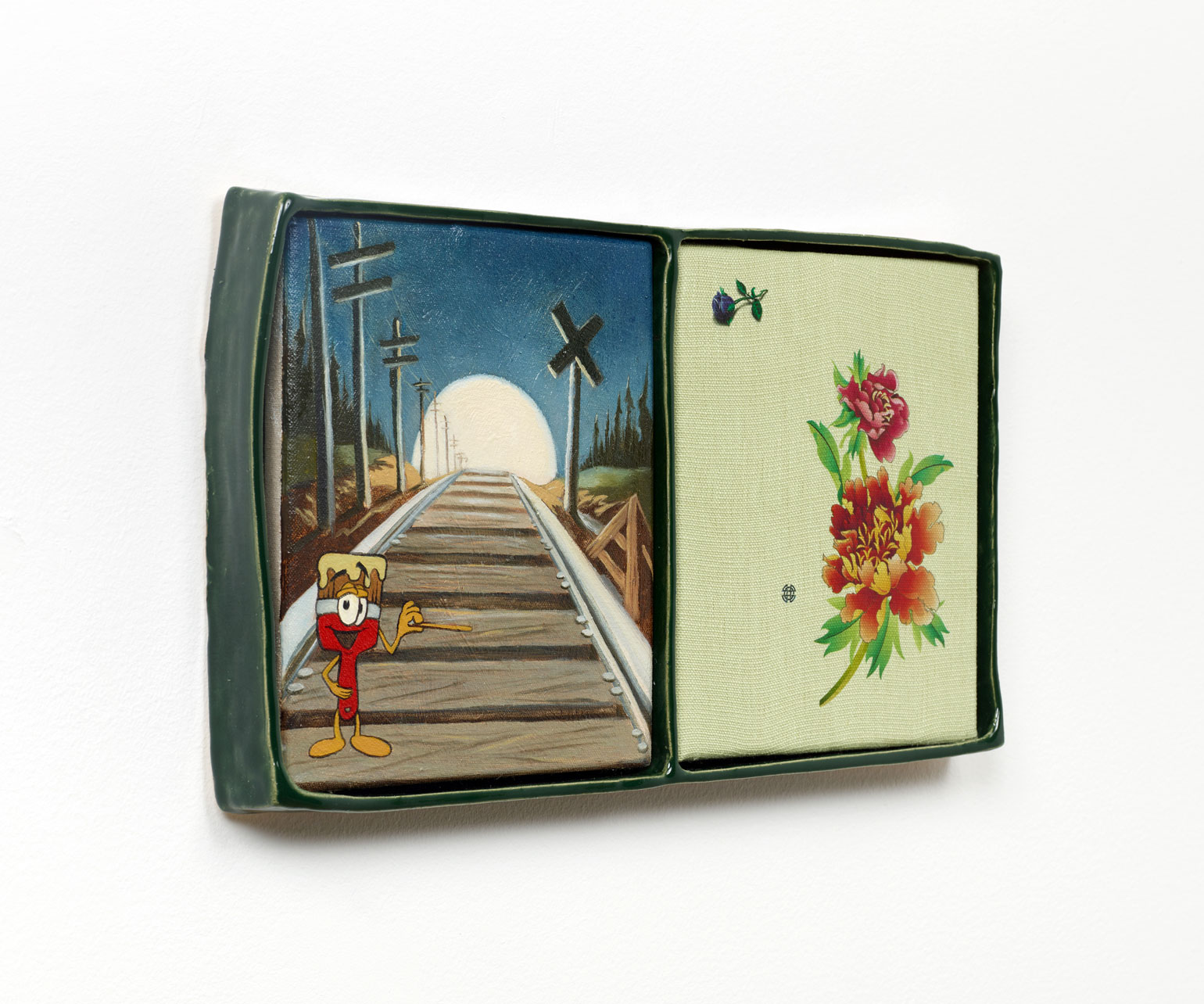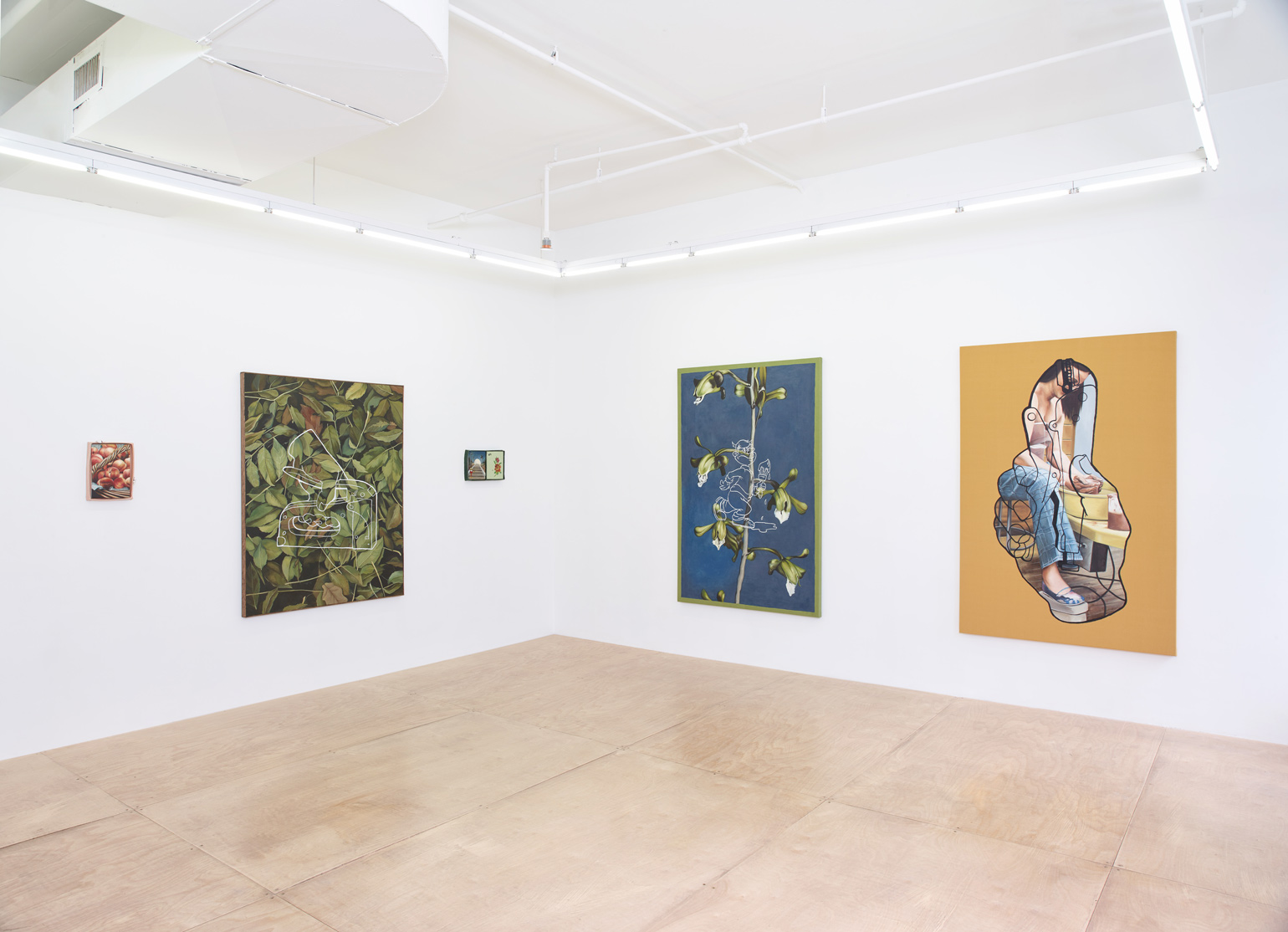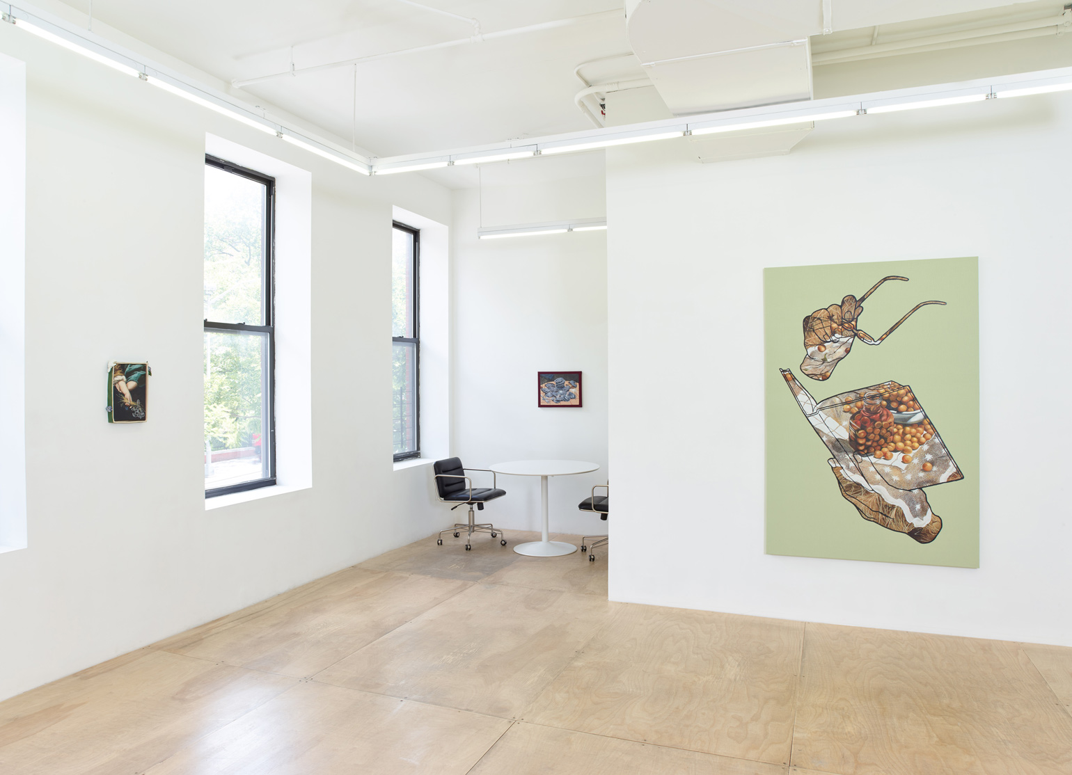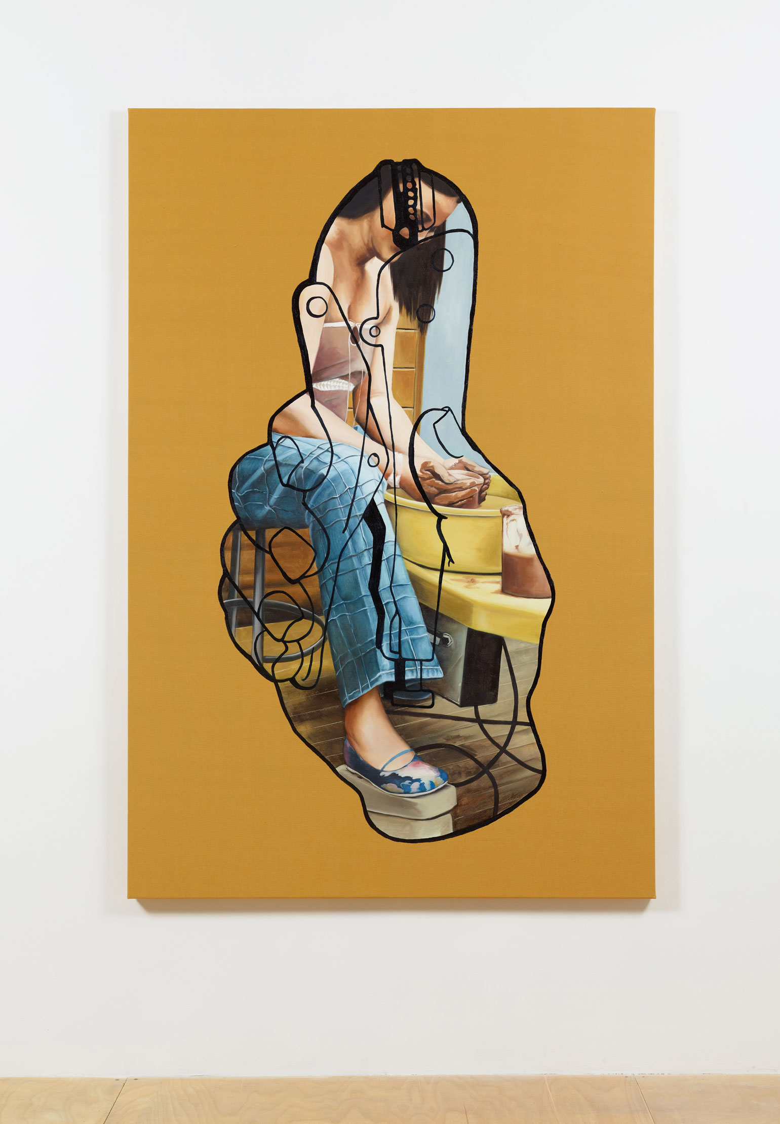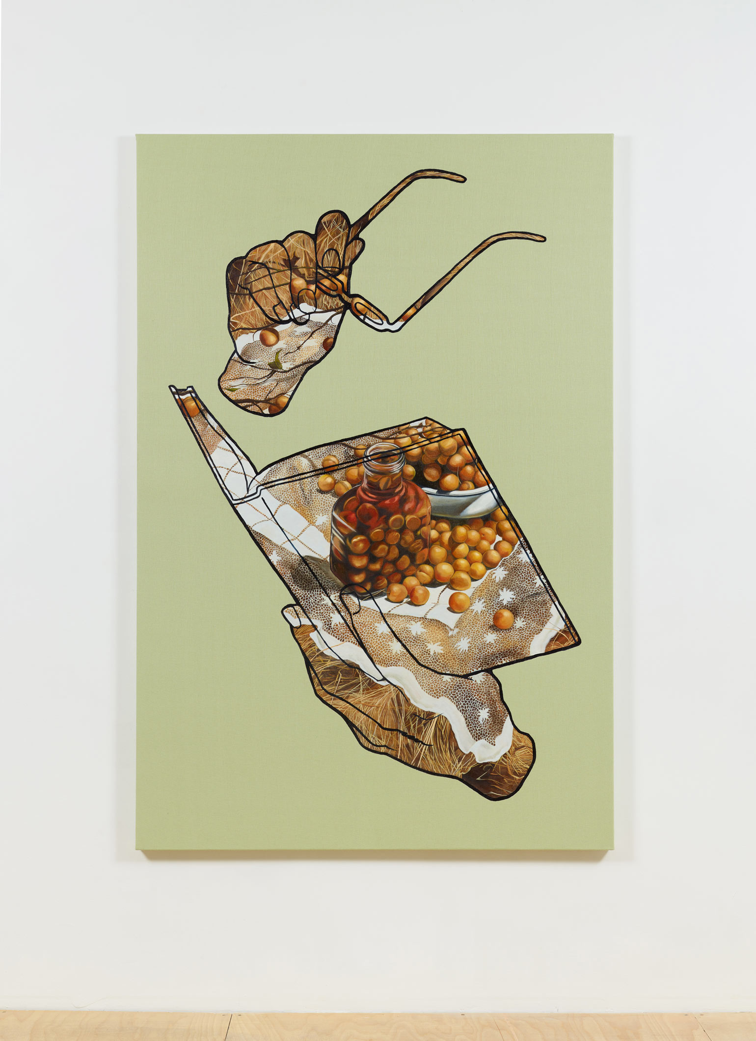 For Hier, the painter is both a maker and a mediator of images. Hence, the works in this exhibition repeatedly return to themes of handcraft and consumption. A pair of large canvases, Hardly Feel Like a Mustard Seed and Light Green Fellow, is emblematic. In the former, the stark black outline of a hand holding a wrench encloses a view of a young woman at the wheel throwing ceramics, a medium that Hier often uses to create sculptural frames for her smaller canvases. The latter painting sets a tabletop still life of overflowing bowls of ripe fruit within the outlines of hands grasping an open book and reading glasses. In employing hands as a literal frame for the painted image, Hier of course plays with the privileged notion of the ‘hand of the artist’ as a metonym for the artist’s unique painterly signature. But she also suggests that the painter’s task is less a matter of depicting the world than framing and reframing it, slowing down the flow of images that surrounds us so that we might engage with them more critically. Hier’s handmade ceramic frames function similarly, emphasizing the extent to which crafting an image and framing it are inextricably linked within her practice.