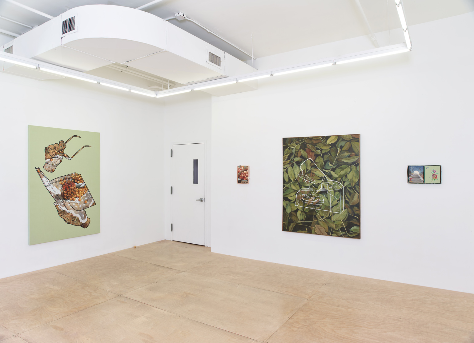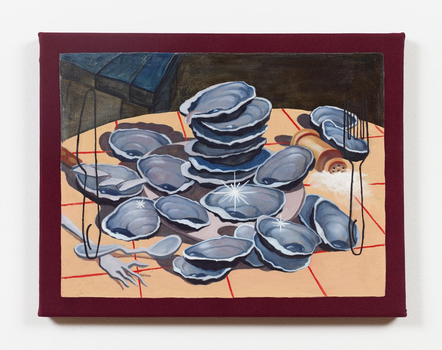Looking at the work of Stephanie Hier, her engagement with the Dutch tradition is evident, not least on the level of technique: she began studying at a classical painting atelier at a young age, where she learned to build a realist picture in the manner of the Old Masters. The paintings in Part and Parcel likewise display any number of genre scene standards—piled oyster shells, fruit, flowers—whose meticulous rendering might be taken as an implicit riposte to the recent dominance of intentionally deskilled approaches to painting. But Hier is far from a pre-modern throwback: instead, her work considers the place of painting—figurative painting, in particular—in a world defined by the rapid proliferation of digital images circulating at a speed and scale that would have been unimaginable to the likes of Rembrandt and Vermeer.