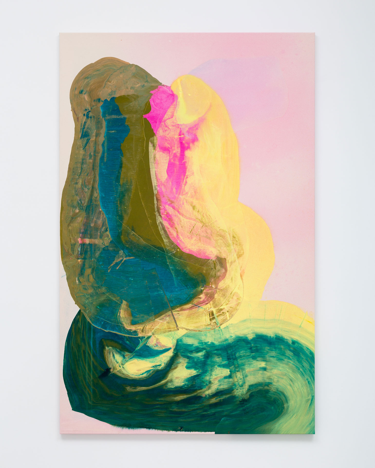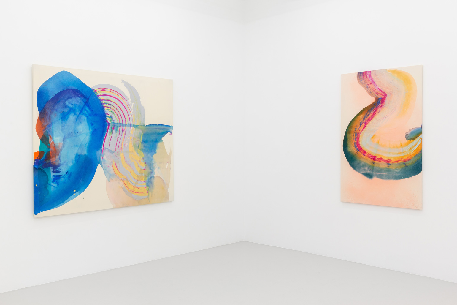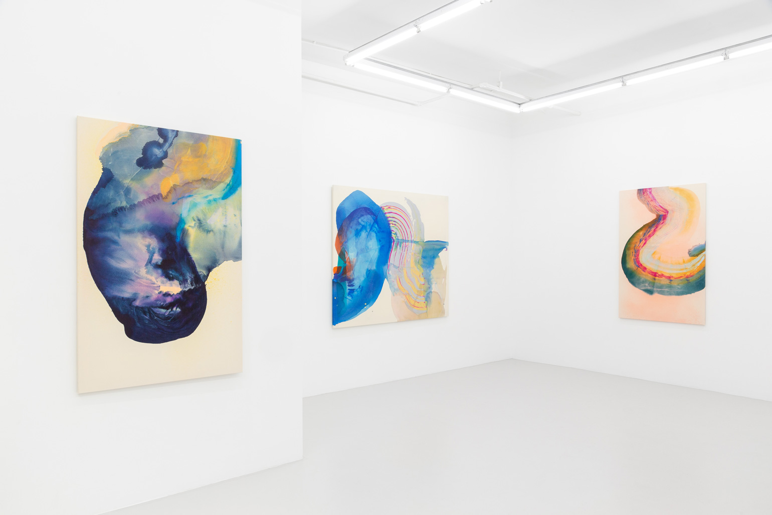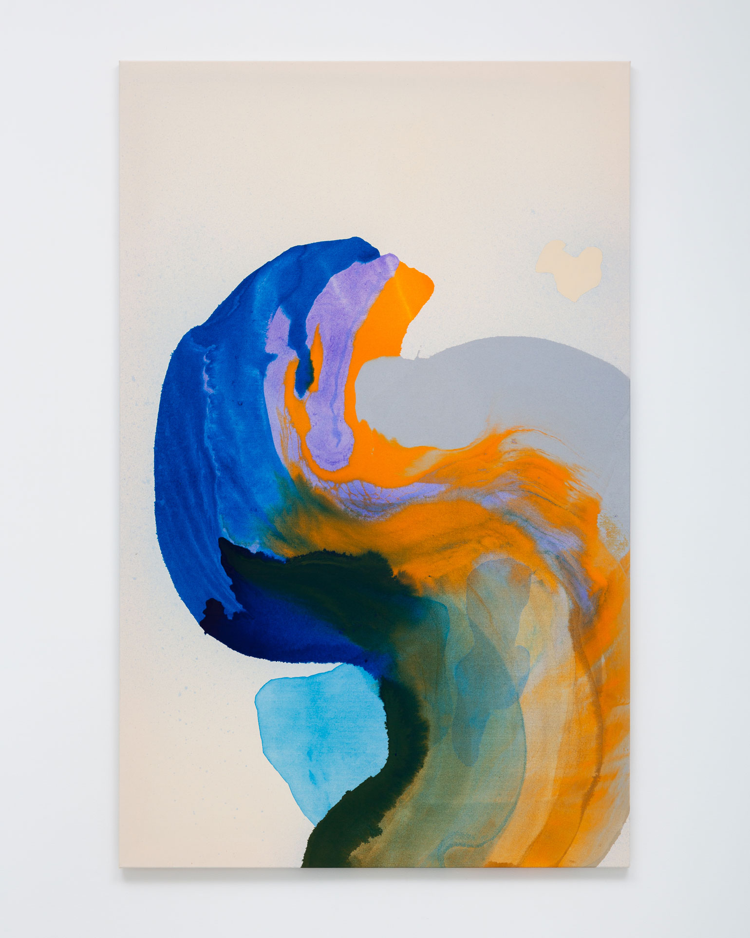 However much the paint in Bley’s works appears to be in motion, it hardly ever drips. The paintings are completed on the floor of the artist’s studio following a process of sketching and careful color selection in smaller formats. The canvases, resting larger than their finished, stretched selves, are primed before the first layer of paint is applied – often a semi-transparent shape that serves as the paintings’ grounding, while subsequent layers are sprayed or poured onto the tightly-woven sailcloth. The paint is then dragged, distributed and shaped by the artist’s spatulas, rulers, brushes or, sometimes, her own hands.