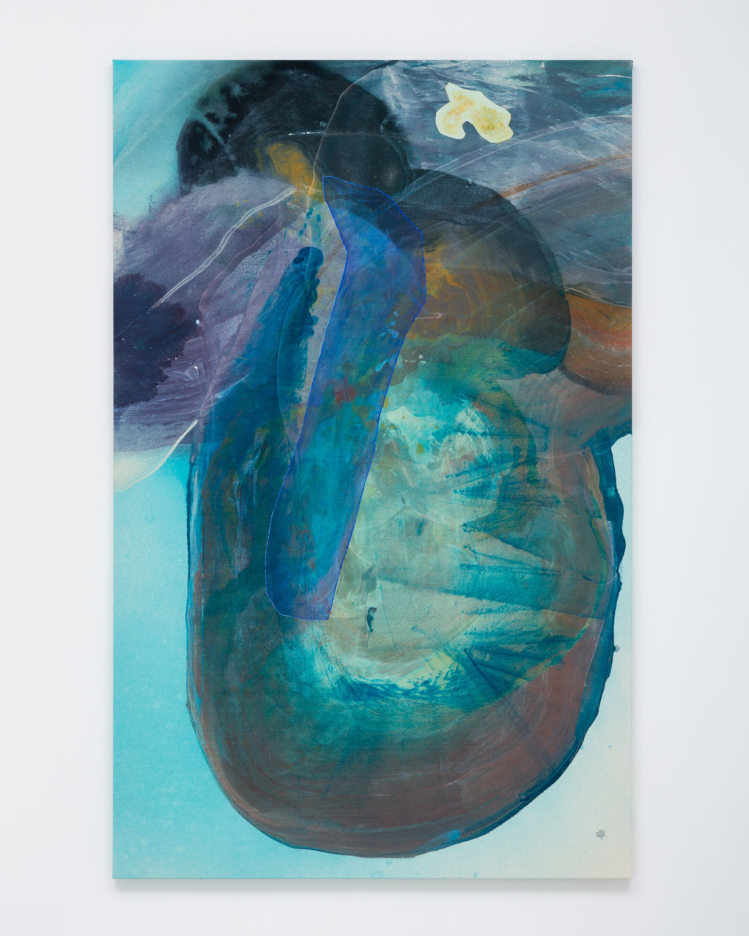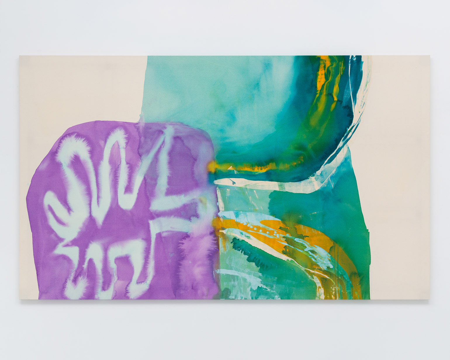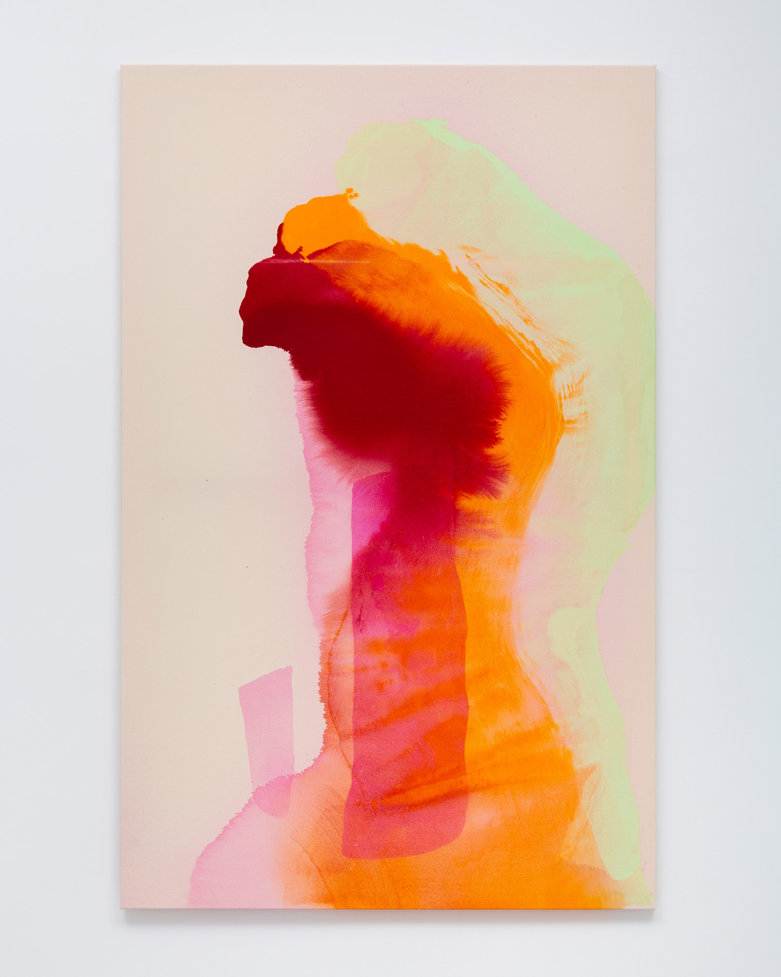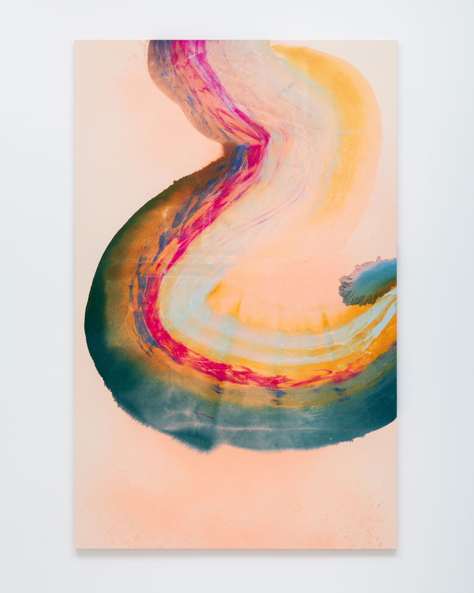 However much the paint in Bley’s works appears to be in motion, it hardly ever drips. The paintings are completed on the floor of the artist’s studio following a process of sketching and careful color selection in smaller formats. The canvases, resting larger than their finished, stretched selves, are primed before the first layer of paint is applied – often a semi-transparent shape that serves as the paintings’ grounding, while subsequent layers are sprayed or poured onto the tightly-woven sailcloth. The paint is then dragged, distributed and shaped by the artist’s spatulas, rulers, brushes or, sometimes, her own hands.