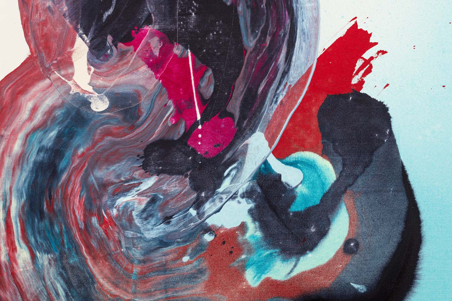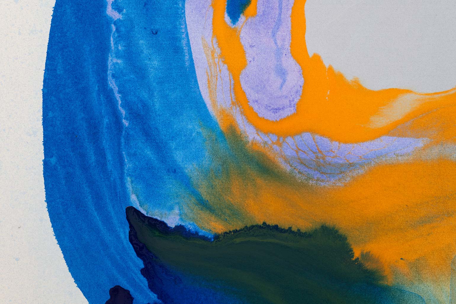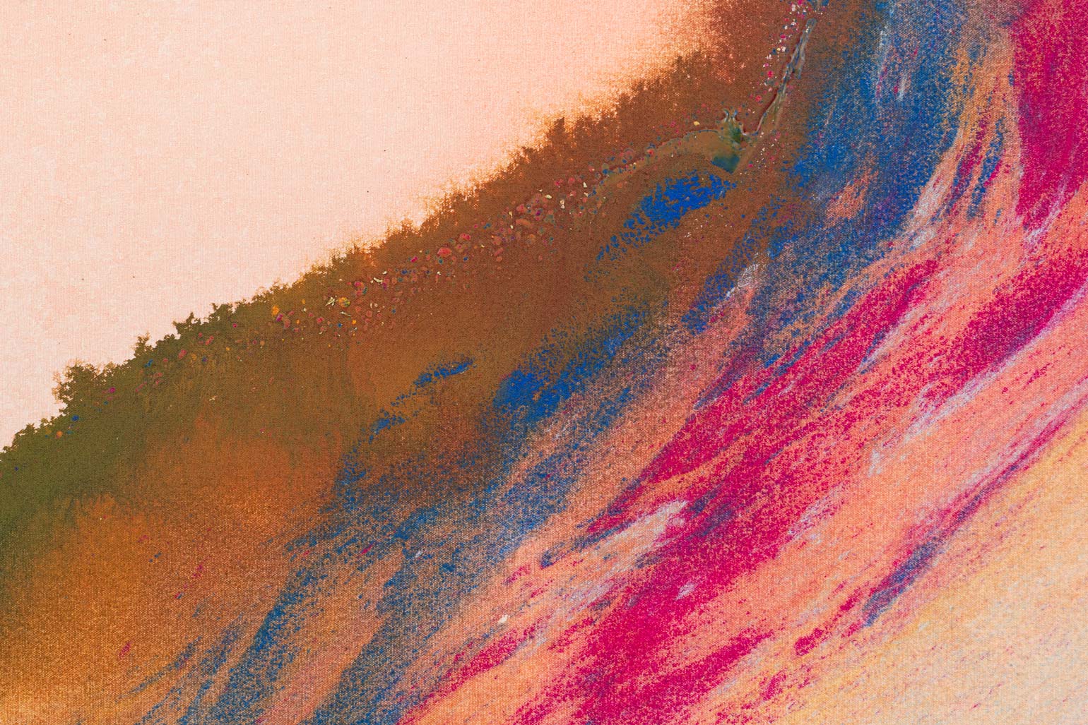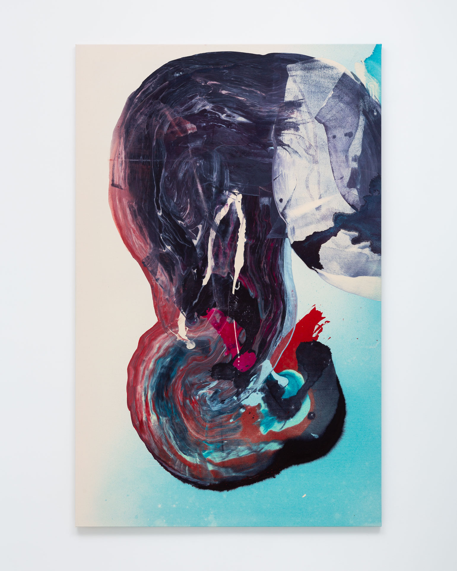 However much the paint in Bley’s works appears to be in motion, it hardly ever drips. The paintings are completed on the floor of the artist’s studio following a process of sketching and careful color selection in smaller formats. The canvases, resting larger than their finished, stretched selves, are primed before the first layer of paint is applied – often a semi-transparent shape that serves as the paintings’ grounding, while subsequent layers are sprayed or poured onto the tightly-woven sailcloth. The paint is then dragged, distributed and shaped by the artist’s spatulas, rulers, brushes or, sometimes, her own hands.