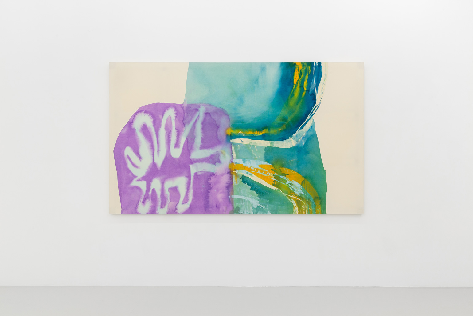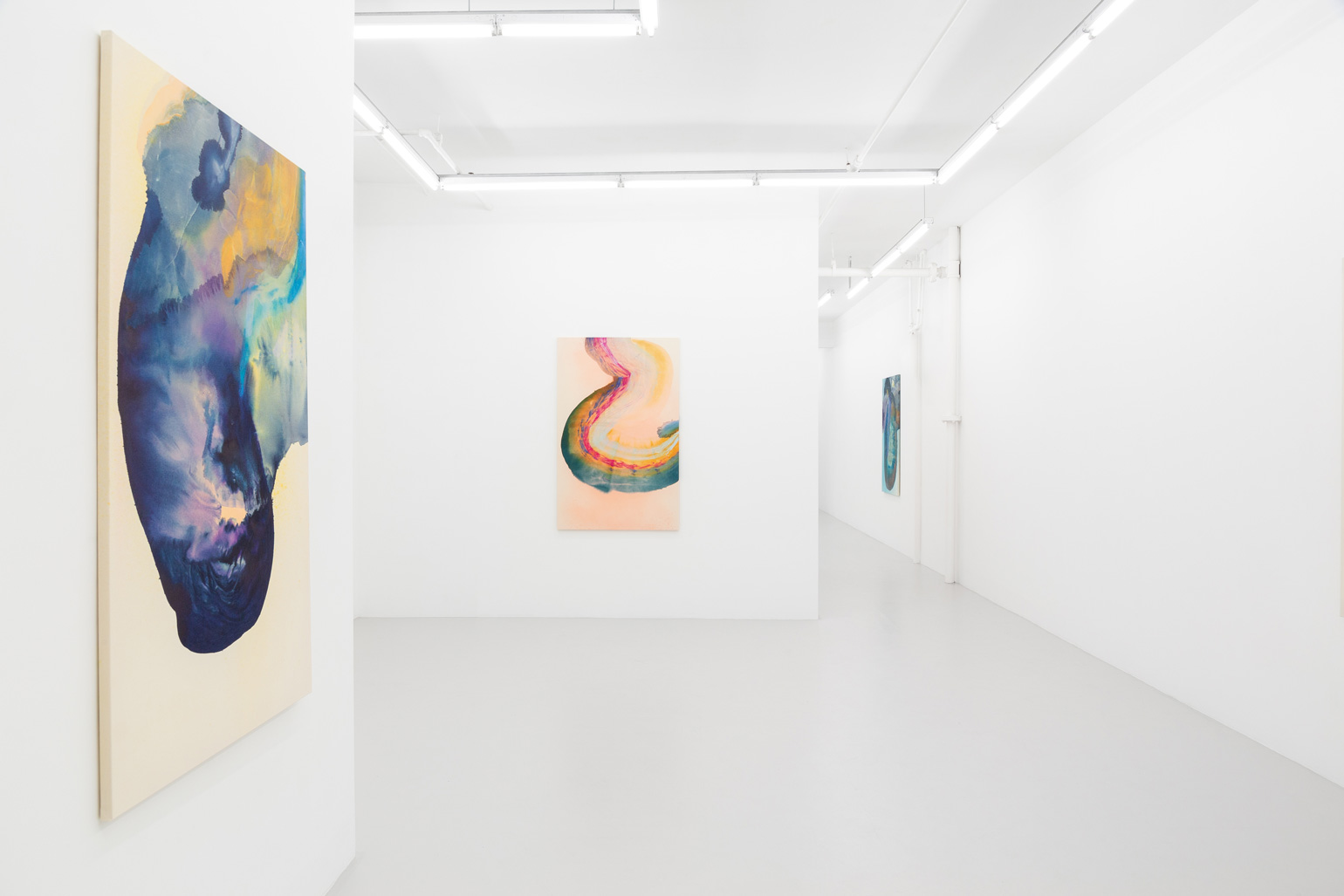 While visually reminiscent of watercolor pigments, the technique was pioneered by Helen Frankenthaler in the 1950s, in the artist’s soak-stained paintings. Like Frankenthaler, Ragna Bley is a highly skilled manipulator of paint, yet by allowing her pigments to act in large accordance with their will, Bley foregoes the claim of complete command over the finished product – a subtle undercutting, one could argue, of the egocentric, male genealogy of much modernist art. In a similar vein, visible brushstrokes, the highly charged “the artist-is-present” of a painting, are more or less erased from the smooth surfaces of the canvases. In previous parts of her oeuvre, the artist’s willingness to submit her works to external forces has ample precedent: both in her 2016 installation for the UKS gallery in Oslo, and in her ANNO series for Malmö Konsthall, where pockets of natural colorants were sewn into several canvases mounted under the open sky and subject to wet Scandinavian weather. In Soundings, the gesture is more subdued, yet the paintings nonetheless stage a dissolution of human agency – arguably a dilution in itself – in the meeting between paint and water.