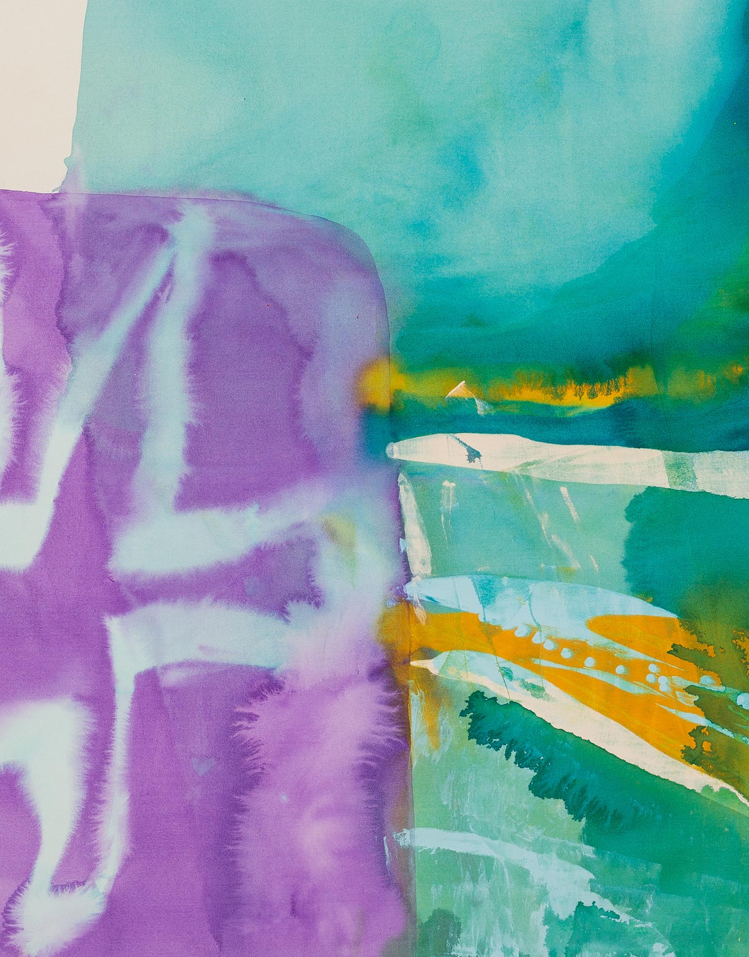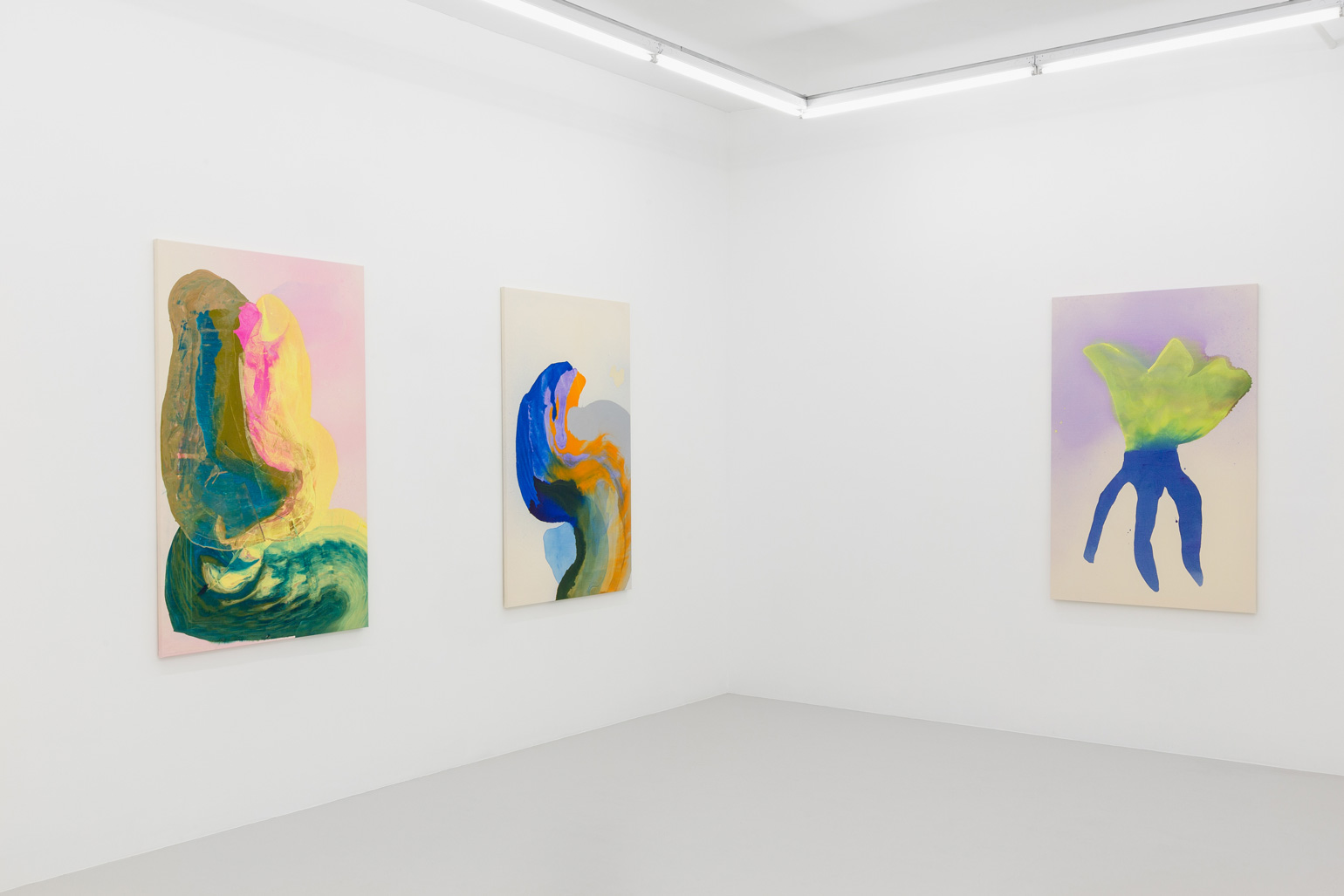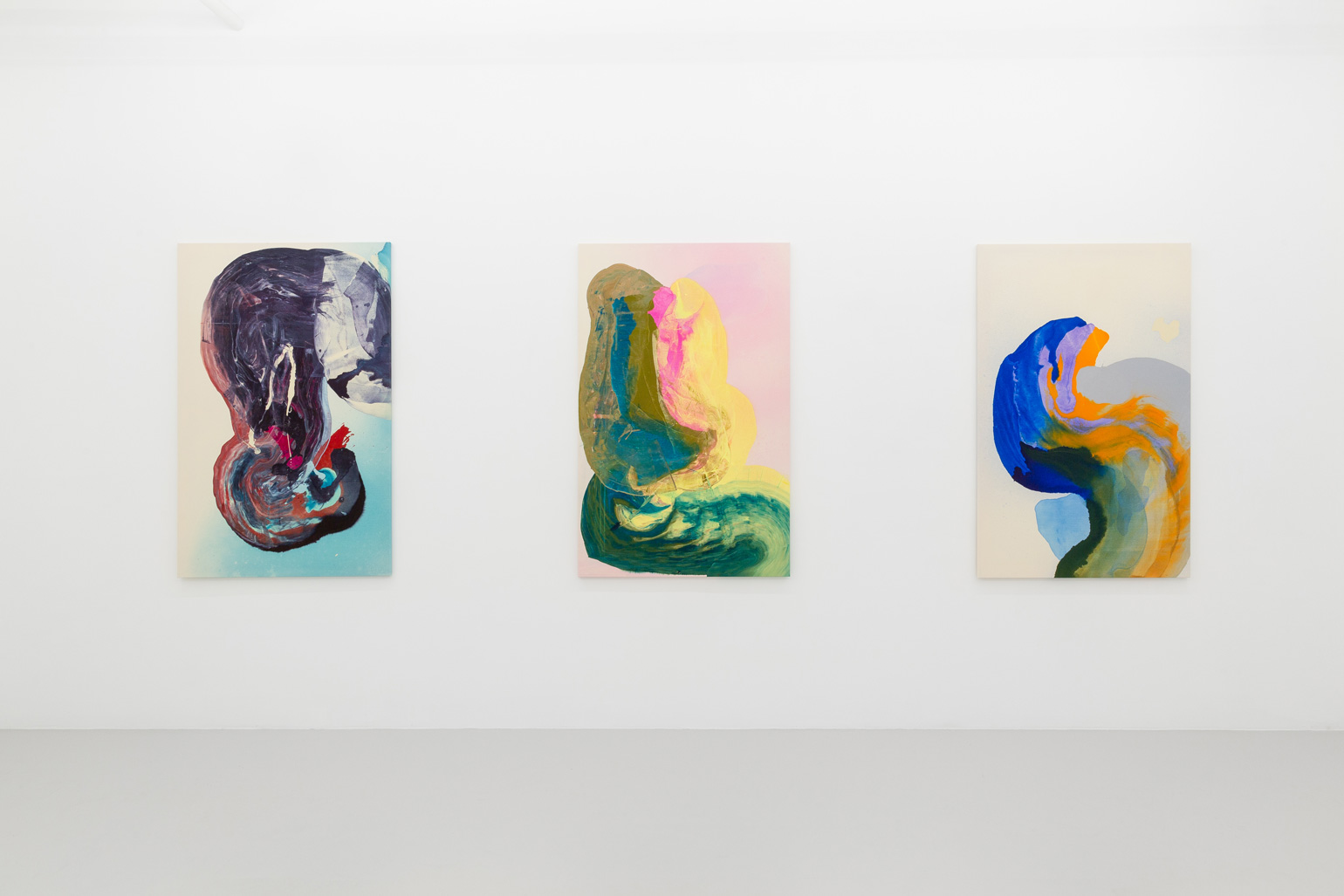 In Ragna Bley’s paintings, water is everywhere. It is one reason her works seem to be so animated, alive. In her newest series, the artist’s keen interests in marine biology intermarry with her taste for the fantastical – presenting visual mediations that squish the distance between the glittering ocean surface and the secrets of its vast depths. Thinned-out acrylic paint swirls and seeps across the canvases, with strips and overlapping fields of lambent color glowing like jewels on the ocean floor in one painting only to ooze forth as primordial soup in the next. In Pile, a rainbow of seaweed greens and magenta pinks hugs pale shades of greenish blues and dirty yellows; a potentially heady combination, yet the picture seems to float aloft, carried by the layered brilliance of the paint. In Evening, Pom-pom, writhing columns of black, blue, yellow, and pink erupt from a delicate pastel plinth like an underwater volcano, suggesting perfect poise between explosive energy and complete tranquility.