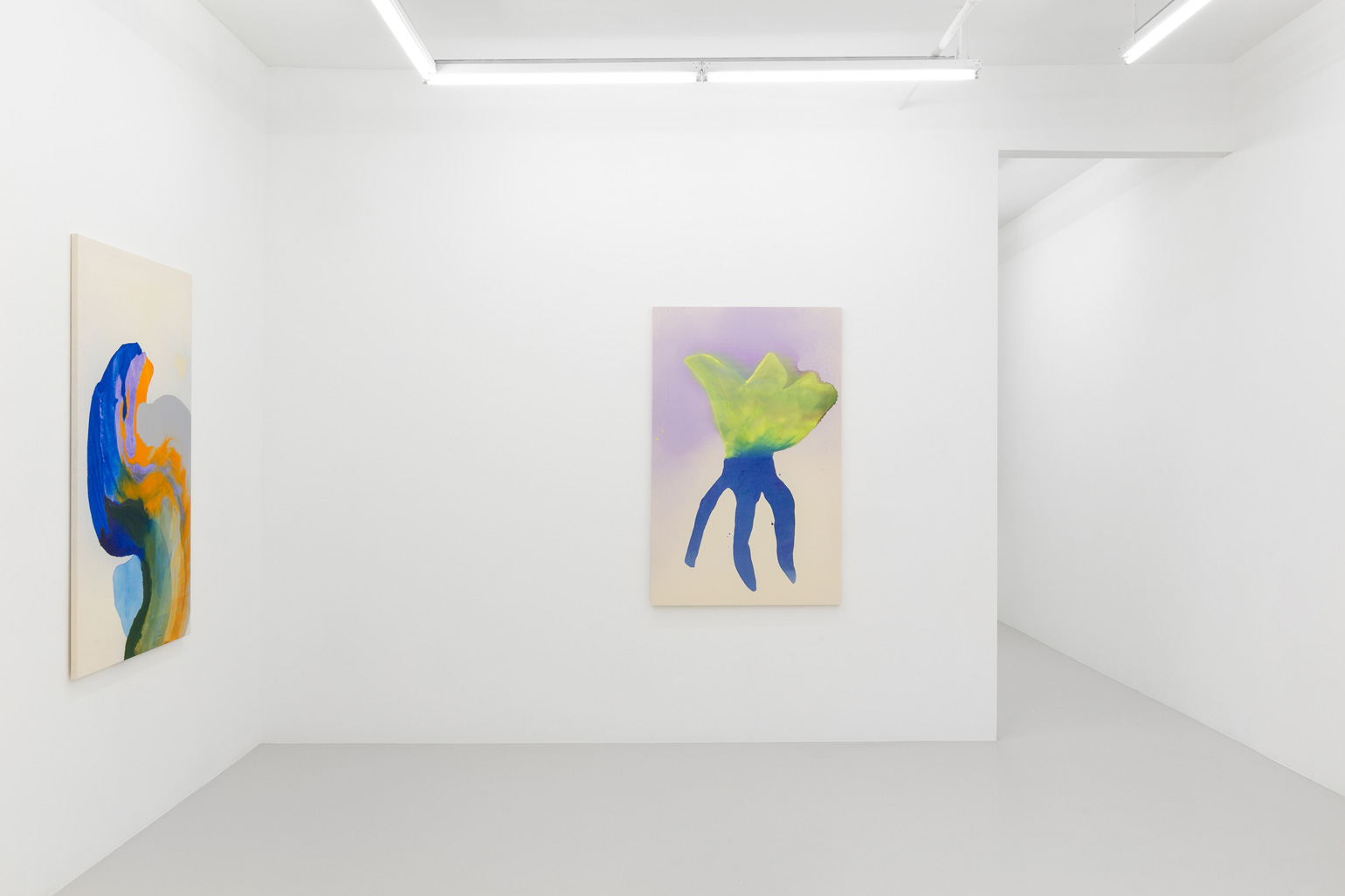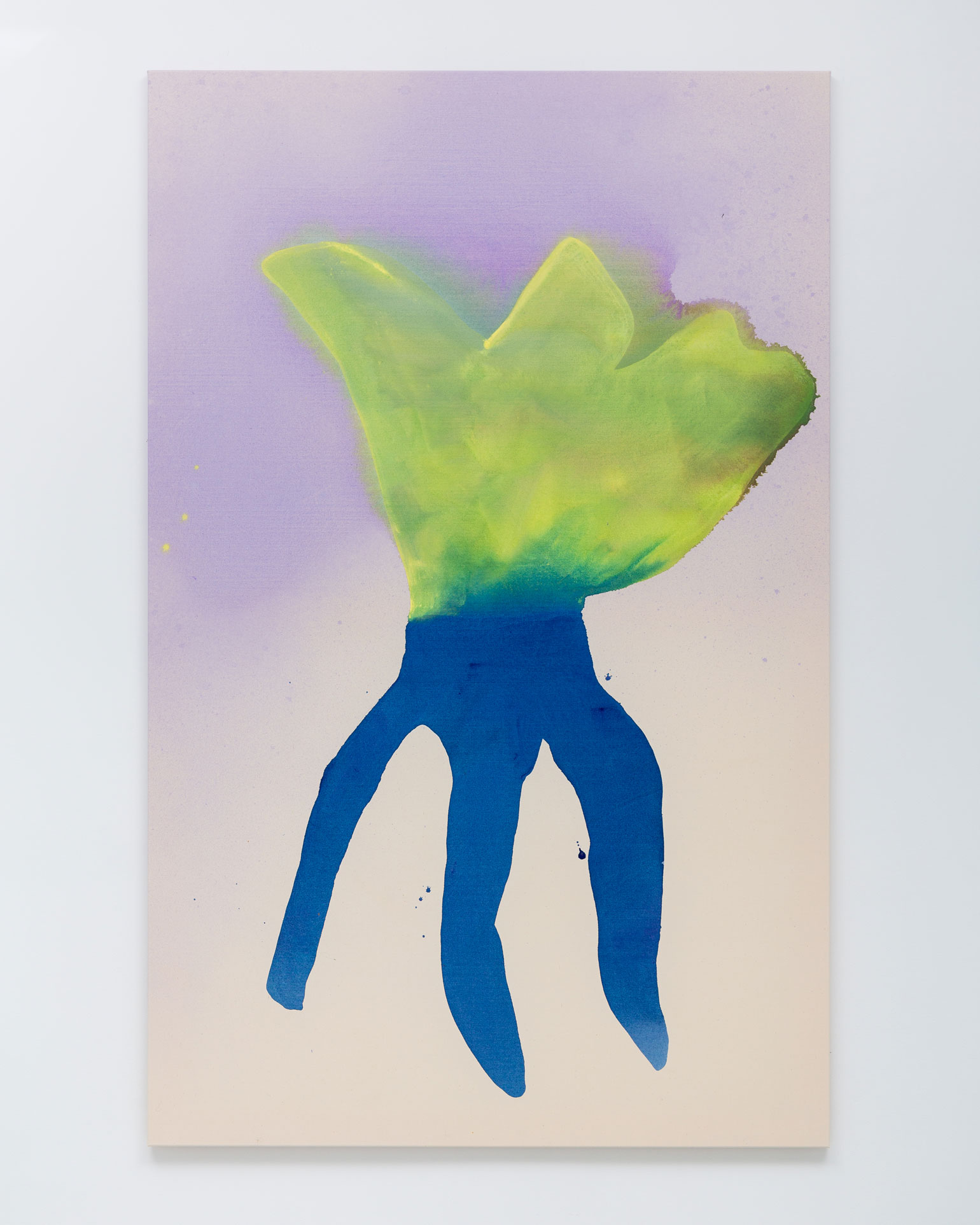 Ragna Bley, attuned to scientific journals and science-fiction alike, has in recent years introduced a series of organic shapes to her compositions, reminiscent of, but not reducible to, otherworldly creatures of the sea, ancient aquatic life forms and parasitic microorganisms. Neither pure shape nor drawn from life, the figures blur the line between abstraction and figuration. The large, multiarmed outline that hovers in the middle of a rich purple color field in Hurled Life looks distinctly like something – a fossil? a microbe? Impossible to pin down, it’s hard not to think the scale is somehow off, that it’s something tiny presented as something vast, sublime. In Vocal Low, orange and blue cylinders climb from a mossy green undergrowth, like worms or bacteria in a petri dish or the sinuous tentacles of some as yet unfathomed bioluminescent squid. There’s no one way to read these shapes and outlines, nor are the marine associations the only ones available for Bley’s paintings. Viewing the works in Soundings through such a lens allows one to see her sprawling universe of vibrant colors and fantastical forms as considerations on the deepest foundations of all living things, as well as on phenomena on the very outskirts of human reach. Rather than intimidated by a dark and unreachable beyond, Bley surfaces its secrets – pushing them to ripple and unfold.