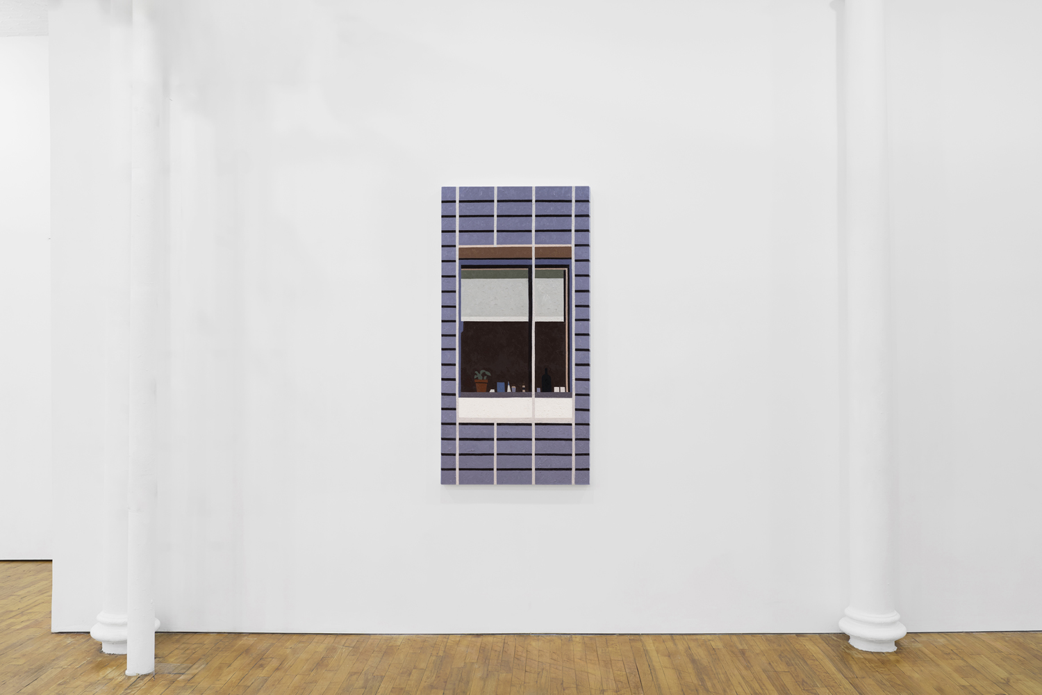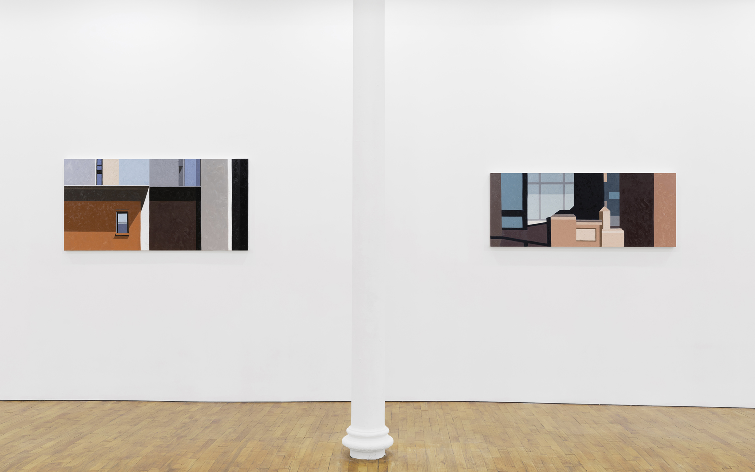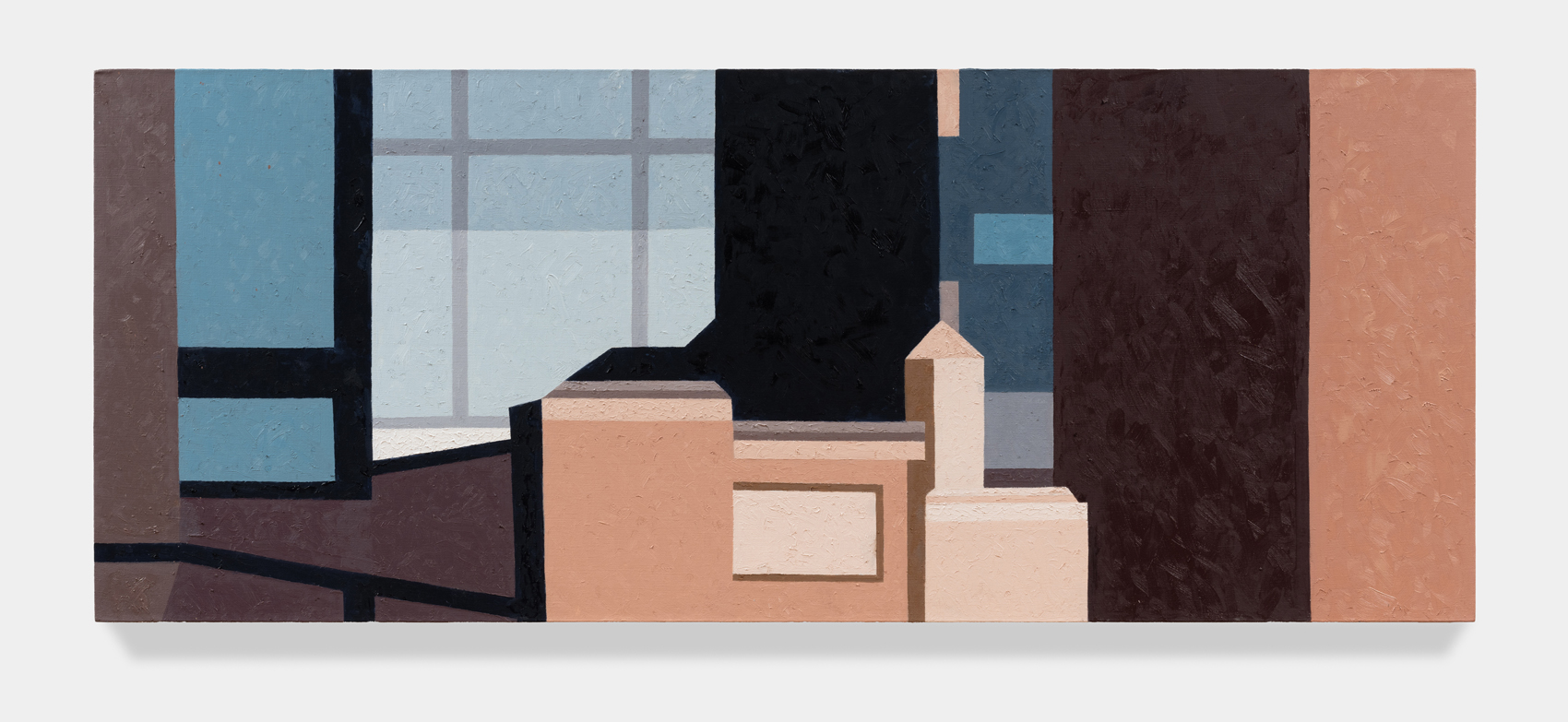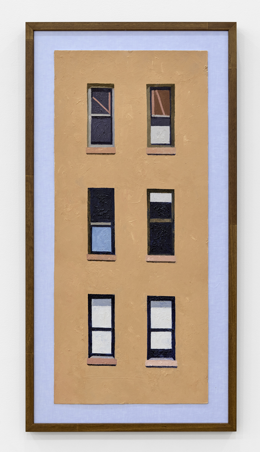 Manhattan Valley, titled after the neighborhood Winter now calls home, centers around a body of work the artist began producing in 2017. Inspired in part by Romare Bearden’s late career propensity for reduction, Winter has cast aside the mimetic virtuosity that often characterized his earlier work in favor of documenting the “cubistic” world we inhabit today, detailing the interactions between architectural space often taken for granted. Windows and walls, oblique angles, odd intersections, instances of incongruity gleaned from the urban landscape. One of the earliest works on view, P.S.93, 2018, elucidates this play of forms, paring an image of a Brooklyn school’s parking lot down to its essential representational components, to broad and dappled planes of color, remarkably brought together in a deceptively simple composition. As Winter’s biographer, the art historian Susie Kalil, has written, such works, seen as abstract patchworks, “are at once in motion and carefully puzzled together, seemingly both topographical and tapestry-like, with the exquisite touch of every painstaking brushstroke.”