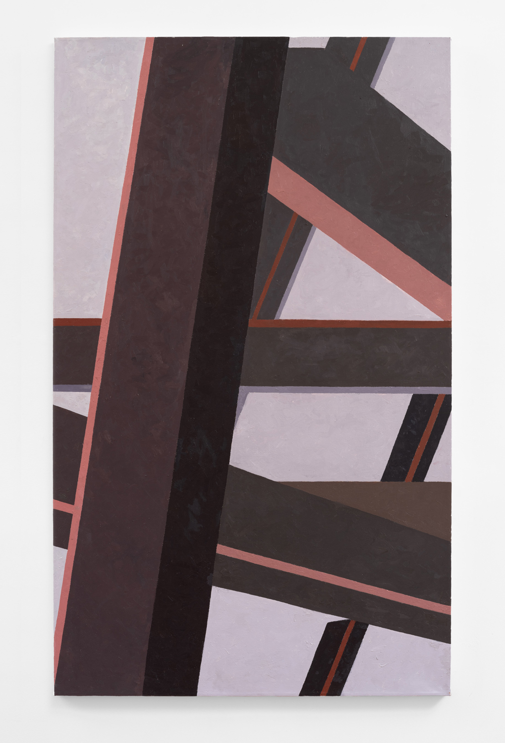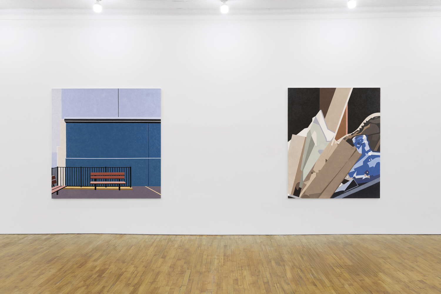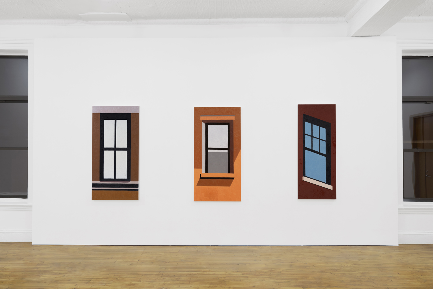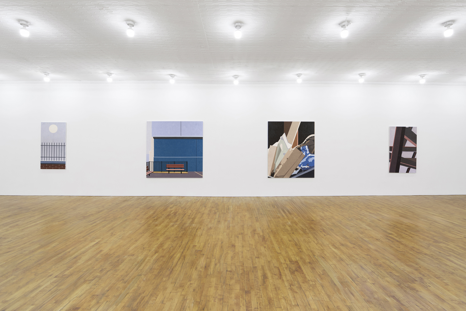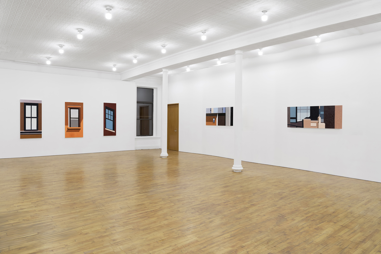 Manhattan Valley, titled after the neighborhood Winter now calls home, centers around a body of work the artist began producing in 2017. Inspired in part by Romare Bearden’s late career propensity for reduction, Winter has cast aside the mimetic virtuosity that often characterized his earlier work in favor of documenting the “cubistic” world we inhabit today, detailing the interactions between architectural space often taken for granted. Windows and walls, oblique angles, odd intersections, instances of incongruity gleaned from the urban landscape. One of the earliest works on view, P.S.93, 2018, elucidates this play of forms, paring an image of a Brooklyn school’s parking lot down to its essential representational components, to broad and dappled planes of color, remarkably brought together in a deceptively simple composition. As Winter’s biographer, the art historian Susie Kalil, has written, such works, seen as abstract patchworks, “are at once in motion and carefully puzzled together, seemingly both topographical and tapestry-like, with the exquisite touch of every painstaking brushstroke.”