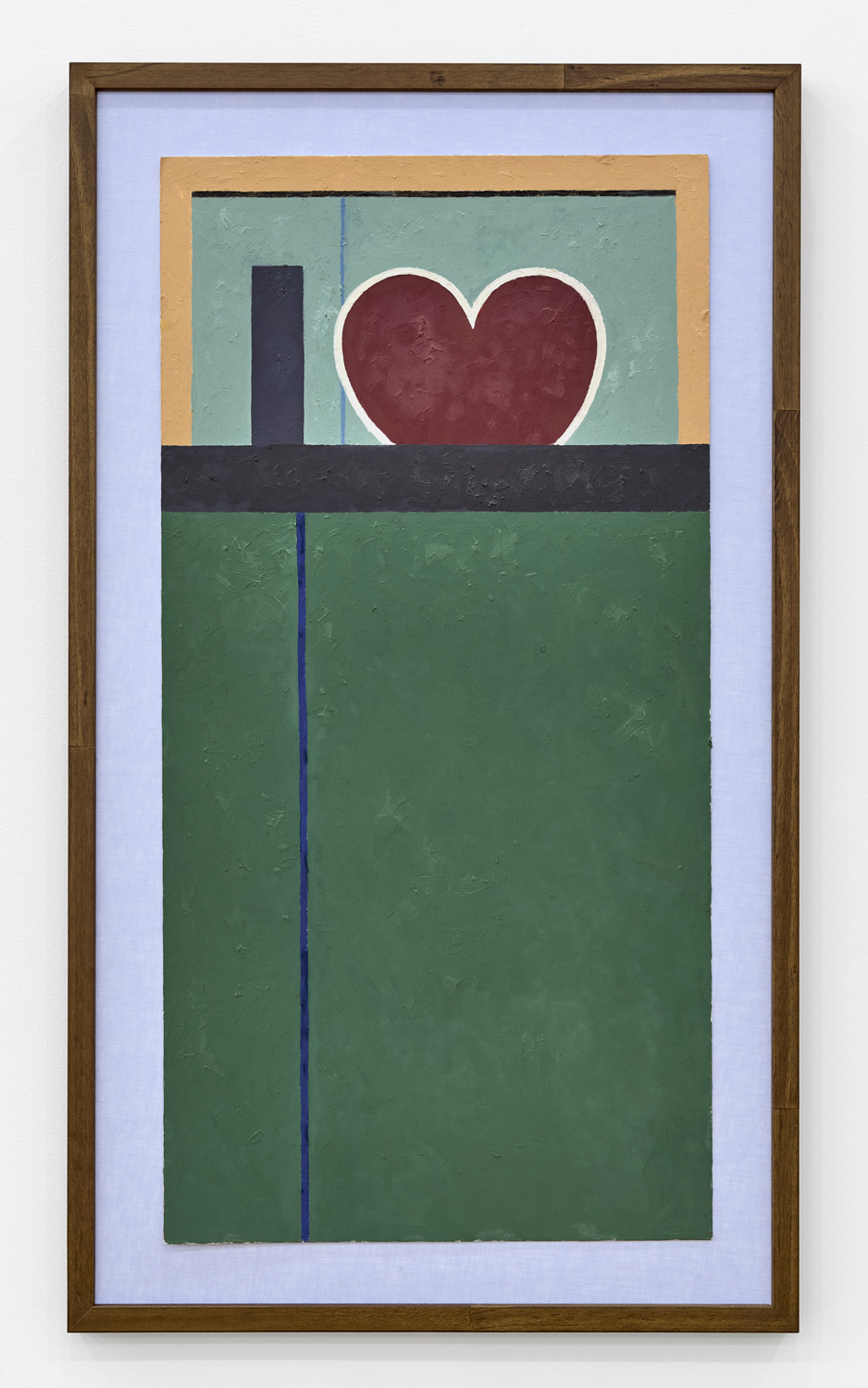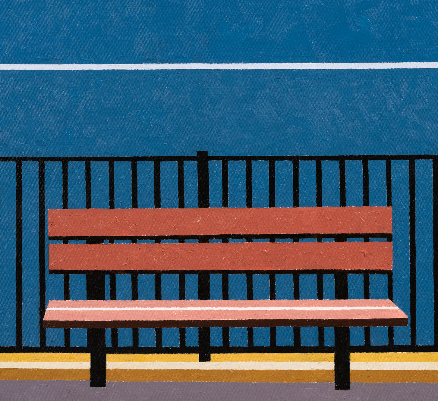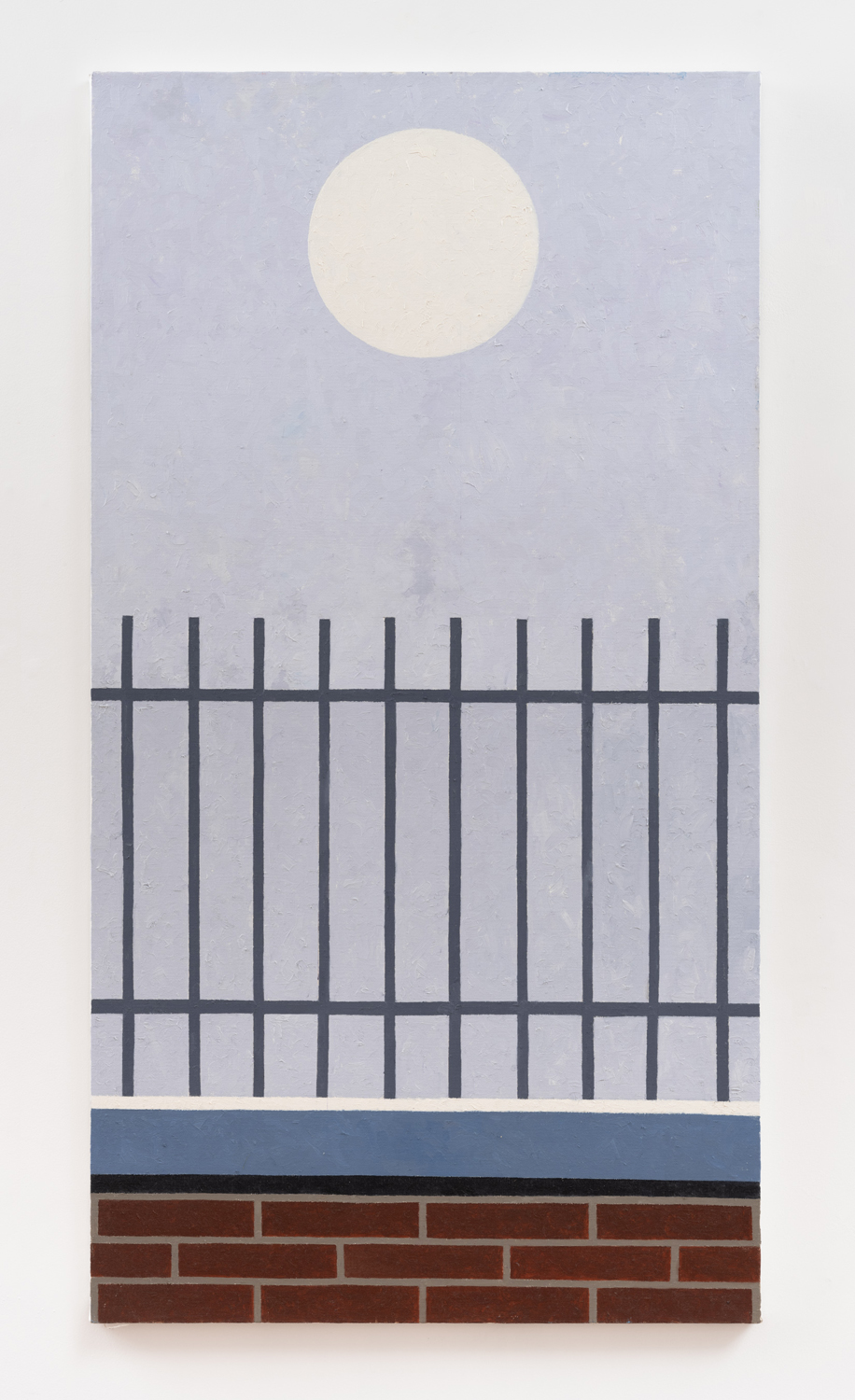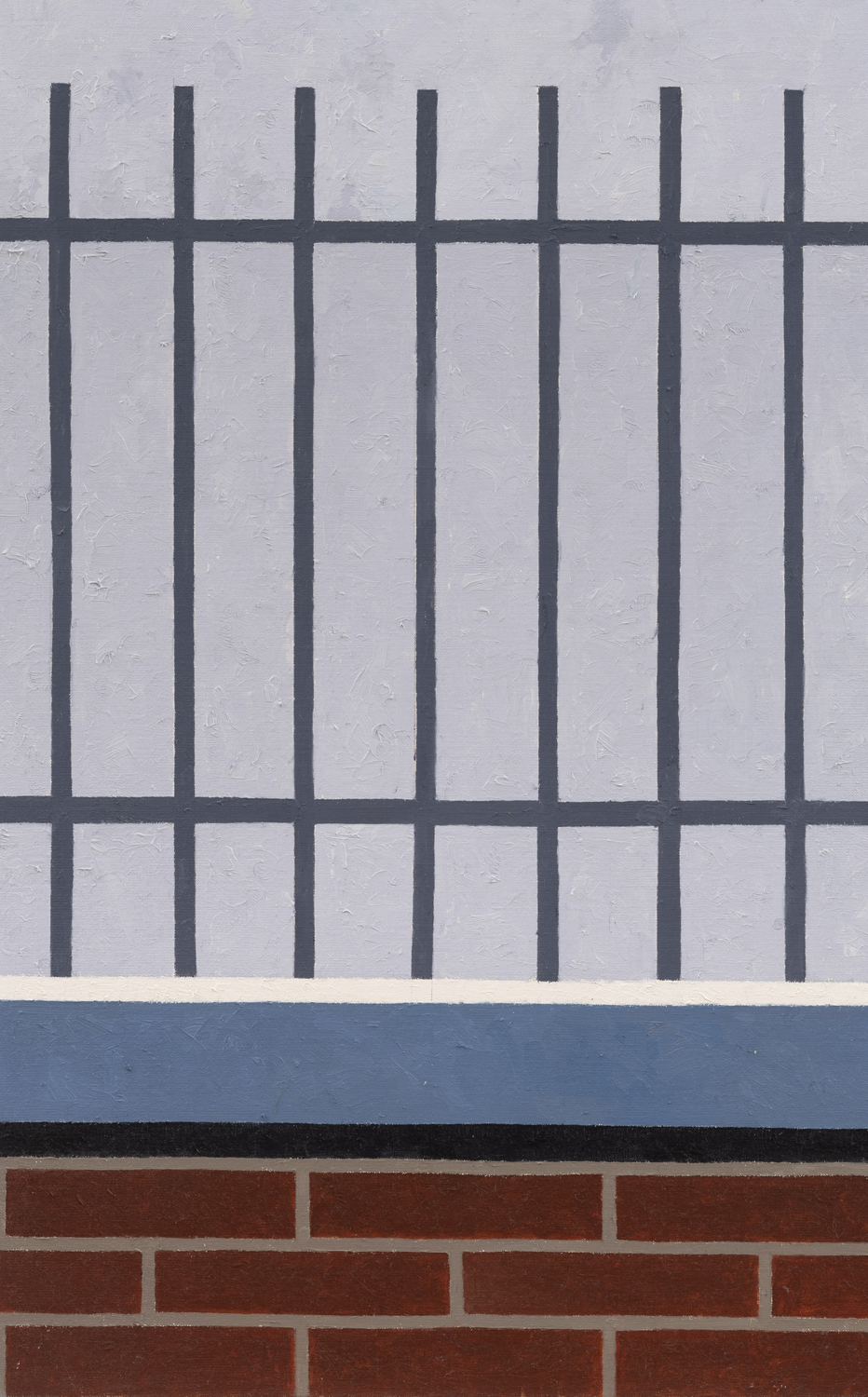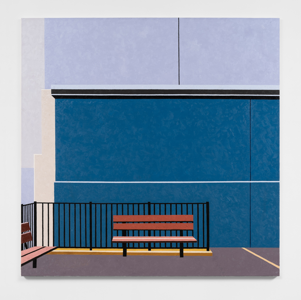 This richly textured surface, a product of the stippled brushwork that animates each work, has long been deployed by Winter as a means to undermine the mechanistic impulses performed by painting since Pop art, to insist upon a “painterly realism” even when working in the registers of Photorealism or distancing modes of abstraction. Against the deadpan tonal connotations often engendered by flatness in painting, as in the work of Ed Ruscha, the works on view attest to Winter’s enduring commitment to humanism, the indexical mark of the artist, to storytelling and personal anecdote. Yet in contrast to Winter’s earlier paintings, which have encompassed both portraiture and surreal evocations of subjective significance, the personal here often insinuates itself furtively. In memory of Jean, 2020 for example, dedicated to Winter’s late friend, the poet Jean Valentine, complicating what initially appears to be a partial depiction of an I Heart New York billboard, obstructed, perhaps, by the presence of a high-rise building, rendered in a soft shade of aquamarine. The pictographic heart – a sort of substitute for both New York and Valentine – disrupts the rigid geometry of the composition, bringing it back to the world.