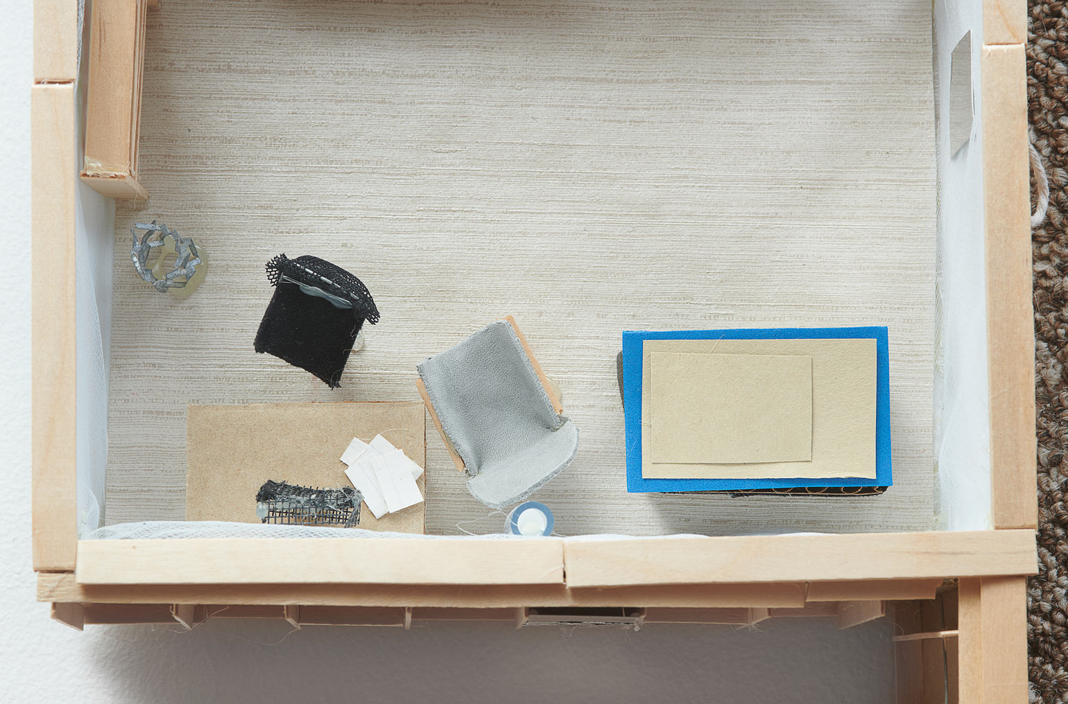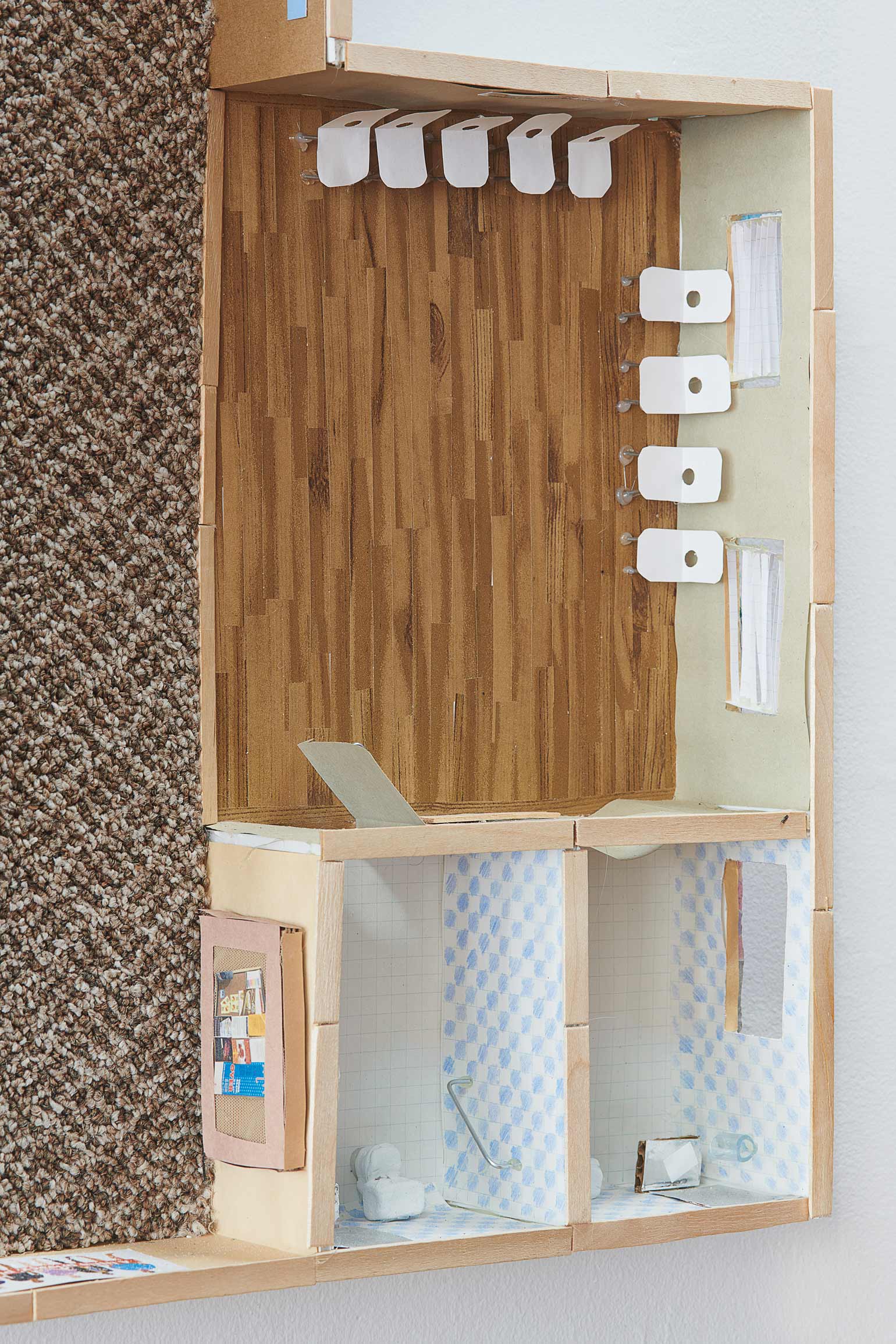 Douglas Watt, Clinic, 2019 (detail). Foamcore, textured spray paint, stir sticks, carpet, paper, cue cards, plasticine, coloured pencil, health & community information cards, metal mesh, leather, tule, inkjet prints, window screen, clothing tag, acrylic, beads, sequins, vinyl shelf lining, lycra micromesh, string, pencil, popsicle sticks, hot glue, vinyl tube, wire, 40 1/2 × 23 1/4 × 3 1/8 inches / 103 × 59 × 8 cm