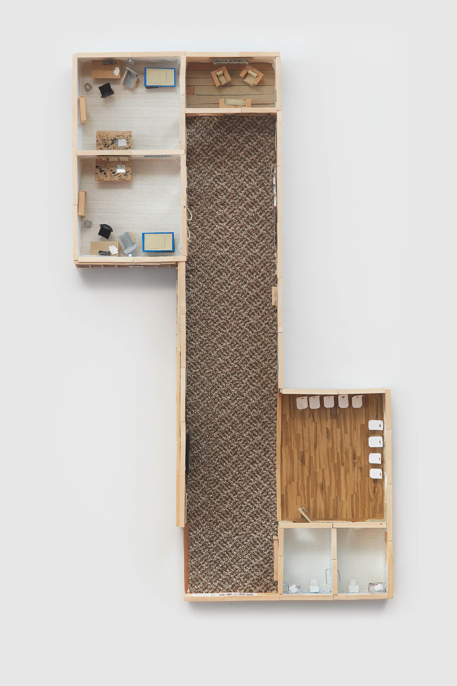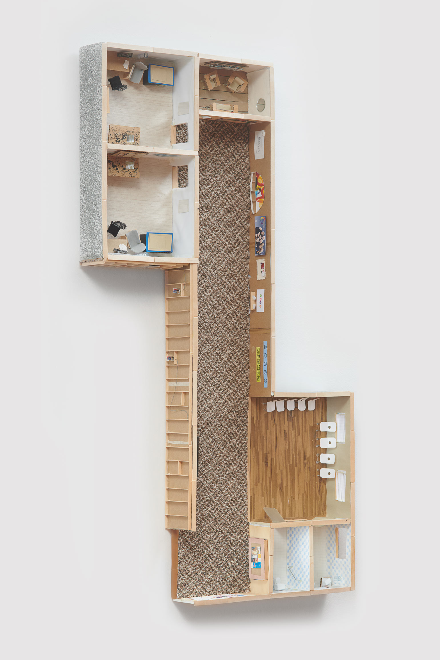 Douglas Watt, Clinic, 2019 (alternate view). Foamcore, textured spray paint, stir sticks, carpet, paper, cue cards, plasticine, coloured pencil, health & community information cards, metal mesh, leather, tule, inkjet prints, window screen, clothing tag, acrylic, beads, sequins, vinyl shelf lining, lycra micromesh, string, pencil, popsicle sticks, hot glue, vinyl tube, wire, 40 1/2 × 23 1/4 × 3 1/8 inches / 103 × 59 × 8 cm