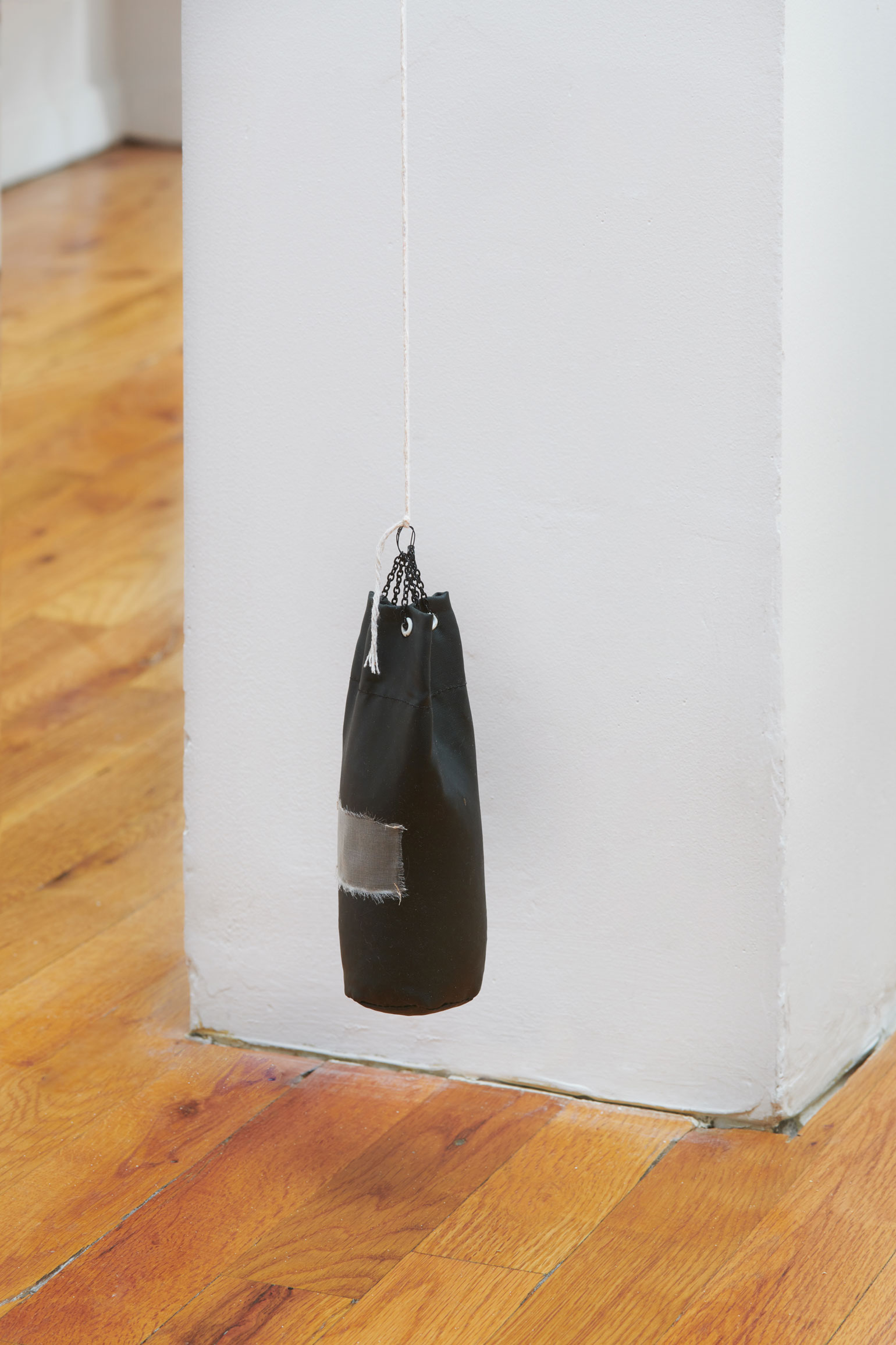 Douglas Watt, Punching Bag/Counter Weight, 2019. Nylon, eyelets, lentils, organza, string, thread, eyelet screws, necklace chain, Dimensions variable