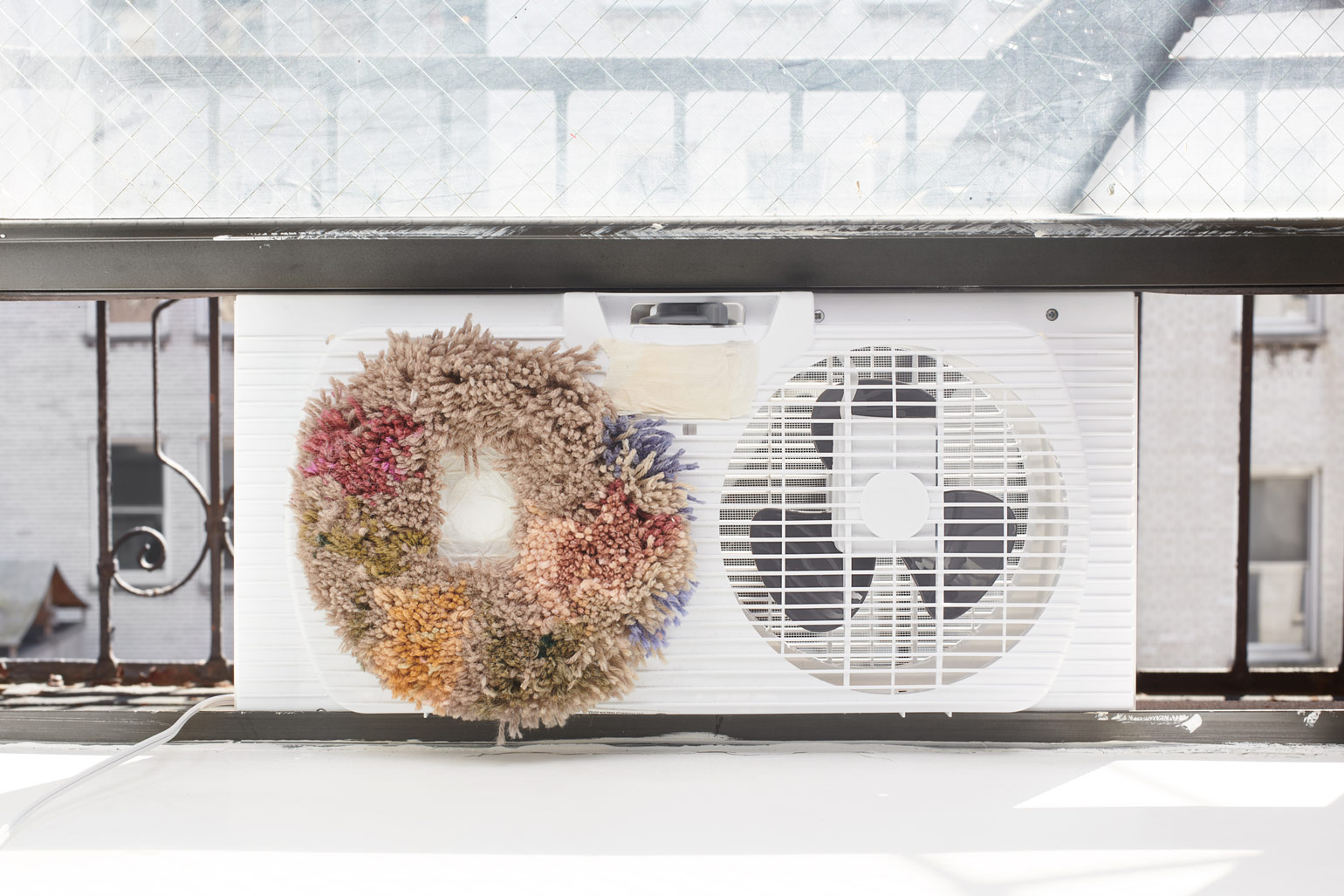 Justin Chance, Hver dag, 2021. Dyed and piled wool, portable twin window fan and cooling unit, masking tape, Kleenex, tea, 11 1/2 × 33 × 3inches / 29,2 × 83,8 × 7,6 cm