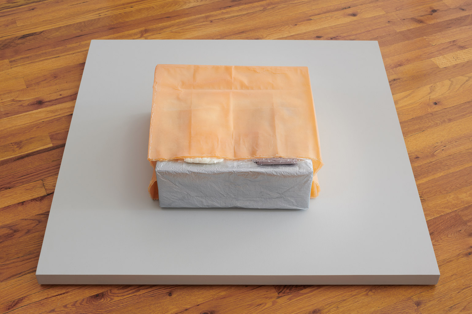 Liz Magor, Hosiery (Tangerine), 2015. Silicone rubber, glassine, nylon stockings, 5 × 16 × 141/2 inches / 12,7 × 40,6 × 36,8 cm