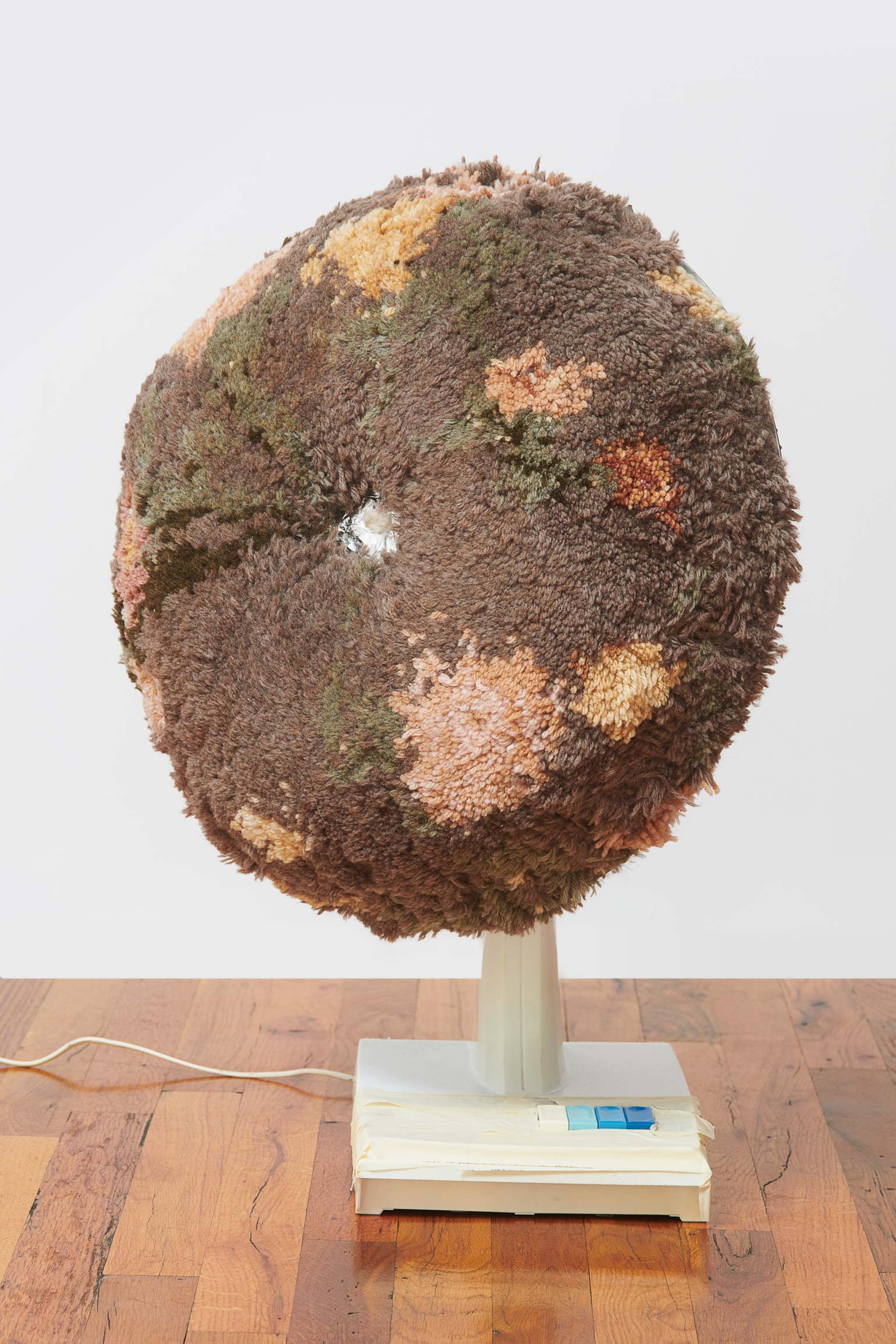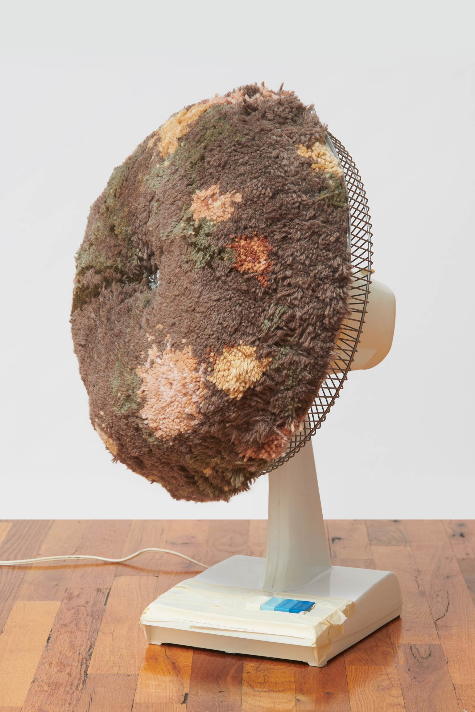 Justin Chance, Kitchen, 2019. Dyed and piled wool, desk fan, aluminium, tea, 22 × 15 × 6 inches / 55,9 × 38,1 × 15,2 cm