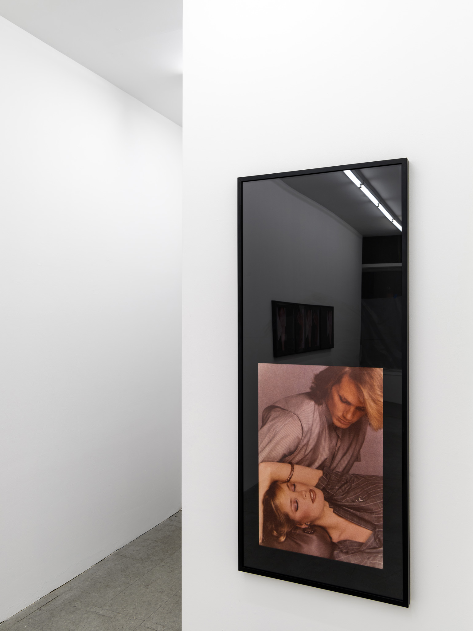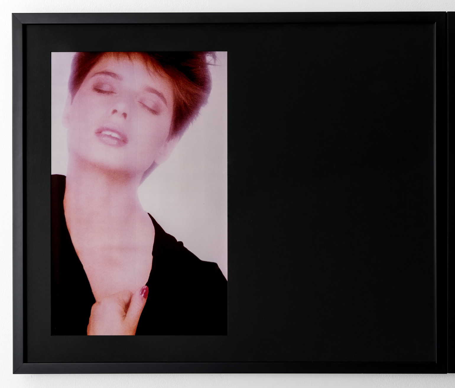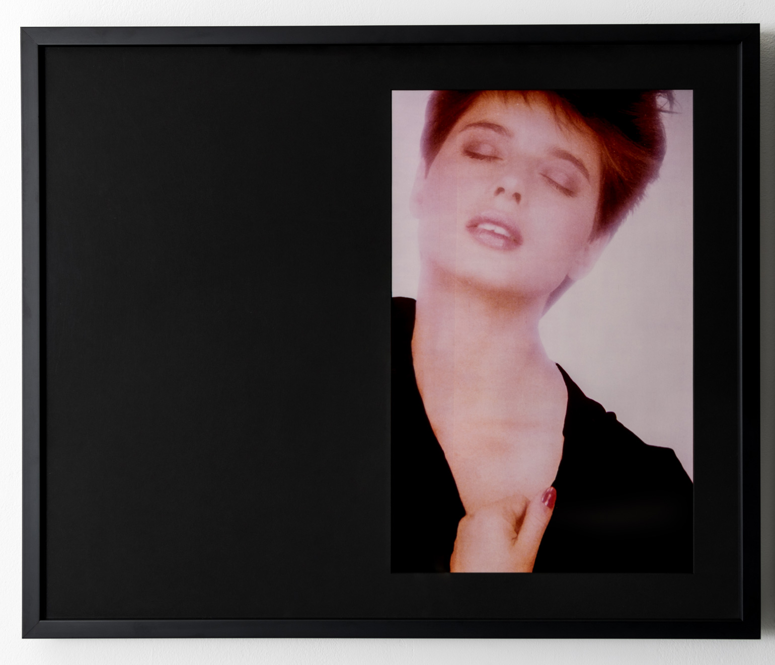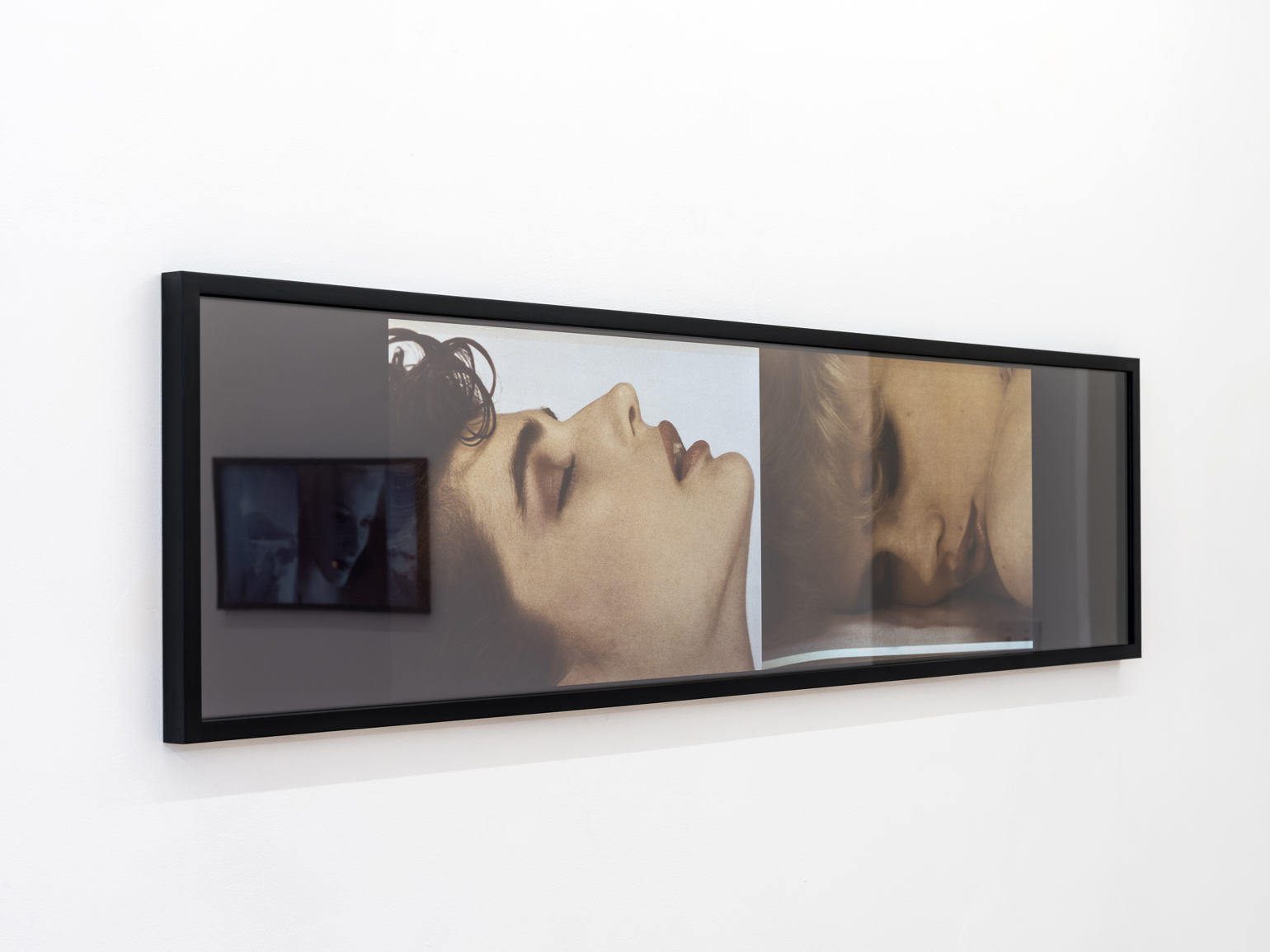 While Alexander showed with Pictures artists in venues such as The Barbican, Dia Art Foundation, ICP, Kunsthalle Bern, White Columns, and the Whitney Museum, she was a decade younger than most involved in the movement. Further marking her apart from her peers, she came to New York fresh from university at Nova Scotia College of Art and Design, bypassing the American conceptual schools that many Pictures artists attended. Like Pictures artists such as Jack Goldstein and Troy Brauntuch, Alexander collaged mass media imagery within her own practice. Yet perhaps uniquely, her work highlighted the relationship between the viewer’s body and the framed photograph. Brazenly elevating a fashion ad to the nobility of a masterpiece is her work “Pieta” (1981), which takes its name from the Michelangelo sculpture that depicts Jesus on the lap of Mary after his crucifixion. Alexander’s version, a gender reversal of the classical sculpture, blows up a fashion campaign featuring a coiffed blonde male model looking down at a woman in a soft embrace. The image is framed within a black, figure-sized matt and a sheet of highly reflective Plexiglas. Walking up to the work, the viewer notices their reflection, superimposing their own everyday image with that of the “ideal” model. Similarly, “Ecstasy” (1982) references the baroque marble sculpture “The Ecstasy of St. Theresa” (1647-52) by Gian Lorenzo Bernini, and as such features repeating images of a seemingly orgasmic Isabella Rosselini. Characteristically, Alexander framed these successive images in a long rectangular formation with highly reflective Plexiglas covering a black matt. The repeated imagery and historical reference signifies a continuum; in knowing contrast with the distinctiveness of its format, it calls upon an archetype that recurs ad inifinitum throughout time.