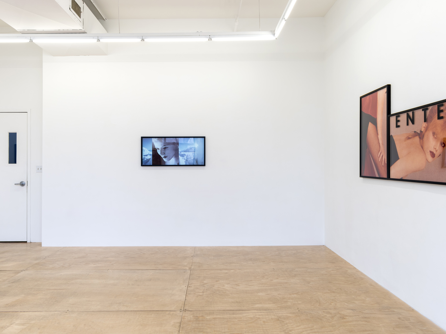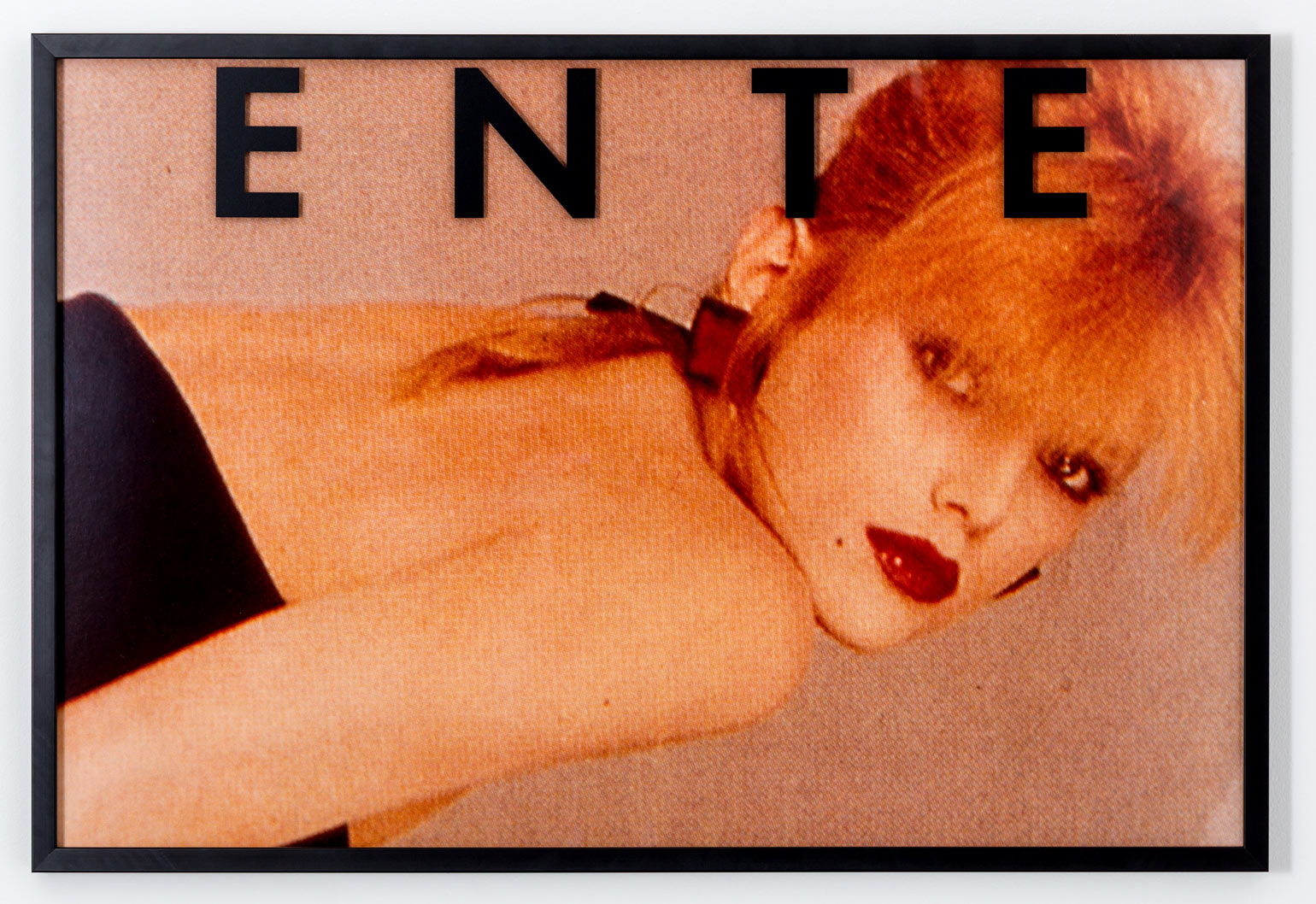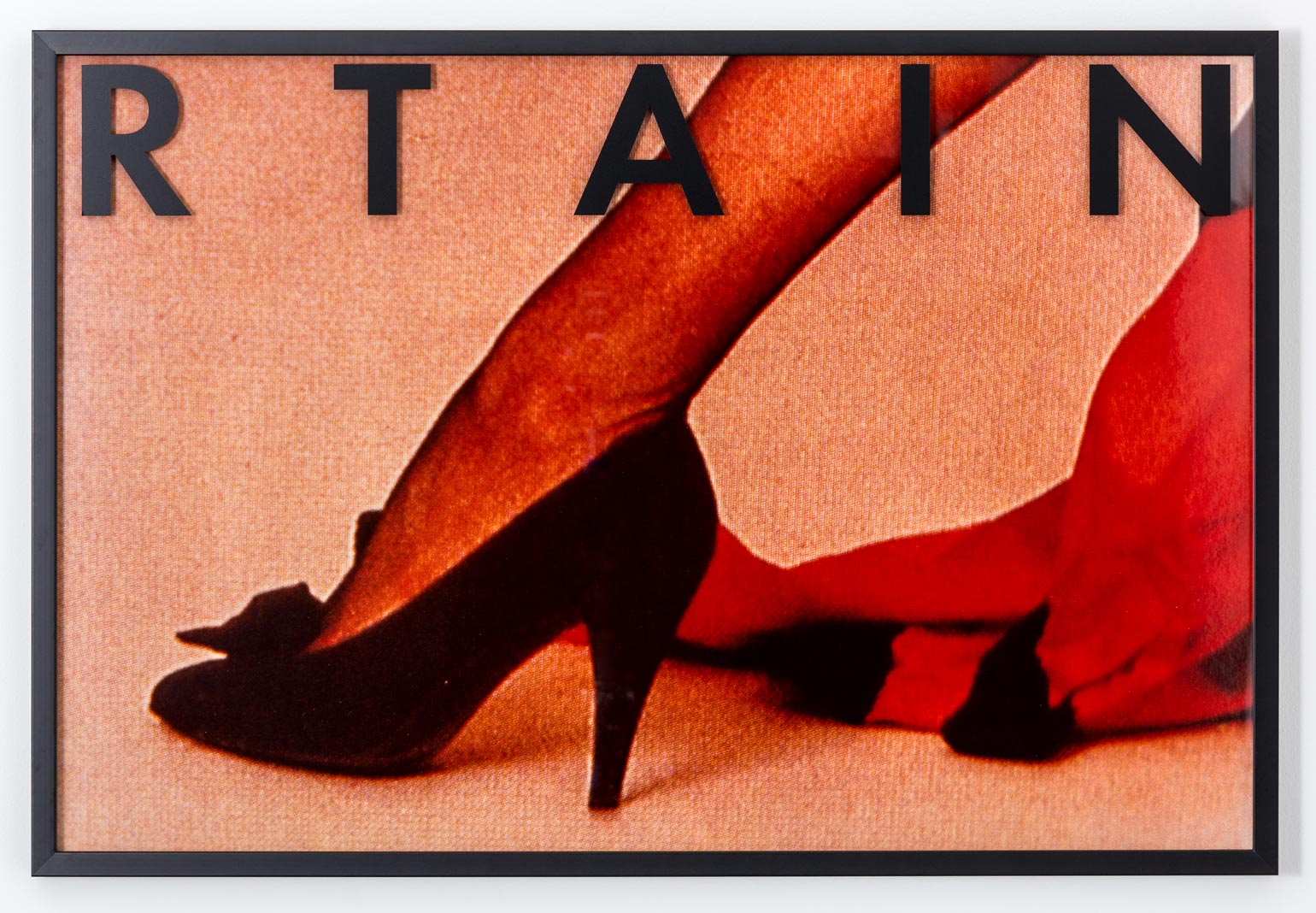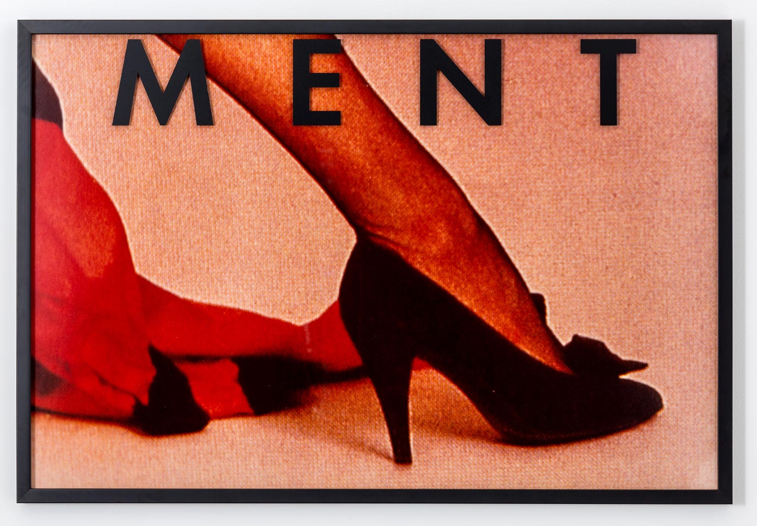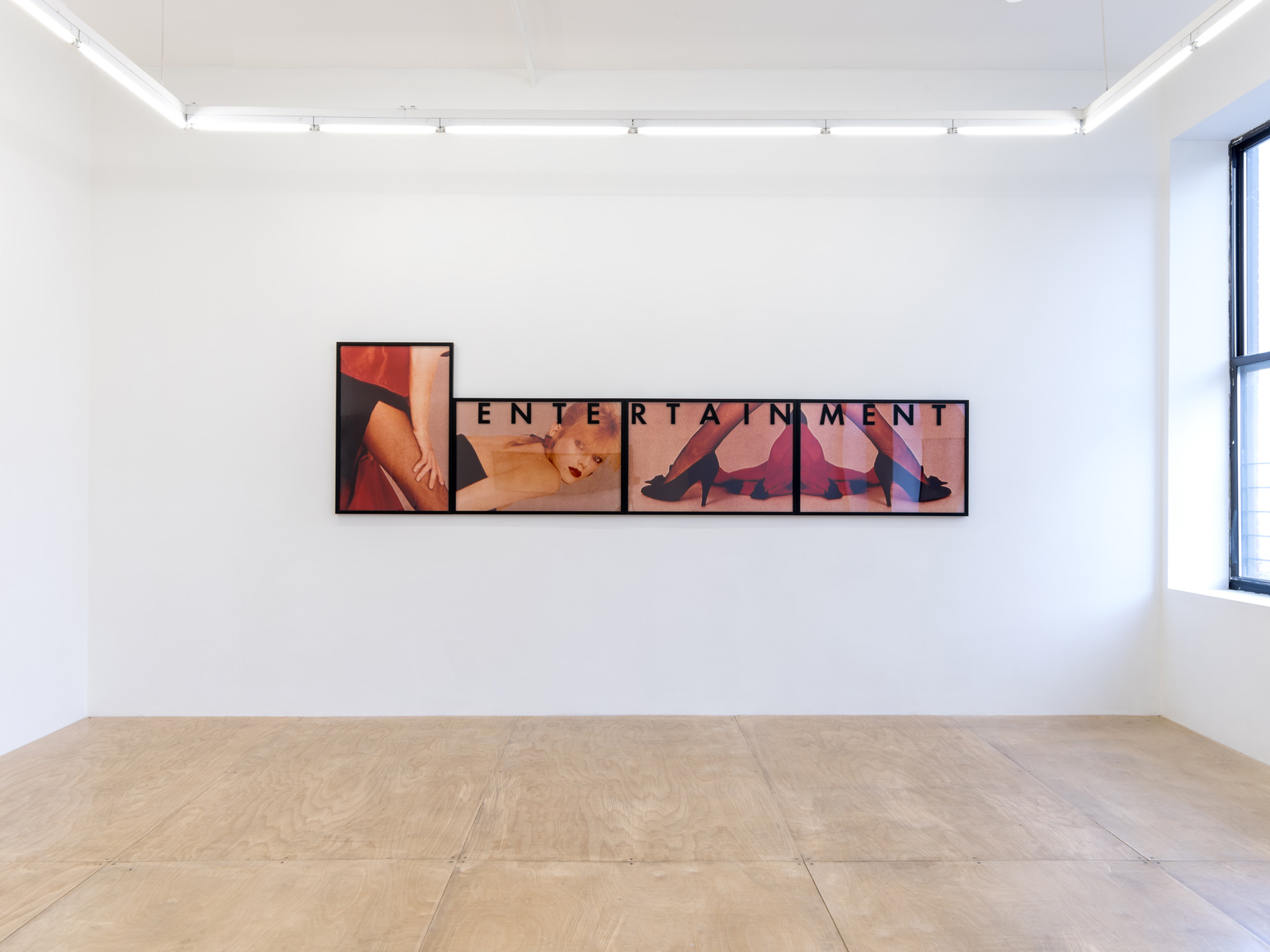 Vikky Alexander is often introduced as a sleeper Pictures Generation artist, though she never seamlessly fit into that mostly male circle. Active in New York in the early 1980s, Alexander appropriated commercial photography, her work blowing up cropped images of actresses and models from magazine campaigns. “Entertainment” (1983), for example, juxtaposes four enlarged images from a fashion spread: a cropped leg that appears conspicuously as big as the model’s nearby arm, a heavily made-up woman looking over her shoulder, and a pair of feet mirroring each other, creating a wide tunnel. Above these images, the word “entertainment” is writ large and points to the role of the passive female body as a consumable site of pleasure within these images.