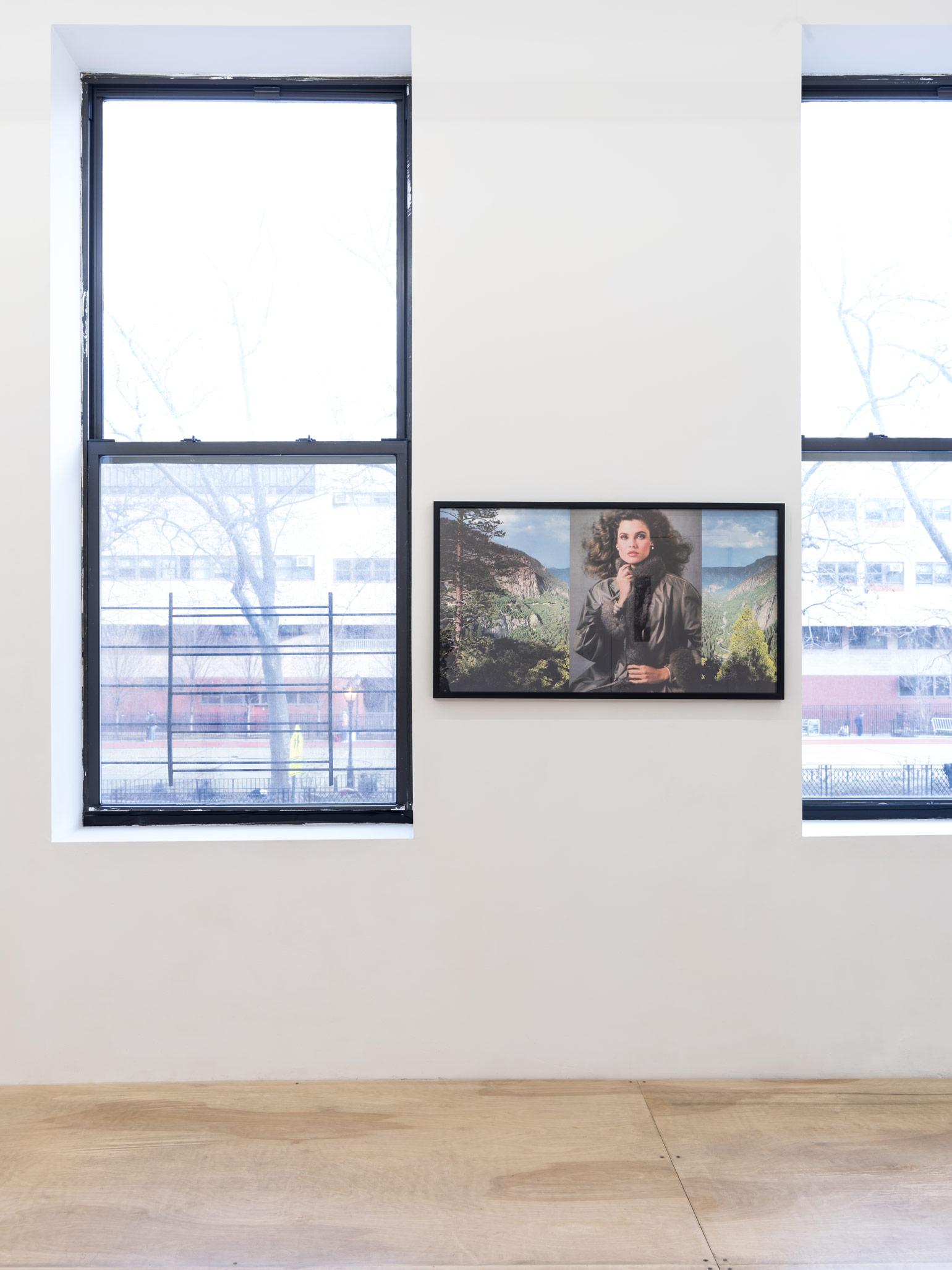 Also visible in these works due to the extreme enlargement of their source material is the images’ photo grain, highlighting the materiality of the analog photograph as a medium. Alexander was erstwhile deeply invested in the ongoing debate about the legitimacy of photography as a fine art medium capable of creating conceptual, rather than solely documentarian, meaning. Perhaps more telling than her association with Pictures is Alexander’s allegiance to a movement of feminist appropriation artists that comparatively has not been as forcefully narrativized. In addition to Alexander, this often-overlooked canon includes Sherrie Levine, Dara Birnbaum, Barbara Kruger and Martha Rosler, among others, all of whom have highlighted the jarring fracture between the lived experience of the female body and its idealized presentation in the media as a point of focus for photography amid its ongoing reimagining as a fine art medium. Alexander’s feminism is a reflective one that quietly explicates the power of framing devices in the representation of women. Her works “Portage Glacier” (1983) and “Yosemite” (1982) splice images of models into sublime natural landscapes sourced from calendars. “Portage Glacier” features a monochromatic image of a woman’s face flanked by an arctic landscape, while “Yosemite” inserts a glamor shot of a big-haired model zipping up her coat between two images of a mountainous forest canon. Convening idealized images of both women and majestic landscapes suggests that the sublime power of such beauty is one that cultures the world over have felt the need to protect, sometimes as a legitimization of violence.