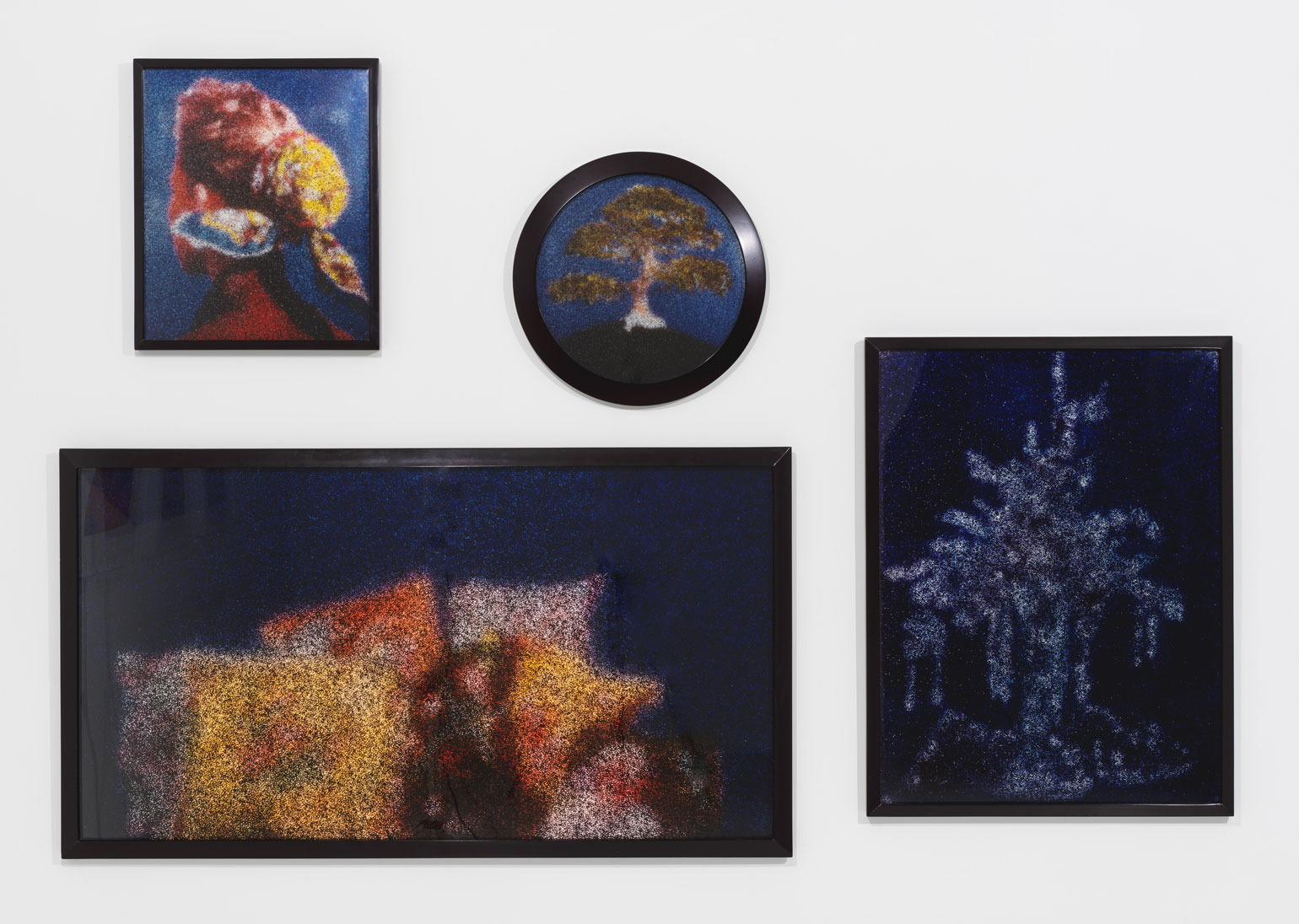 While her tableaux question the veracity of portraiture, Brooks has experimented with additional modes of intervention that foreground entanglements between the photographic image and material world. In a process beginning in 1986, and in evidence within the constellation of framed cibachrome prints comprising the multi-partite work Blue Container (1987), she would re-photograph magazine and theme calendar imagery painted over and imaged through a black screen, anticipating methods of digital filters and layering. In a selective logic focused on images complicit in cultural appropriation and contrived nature, Brooks’ self-reflexive critique of photographic repackaging, an apparatus dually seen and seen-through, is communicated through a formal language of crystalline composites of color, atmospheric visual fields, the vestigial tactility of analog procedures, and a patently inaccurate, generalized appearance.