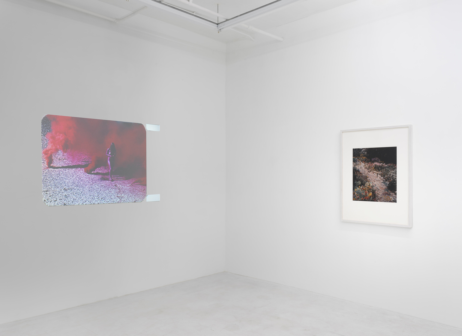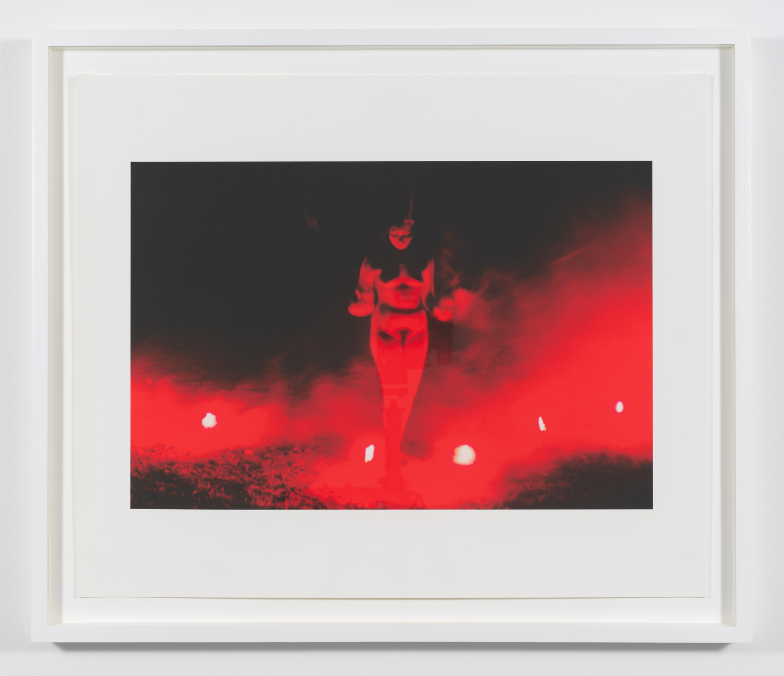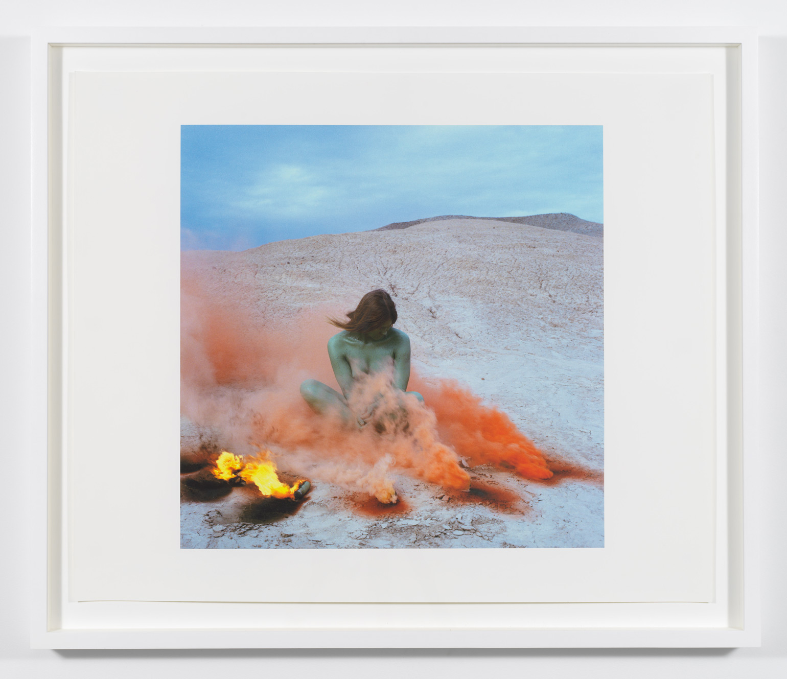 Countering the ubiquitous masculinist ethos of contemporaneous diesel-fueled Earth Art and hot-rodded West-Coast minimalism, Judy Chicago executed a series of site-specific performances involving increasingly complex activations of colored smoke with fireworks, dry ice, and flares – demilitarized technologies subverted by a pacific if also weaponized feminism – from 1968 to 1974. Entitled Atmospheres, these networks of timely, telluric actions intended to introduce a feminine impulse into the environment, liberate color into the air, and manifest women-centered actions such as the worship of goddess figures and the kindling of fire. Sustaining the history of these atmospheric interventions, her archival video Women and Smoke (1971-72) documents nine of her iconic early feminist performances, and is accompanied in the exhibition by three prints originating in this significant historical source: Goddess with Flares II, Immolation IV, and Smoke Bodies III (all works 1972).