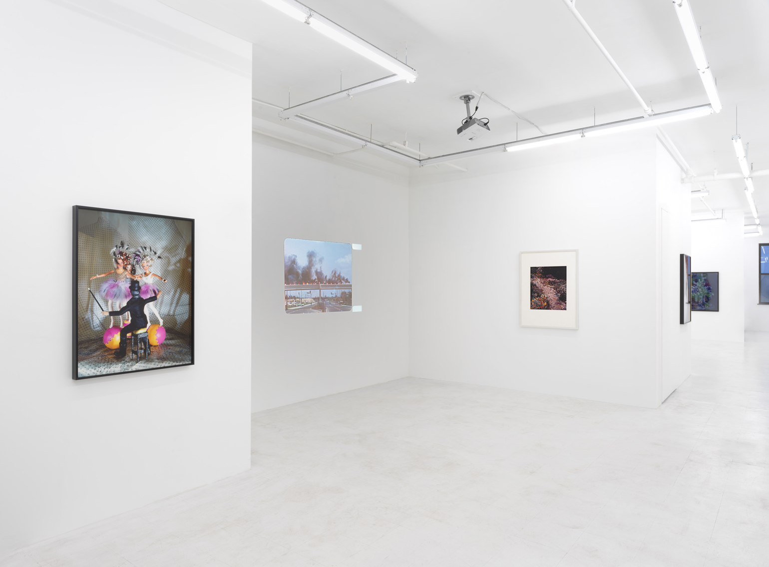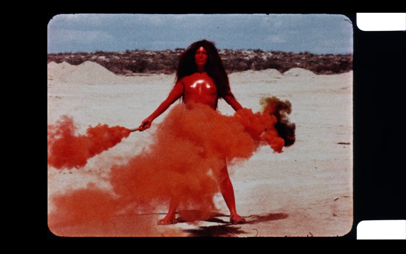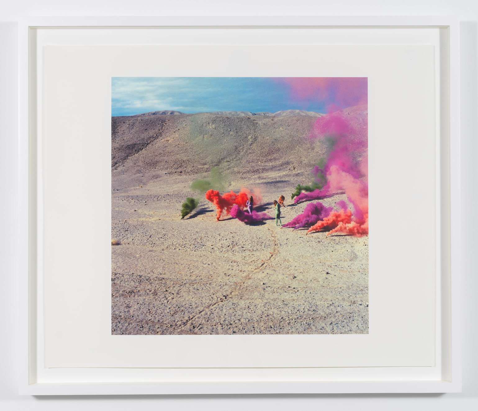 Countering the ubiquitous masculinist ethos of contemporaneous diesel-fueled Earth Art and hot-rodded West-Coast minimalism, Judy Chicago executed a series of site-specific performances involving increasingly complex activations of colored smoke with fireworks, dry ice, and flares – demilitarized technologies subverted by a pacific if also weaponized feminism – from 1968 to 1974. Entitled Atmospheres, these networks of timely, telluric actions intended to introduce a feminine impulse into the environment, liberate color into the air, and manifest women-centered actions such as the worship of goddess figures and the kindling of fire. Sustaining the history of these atmospheric interventions, her archival video Women and Smoke (1971-72) documents nine of her iconic early feminist performances, and is accompanied in the exhibition by three prints originating in this significant historical source: Goddess with Flares II, Immolation IV, and Smoke Bodies III (all works 1972).