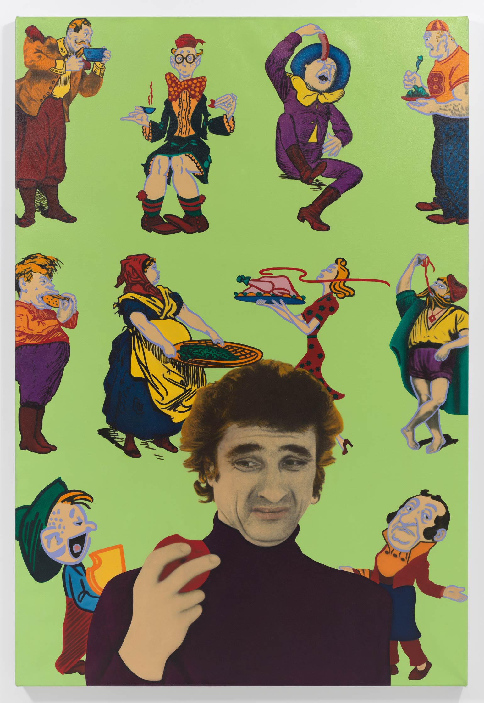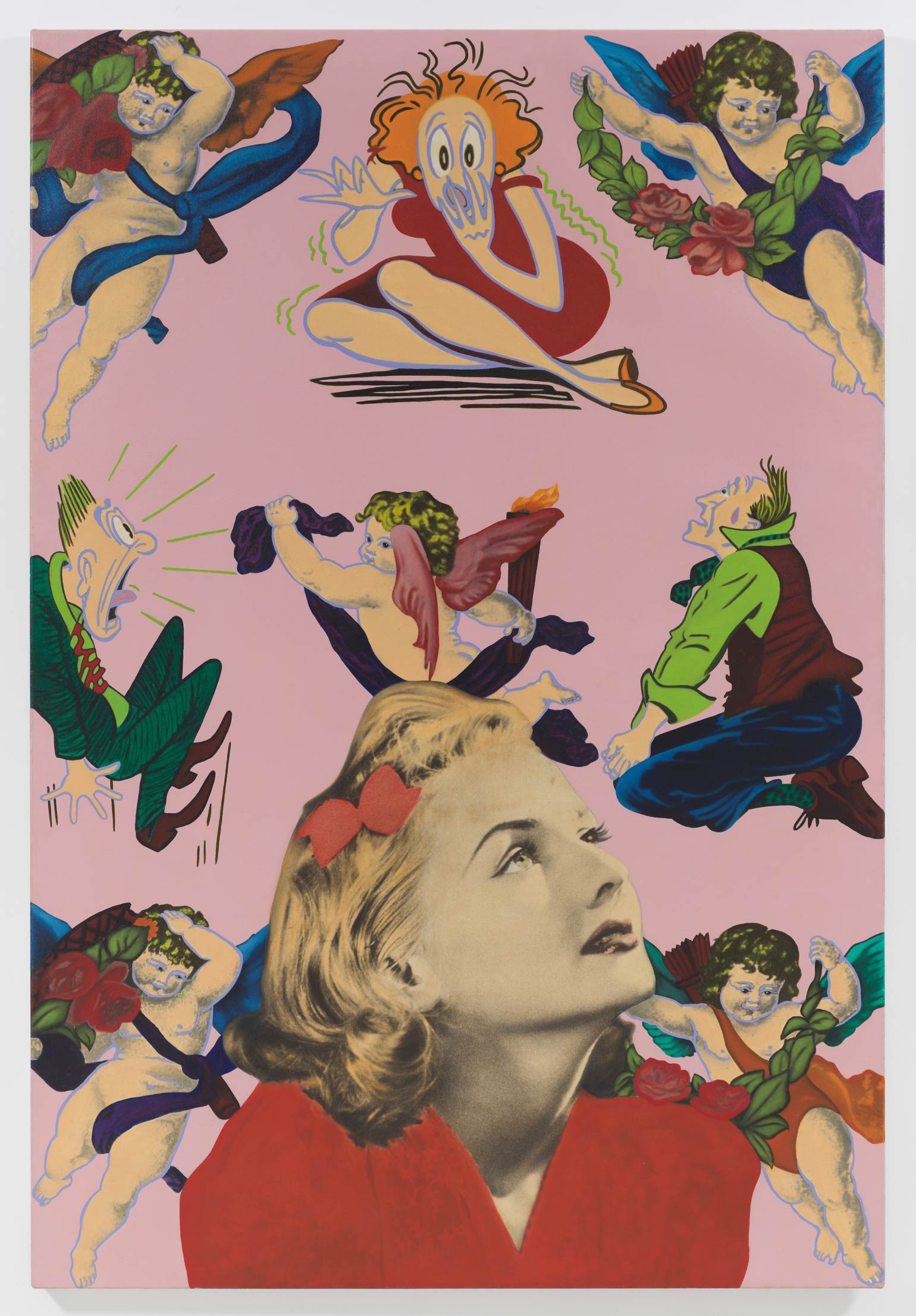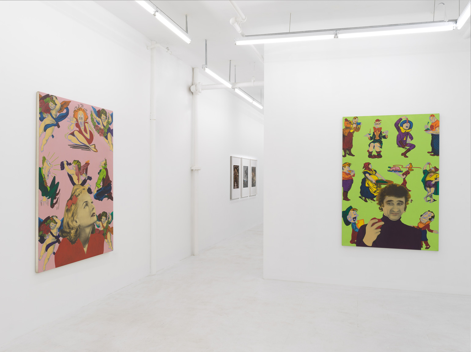 First presented in the exhibition “Cady Noland, Sam Samore, Karen Sylvester,” curated by Thea Westreich, at Galerie Max Hetzler, Cologne (1990), two untitled 1990 paintings by Karen Sylvester unite photo emulsions and oil on canvas, working counter to the specificity of each medium. Rendered in oils, photographic imagery – annexed from the archives of the New York Public Library – shakes off tethers to objectivity; meanwhile, the expressive potential of painting is complicated by its conscription to mechanical reproduction. In an unwound celluloid ambience evoking theretofore unprecedented rates of image exchange, staccato bursts of action by appropriated cartoon figures bombard precariously displaced solo portraits. In these wry illustrations of female labor and hysteria amid male consumption, a sense of nerve-frayed anomie and synthetic placelessness coordinates feminist perspectives with post-medial positions.