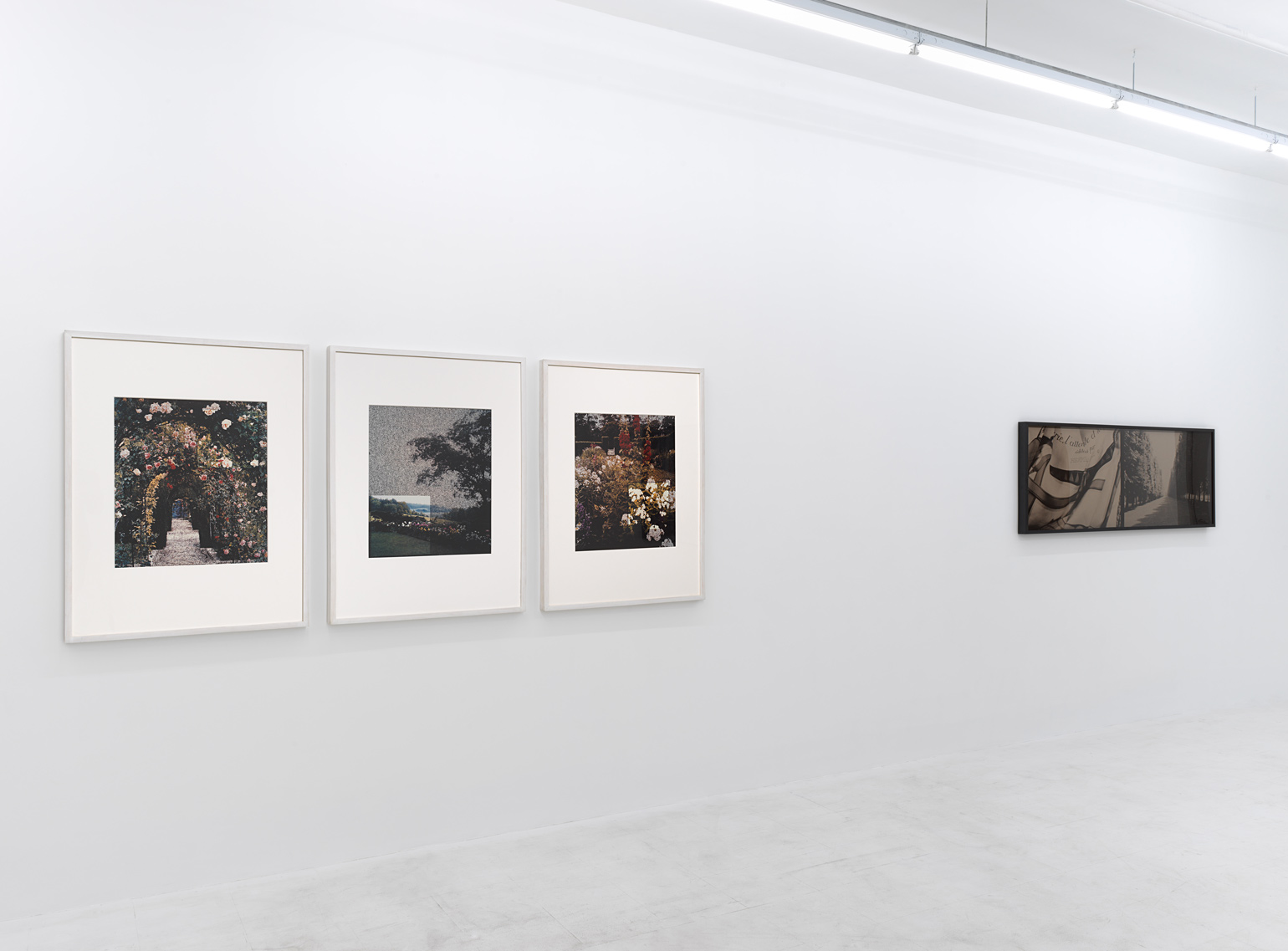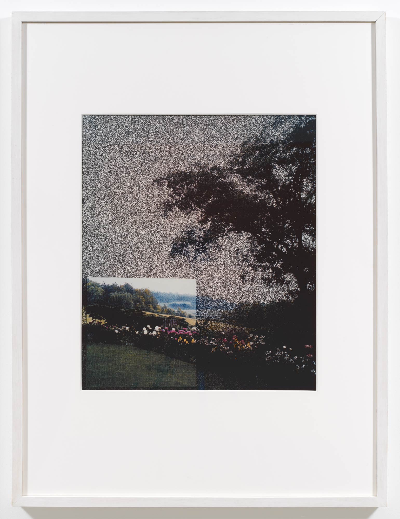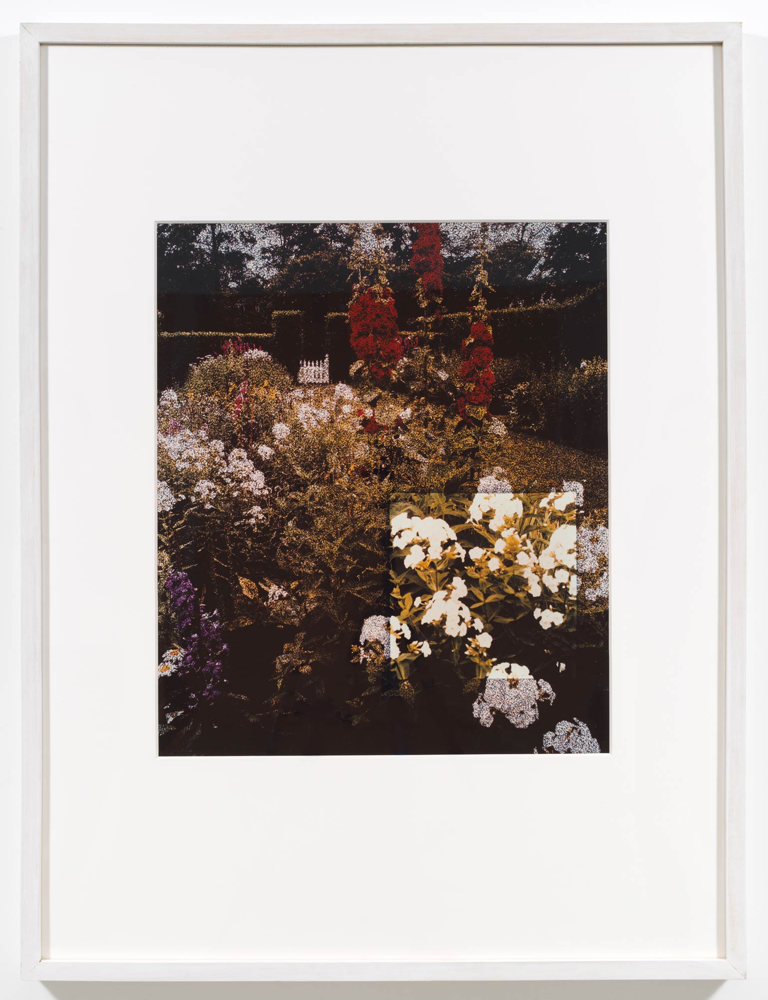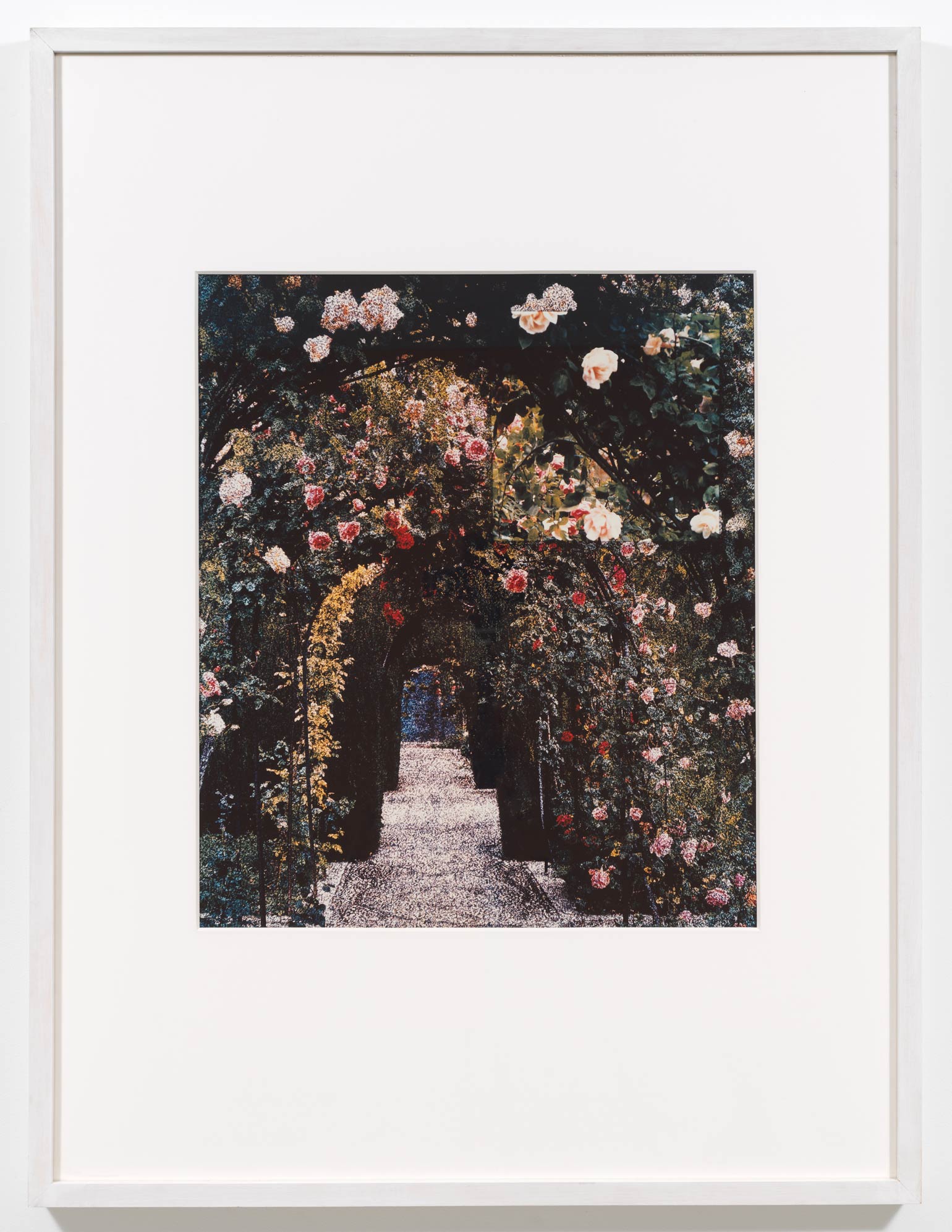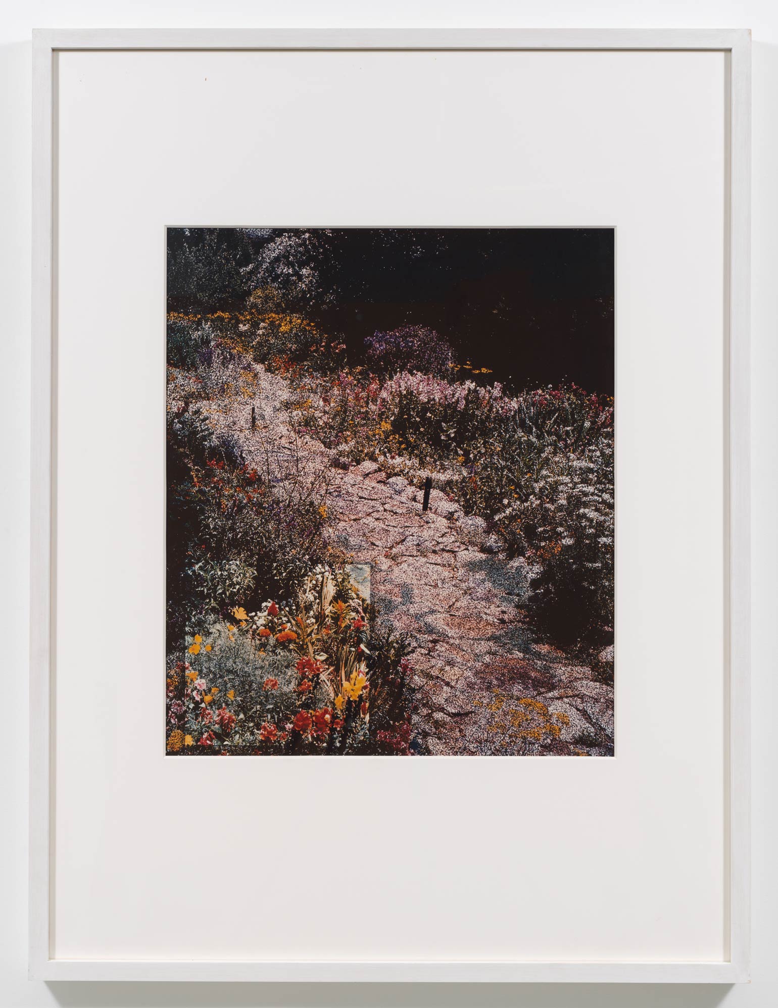 The unique Polacolor prints, Hill and Dale (American Gardens #14), Pink Path (American Gardens #2), Rose Arbor (American Gardens #5), and White Phlox (American Gardens #9), were produced collaboratively by Vikky Alexander and Ellen Brooks at the invitation of the Polaroid Corporation’s film laboratory on Broadway in 1990. Emblematic of the artists’ American Gardens series, the works combine the artists’ modes of re-photography, spatial inquiry, and material intervention. Each print merges two separate 4×5 slide transparencies: (i) an appropriated image of an American garden and (ii) a painted dot-screen patterned mesh. Deciding where a seemingly arbitrary cut would be made in the latter, and thus interrupting its seemingly pointillist surface, a clearer zone emerges to replicate the pre-photographic formulation of focal points within a formal garden – historicizing aesthetic interventions into site as critiques of correlations between perspective and power. The inherent singularity of Polacolor prints spotlights the real-time role of spectatorial position in a phenomenological engagement with photographic materiality.