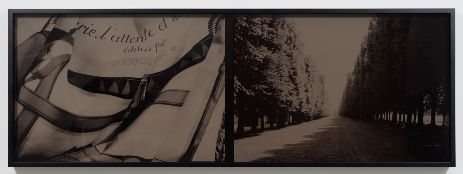 Emphasizing the physical materiality of images in space through techniques of fragmentation, superimposition and augmented reflectivity, Vikky Alexander’s formative contributions to Pictures era strategies of appropriation underscore the mediated nature of documented experience as well as the contingencies and complicities inherent in the process of viewing. Recognized for her images of romanticized nature and naturalized romance addressing the synthesis of female and natural ideals through public sources, Hermes/Herrenhausen (1985/2017) comprises her first composition to incorporate two original photographs of luxury and landscape: a gifted Hermes scarf and the formal garden of the palace at Herrenhausen in Hannover, Germany. Elliptically diaristic, the work exploits the distance between explicit forms of commercial representation and a guarded cipher of familial experience.