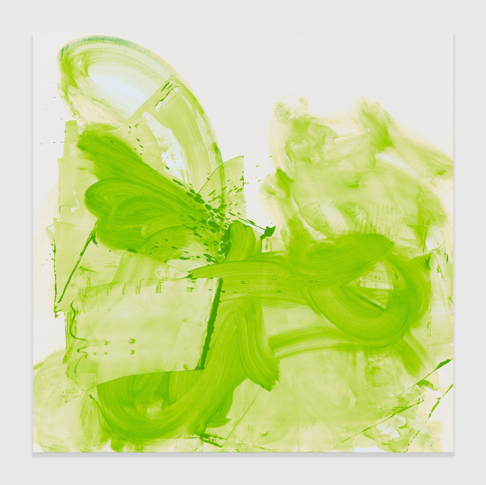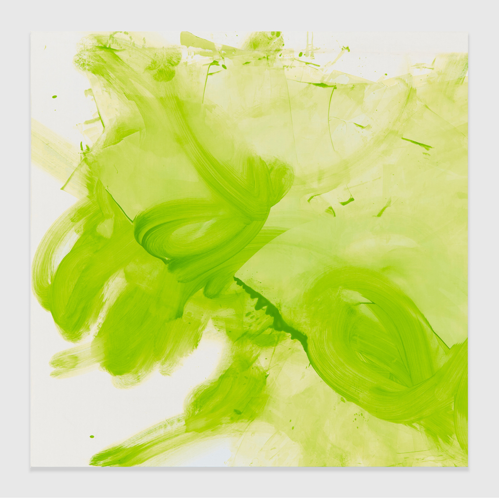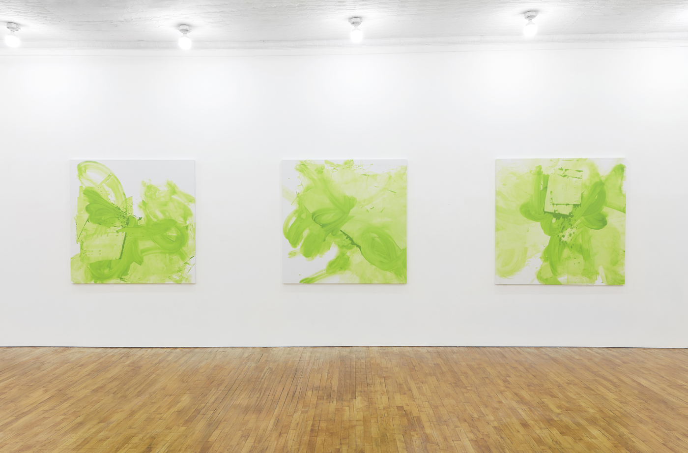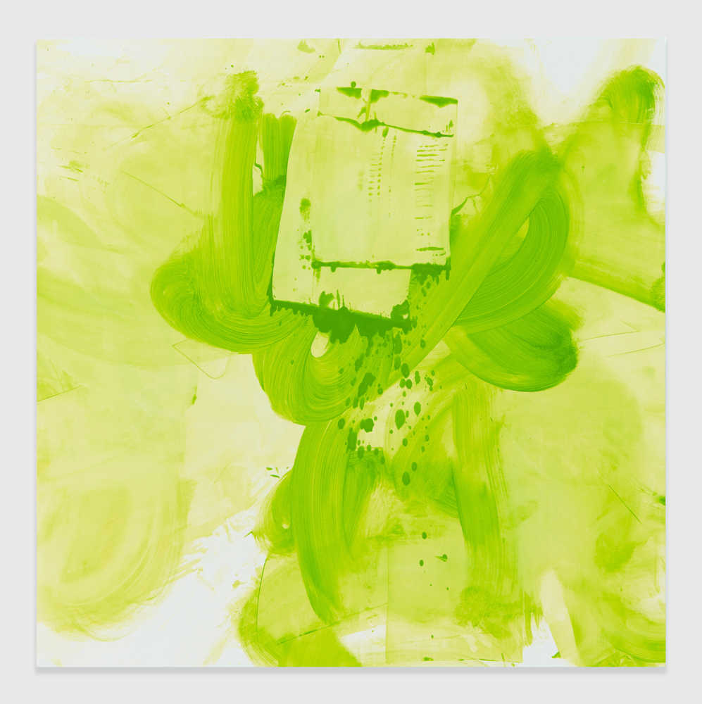 Representational subversions abound in this new suite of works, which builds out the artist’s style to embrace more preternatural hues, such as chartreuse, which appears in varyingly transparent licks and splatters in Burnt Out! Green 1, 2, and 3 (all works 2024). The insistence of the vibrant, monochromatic swathes backed onto lightbox-like, neutralizing gesso calls into question what can be visually compelling, what can be beautiful, and what can be considered a “fast image.”