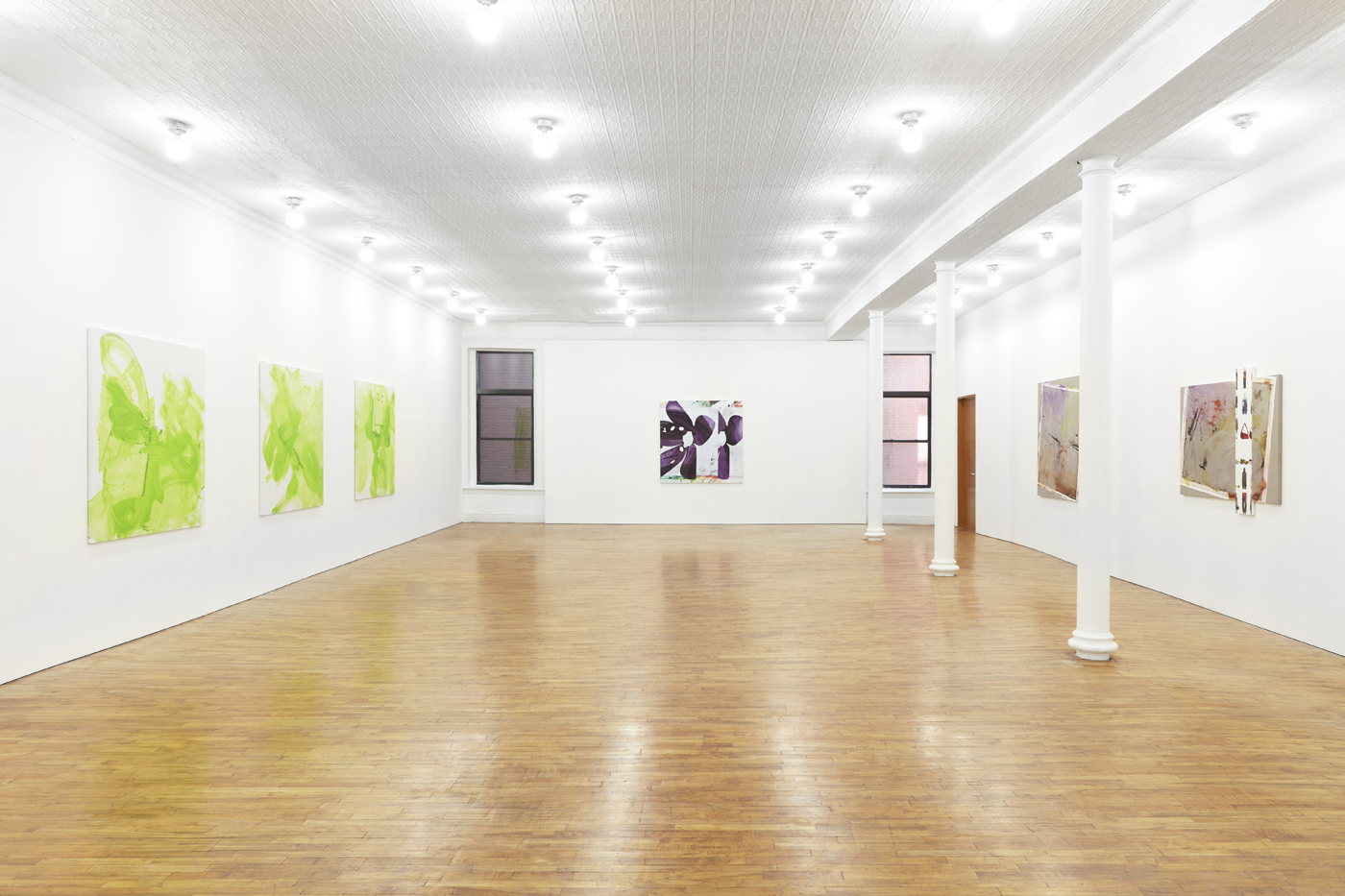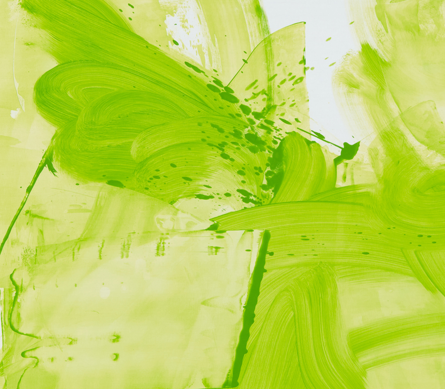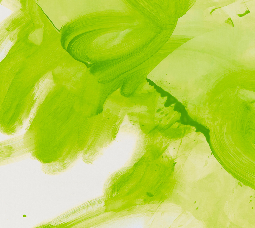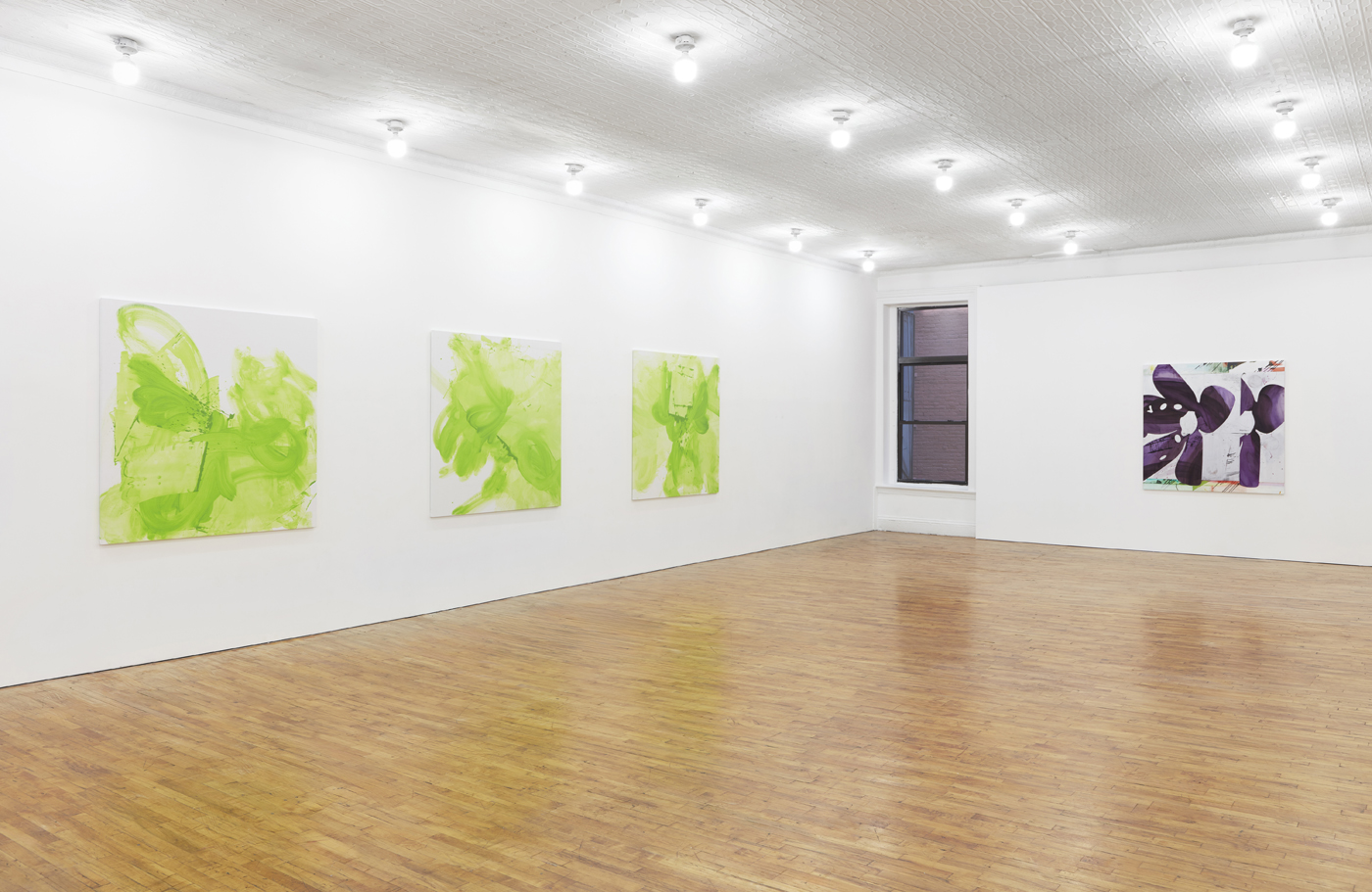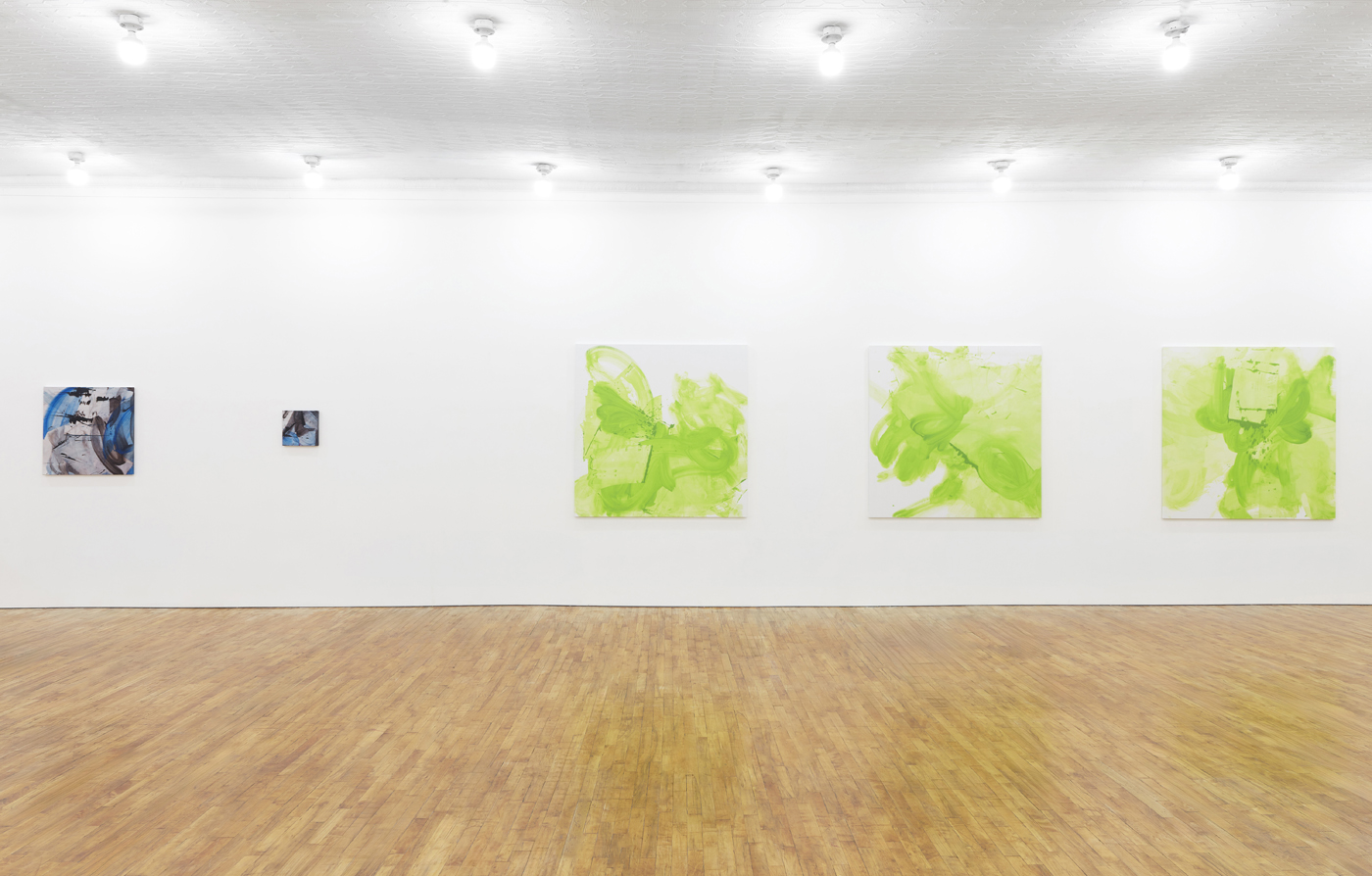Representational subversions abound in this new suite of works, which builds out the artist’s style to embrace more preternatural hues, such as chartreuse, which appears in varyingly transparent licks and splatters in Burnt Out! Green 1, 2, and 3 (all works 2024). The insistence of the vibrant, monochromatic swathes backed onto lightbox-like, neutralizing gesso calls into question what can be visually compelling, what can be beautiful, and what can be considered a “fast image.”
