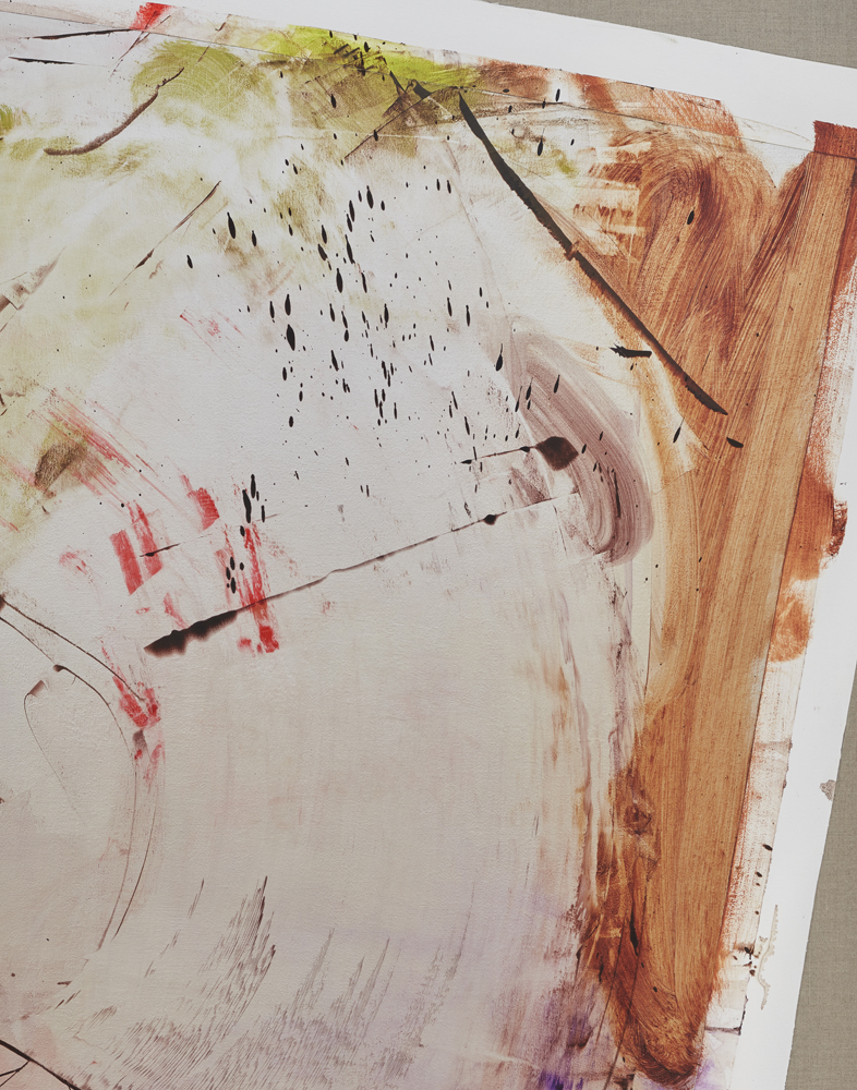Certainly, Dennison’s well-rehearsed canon of brushstrokes—squeegee tugs, rag smears, palette knife smudges, hog hair daubs, turpentine-wetted washes, wipes, pours, pools, and deletions—is suggestive of her presence, as if it has been imbued into the very fibers of the canvases. But there is a latent tension between the logic through which Dennison applies paint, and the motifs realized by these applications.