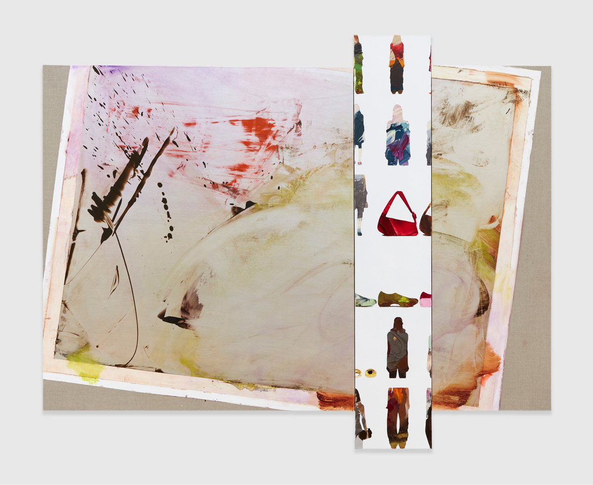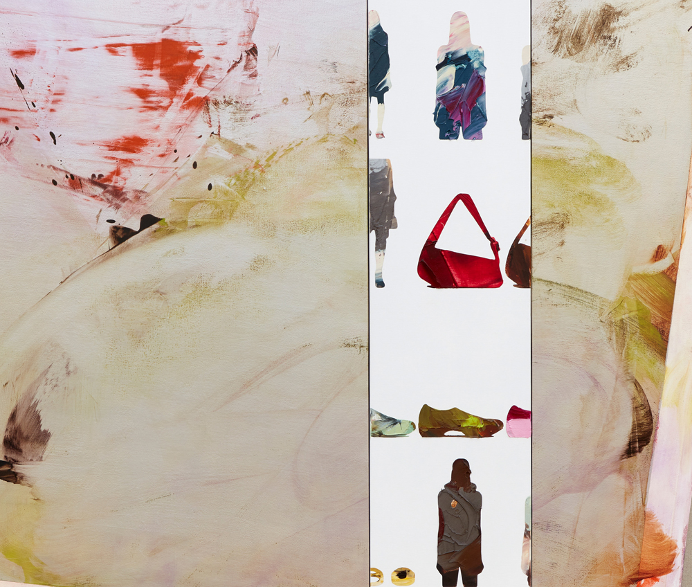 This phenomenon is exemplified by the bisecting E-comm paintings, which depict the appropriated silhouettes of ubiquitous fashion garments in thick, swirling impasto against blank, flat backgrounds comparable to the screens we scroll absent-mindedly. Three senses—of the interruption of the gesture of scrolling, of automatic contemplation, and of the further possibility of the digital image as both signifier and readymade—are invoked by these compositions.