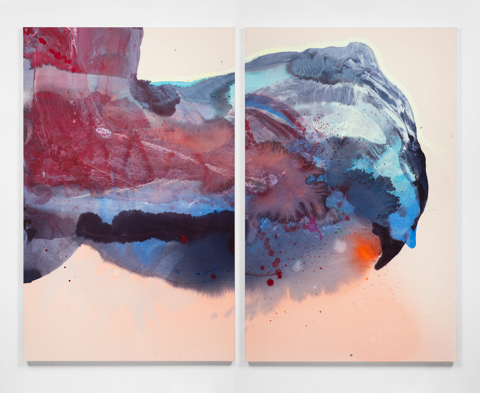 Ragna Bley, Electric Rind, 2021. Acrylic on sailcloth (diptych), 59 × 37 1/2 inches / 150 x 95,2 cm (each), 59 × 77 inches / 150 × 195,6 cm (total)
